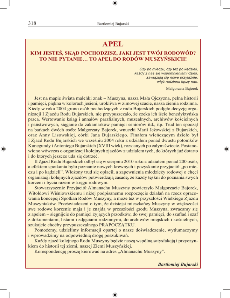 318 Bartłomiej Bujarski APEL KIM JESTEŚ, SKĄD POCHODZISZ, JAKI JEST TWÓJ RODOWÓD? TO NIE PYTANIE… TO APEL DO RODÓW MUSZYŃSKICH! Czy po mieczu, czy też po kądzieli, każdy z nas się wspomnieniami dzieli, zawiązują się nowe przyjaźnie, więź rodzinna łączy nas. Małgorzata Bajorek Jest na mapie świata maleńki znak – Muszyna, nasza Mała Ojczyzna, pełna historii i pamięci, piękna w kolorach jesieni, urokliwa w zimowej szacie, nasza ziemia rodzinna. Kiedy w roku 2004 grono osób pochodzących z rodu Bujarskich podjęło decyzję organizacji I Zjazdu Rodu Bujarskich, nie przypuszczało, że czeka ich iście benedyktyńska praca. Wertowanie ksiąg i annałów parafialnych, muzealnych, archiwów kościelnych i państwowych, sięganie do zakamarków pamięci seniorów itd., itp. Trud ten spoczął na barkach dwóch osób: Małgorzaty Bajorek, wnuczki Marii Jeżowskiej z Bujarskich, oraz Anny Lisowskiej, córki Jana Bujarskiego. Finałem wieńczącym dzieło był I Zjazd Rodu Bujarskich we wrześniu 2004 roku z udziałem ponad dwustu potomków Kunegundy i Antoniego Bujarskich (XVIII wiek), rozsianych po całym świecie. Postanowiono wówczas o organizacji kolejnych zjazdów z udziałem tych, do których już dotarto i do których jeszcze uda się dotrzeć. II Zjazd Rodu Bujarskich odbył się w sierpniu 2010 roku z udziałem ponad 200 osób, a efektem spotkania było poznanie nowych krewnych i pozyskanie przyjaciół „po mieczu i po kądzieli”. Włożony trud się opłacił, a zapewnienia młodzieży rodowej o chęci organizacji kolejnych zjazdów potwierdzają zasadę, że każdy tęskni do poznania swych korzeni i bycia razem w kręgu rodowym. Stowarzyszenie Przyjaciół Almanachu Muszyny powierzyło Małgorzacie Bajorek, Witoldowi Wiśniowskiemu i niżej podpisanemu rozpoczęcie działań na rzecz opracowania koncepcji Spotkań Rodów Muszyny, a może też w przyszłości Wielkiego Zjazdu Muszyniaków. Przeświadczeni o tym, że dzisiejsi mieszkańcy Muszyny w większości swe rodowe korzenie mają i je znajdą w przeszłości grodu Muszyna, zwracamy się z apelem – sięgnijcie do pamięci żyjących przodków, do swej pamięci, do szuflad i szaf z dokumentami, listami i zdjęciami rodzinnymi, do archiwów miejskich i kościelnych, szukajcie choćby przypuszczalnego PRAPOCZĄTKU. Pomożemy, udzielimy informacji opartej o nasze doświadczenie, wytłumaczymy i wprowadzimy na odpowiednią drogę poszukiwań. Każdy zjazd kolejnego Rodu Muszyny będzie naszą wspólną satysfakcją i przyczynkiem do historii tej ziemi, naszej Ziemi Muszyńskiej. Korespondencję proszę kierować na adres „Almanachu Muszyny”. Bartłomiej Bujarski