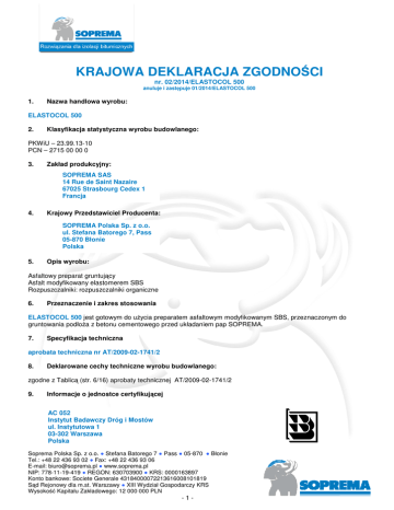 KRAJOWA DEKLARACJA ZGODNOŚCI nr. 02/2014/ELASTOCOL 500 anuluje i zastępuje 01/2014/ELASTOCOL 500 1. Nazwa handlowa wyrobu: ELASTOCOL 500 2. Klasyfikacja statystyczna wyrobu budowlanego: PKWiU – 23.99.13-10 PCN – 2715 00 00 0 3. Zakład produkcyjny: SOPREMA SAS 14 Rue de Saint Nazaire 67025 Strasbourg Cedex 1 Francja 4. Krajowy Przedstawiciel Producenta: SOPREMA Polska Sp. z o.o. ul. Stefana Batorego 7, Pass 05-870 Błonie Polska 5. Opis wyrobu: Asfaltowy preparat gruntujący Asfalt modyfikowany elastomerem SBS Rozpuszczalniki: rozpuszczalniki organiczne 6. Przeznaczenie i zakres stosowania ELASTOCOL 500 jest gotowym do użycia preparatem asfaltowym modyfikowanym SBS, przeznaczonym do gruntowania podłoża z betonu cementowego przed układaniem pap SOPREMA. 7. Specyfikacja techniczna aprobata techniczna nr AT/2009-02-1741/2 8. Deklarowane cechy techniczne wyrobu budowlanego: zgodne z Tablicą (str. 6/16) aprobaty technicznej AT/2009-02-1741/2 9. Informacje o jednostce certyfikującej AC 052 Instytut Badawczy Dróg i Mostów ul. Instytutowa 1 03-302 Warszawa Polska Soprema Polska Sp. z o.o. ● Stefana Batorego 7 ● Pass ● 05-870 ● Błonie Tel.: +48 22 436 93 02 ● Fax: +48 22 436 93 06 E-mail: [email protected] ● www.soprema.pl NIP: 778-11-19-419 ● REGON: 630703900 ● KRS: 0000163897 Konto bankowe: Societe Generale 43184000072213616008101819 Sąd Rejonowy dla m.st. Warszawy ● XIII Wydział Gospodarczy KRS Wysokość Kapitału Zakładowego: 12 000 000 PLN -1- Deklaruję z pełną odpowiedzialnością, że w/w wyrób jest zgodny z dokumentami odnisienia wymienionymi w pkt. 7 Pass, dnia 28.07.2014 roku (miejsce i data wystawienia) (imię, nazwisko i podpis osoby upoważnionej) Soprema Polska Sp. z o.o. ● Stefana Batorego 7 ● Pass ● 05-870 ● Błonie Tel.: +48 22 436 93 02 ● Fax: +48 22 436 93 06 E-mail: [email protected] ● www.soprema.pl NIP: 778-11-19-419 ● REGON: 630703900 ● KRS: 0000163897 Konto bankowe: Societe Generale 43184000072213616008101819 Sąd Rejonowy dla m.st. Warszawy ● XIII Wydział Gospodarczy KRS Wysokość Kapitału Zakładowego: 12 000 000 PLN -2-