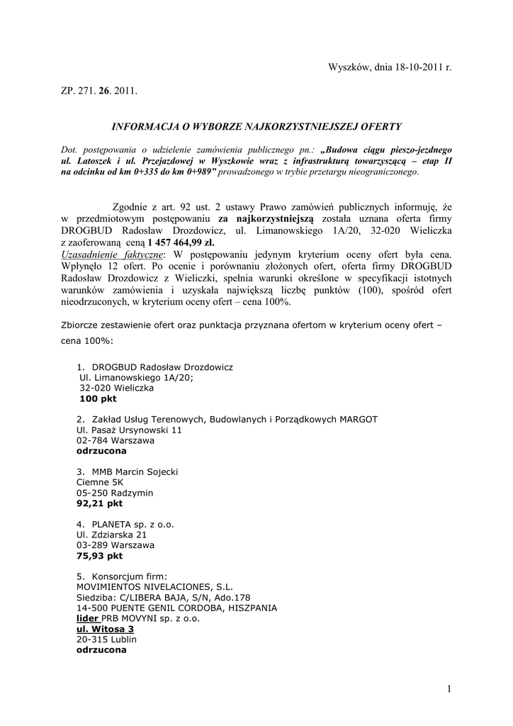 Wyszków, dnia 18-10-2011 r. ZP. 271. 26. 2011. INFORMACJA O WYBORZE NAJKORZYSTNIEJSZEJ OFERTY Dot. postępowania o udzielenie zamówienia publicznego pn.: „Budowa ciągu pieszo-jezdnego ul. Latoszek i ul. Przejazdowej w Wyszkowie wraz z infrastrukturą towarzyszącą – etap II na odcinku od km 0+335 do km 0+989” prowadzonego w trybie przetargu nieograniczonego. Zgodnie z art. 92 ust. 2 ustawy Prawo zamówień publicznych informuję, Ŝe w przedmiotowym postępowaniu za najkorzystniejszą została uznana oferta firmy DROGBUD Radosław Drozdowicz, ul. Limanowskiego 1A/20, 32-020 Wieliczka z zaoferowaną ceną 1 457 464,99 zł. Uzasadnienie faktyczne: W postępowaniu jedynym kryterium oceny ofert była cena. Wpłynęło 12 ofert. Po ocenie i porównaniu złoŜonych ofert, oferta firmy DROGBUD Radosław Drozdowicz z Wieliczki, spełnia warunki określone w specyfikacji istotnych warunków zamówienia i uzyskała największą liczbę punktów (100), spośród ofert nieodrzuconych, w kryterium oceny ofert – cena 100%. Zbiorcze zestawienie ofert oraz punktacja przyznana ofertom w kryterium oceny ofert – cena 100%: 1. DROGBUD Radosław Drozdowicz Ul. Limanowskiego 1A/20; 32-020 Wieliczka 100 pkt 2. Zakład Usług Terenowych, Budowlanych i Porządkowych MARGOT Ul. PasaŜ Ursynowski 11 02-784 Warszawa odrzucona 3. MMB Marcin Sojecki Ciemne 5K 05-250 Radzymin 92,21 pkt 4. PLANETA sp. z o.o. Ul. Zdziarska 21 03-289 Warszawa 75,93 pkt 5. Konsorcjum firm: MOVIMIENTOS NIVELACIONES, S.L. Siedziba: C/LIBERA BAJA, S/N, Ado.178 14-500 PUENTE GENIL CORDOBA, HISZPANIA lider PRB MOVYNI sp. z o.o. ul. Witosa 3 20-315 Lublin odrzucona 1 6.Zakład Usług Techniczno-Handlowych EKO-BUD Eugeniusz Pogorzelski ul. Serocka 32a/1 07-200 Wyszków 86,39 pkt 7. Królik Włodzimierz KROL Zakład Robót Drogowych i InŜynieryjno-Instalacyjnych Ul. Łukasiewicza 9G 05-200 Wołomin 83,27 pkt 8. Firma Handlowo-Usługowa ITC Angelika Jabłońska Baruchowo 8A 87-821 Baruchowo odrzucona 9. Konsorcjum firm: lider POL-DRÓG WARSZAWA sp. z o.o. Ul. Arkuszowa 7; 01-934 Warszawa POL-DRÓG PIŁA sp. z o.o. Ul. Wawelska 106 84-920 Piła 61,87 pkt 10. Konsorcjum firm: lider Przedsiębiorstwo Produkcyjno-Handlowe Krzysztof Falba Latoszek 55; 07-201 Wyszków DROGOWIEC Maciej Wacław Wojtaszek s.c. Ul. 1 Maja 9/58; 07-202 Wyszków odrzucona 11. Spółdzielnia Robót Budowlano-Drogowych Ul. Zaściankowa 1 05-240 Tłuszcz 94,19 pkt 12. MULTI-KOM Andrzej Nakielski Ul. 6 Września 12 07-409 Ostrołęka odrzucona Burmistrz Wyszkowa Grzegorz Nowosielski 2