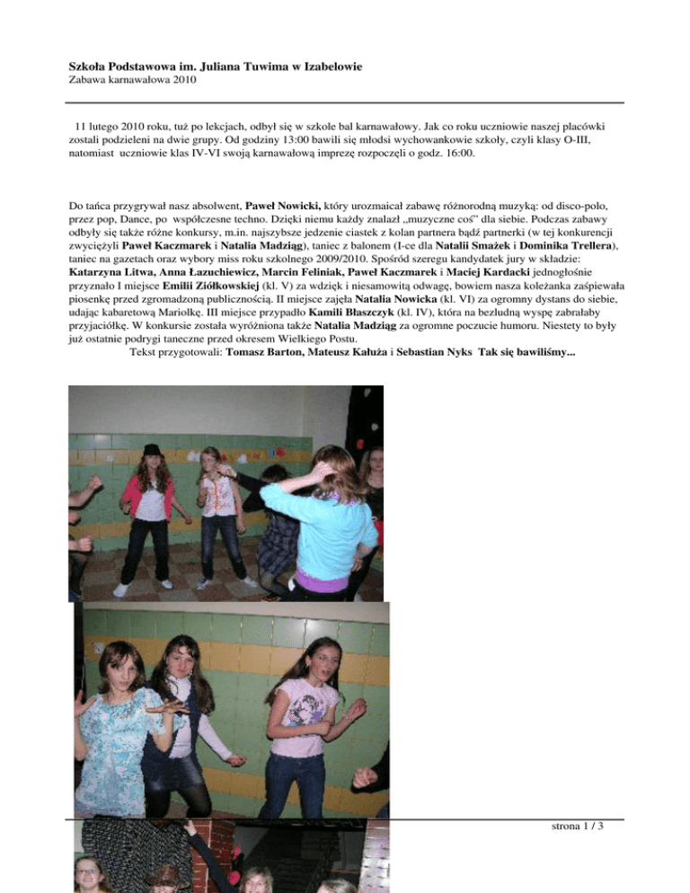 Szkoła Podstawowa im. Juliana Tuwima w Izabelowie Zabawa karnawałowa 2010 11 lutego 2010 roku, tuż po lekcjach, odbył się w szkole bal karnawałowy. Jak co roku uczniowie naszej placówki zostali podzieleni na dwie grupy. Od godziny 13:00 bawili się młodsi wychowankowie szkoły, czyli klasy O-III, natomiast uczniowie klas IV-VI swoją karnawałową imprezę rozpoczęli o godz. 16:00. Do tańca przygrywał nasz absolwent, Paweł Nowicki, który urozmaicał zabawę różnorodną muzyką: od disco-polo, przez pop, Dance, po współczesne techno. Dzięki niemu każdy znalazł „muzyczne coś” dla siebie. Podczas zabawy odbyły się także różne konkursy, m.in. najszybsze jedzenie ciastek z kolan partnera bądź partnerki (w tej konkurencji zwyciężyli Paweł Kaczmarek i Natalia Madziąg), taniec z balonem (I-ce dla Natalii Smażek i Dominika Trellera), taniec na gazetach oraz wybory miss roku szkolnego 2009/2010. Spośród szeregu kandydatek jury w składzie: Katarzyna Litwa, Anna Łazuchiewicz, Marcin Feliniak, Paweł Kaczmarek i Maciej Kardacki jednogłośnie przyznało I miejsce Emilii Ziółkowskiej (kl. V) za wdzięk i niesamowitą odwagę, bowiem nasza koleżanka zaśpiewała piosenkę przed zgromadzoną publicznością. II miejsce zajęła Natalia Nowicka (kl. VI) za ogromny dystans do siebie, udając kabaretową Mariolkę. III miejsce przypadło Kamili Błaszczyk (kl. IV), która na bezludną wyspę zabrałaby przyjaciółkę. W konkursie została wyróżniona także Natalia Madziąg za ogromne poczucie humoru. Niestety to były już ostatnie podrygi taneczne przed okresem Wielkiego Postu. Tekst przygotowali: Tomasz Barton, Mateusz Kałuża i Sebastian Nyks Tak się bawiliśmy... strona 1 / 3 Szkoła Podstawowa im. Juliana Tuwima w Izabelowie Zabawa karnawałowa 2010 Konkurs jedzenia ciastek z kolan partnera/partnerki Wybory miss roku szkolnego 2009/2010 strona 2 / 3 Szkoła Podstawowa im. Juliana Tuwima w Izabelowie Zabawa karnawałowa 2010 I-ce: Emilia Ziółkowska (kl.V) III-ce: Kamila Błaszczyk (kl. IV) II-ce: Natalia Nowicka (kl. VI) Wyróżnienie: Natalia Madziąg (kl. VI) strona 3 / 3