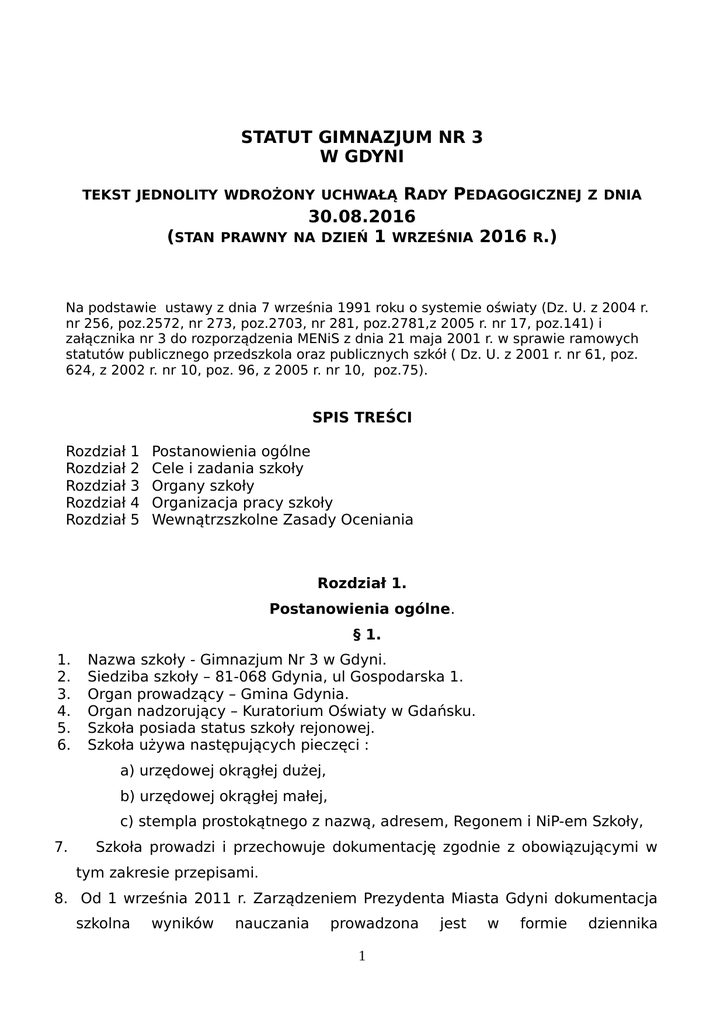 STATUT GIMNAZJUM NR 3 W GDYNI RADY PEDAGOGICZNEJ 30.08.2016 NA DZIEŃ 1 WRZEŚNIA 2016 R.) TEKST JEDNOLITY WDROŻONY UCHWAŁĄ (STAN PRAWNY Z DNIA Na podstawie ustawy z dnia 7 września 1991 roku o systemie oświaty (Dz. U. z 2004 r. nr 256, poz.2572, nr 273, poz.2703, nr 281, poz.2781,z 2005 r. nr 17, poz.141) i załącznika nr 3 do rozporządzenia MENiS z dnia 21 maja 2001 r. w sprawie ramowych statutów publicznego przedszkola oraz publicznych szkół ( Dz. U. z 2001 r. nr 61, poz. 624, z 2002 r. nr 10, poz. 96, z 2005 r. nr 10, poz.75). SPIS TREŚCI Rozdział Rozdział Rozdział Rozdział Rozdział 1 2 3 4 5 Postanowienia ogólne Cele i zadania szkoły Organy szkoły Organizacja pracy szkoły Wewnątrzszkolne Zasady Oceniania Rozdział 1. Postanowienia ogólne. § 1. 1. 2. 3. 4. 5. 6. Nazwa szkoły - Gimnazjum Nr 3 w Gdyni. Siedziba szkoły – 81-068 Gdynia, ul Gospodarska 1. Organ prowadzący – Gmina Gdynia. Organ nadzorujący – Kuratorium Oświaty w Gdańsku. Szkoła posiada status szkoły rejonowej. Szkoła używa następujących pieczęci : a) urzędowej okrągłej dużej, b) urzędowej okrągłej małej, c) stempla prostokątnego z nazwą, adresem, Regonem i NiP-em Szkoły, 7. Szkoła prowadzi i przechowuje dokumentację zgodnie z obowiązującymi w tym zakresie przepisami. 8. Od 1 września 2011 r. Zarządzeniem Prezydenta Miasta Gdyni dokumentacja szkolna wyników nauczania prowadzona 1 jest w formie dziennika elektronicznego, zgodnie z rozporządzeniem MEN o prowadzeniu dokumentacji szkolnej. Dziennik obowiązuje w oparciu o Regulamin Funkcjonowania Dziennika Elektronicznego w Gimnazjum Nr 3 w Gdyni. Od 1 września 2012 r. decyzją Prezydenta Miasta Gdyni wprowadzono dziennik elektroniczny „Comarch”. Od 1 września 2014 r. dziennik elektroniczny „Comarch” jest dostępny dla uczniów oraz rodziców. 9. Budynek szkolny objęty jest monitoringiem w celach informacyjnych oraz w celu podniesienia bezpieczeństwa uczniów. § 2. 1. Ilekroć w statucie jest mowa o Szkole, należy przez to rozumieć Gimnazjum nr 3 w Gdyni. 2. Szkoła jest programową i organizacyjną podstawą systemu oświatowego w Rzeczypospolitej Polskiej do realizacji konstytucyjnego prawa do kształcenia, wychowania i opieki. 3. Szkoła kieruje się zasadami zawartymi w konstytucji Rzeczypospolitej Polski, wskazaniami zawartymi w Powszechnej Deklaracji Praw Człowieka oraz Międzynarodowej Konwencji Praw Dziecka. 4. Szkoła dąży do zapewnienia wszystkim uczniom elementarnego wykształcenia i wychowania zgodnie z uniwersalnymi zasadami etyki oraz rozwoju w poczuciu bezpieczeństwa. 5. Szkoła jest instytucją świecką, respektującą chrześcijański system wartości. 6. Nauka w szkole jest obowiązkowa i bezpłatna. 7. Szkoła prowadzi pracę wychowawczą i opiekuńczą określoną w Programie Wychowawczym Szkoły i Programie Profilaktyki. 8. Podstawowymi formami działalności dydaktyczno-wychowawczej szkoły są: a. obowiązkowe zajęcia edukacyjne, b. dodatkowe zajęcia edukacyjne, c. zajęcia rewalidacyjne dla uczniów niepełnosprawnych, d. zajęcia prowadzone w ramach pomocy psychologiczno-pedagogicznej, e. zajęcia rozwijające zainteresowania i uzdolnienia uczniów. § 3. 1. Szkoła wydaje: świadectwa ukończenia klasy pierwszej i drugiej gimnazjum, ukończenia gimnazjum oraz ich duplikaty, a także inne druki szkolne oraz dokumenty określone odrębnymi przepisami. 2 2. Naukę w gimnazjum kończy się zewnętrznym egzaminem w zakresie przedmiotów humanistycznych, matematyczno-przyrodniczych i języka obcego. Rozdział 2. Cele i zadania szkoły. § 4. 1. Szkoła realizuje cele i określone wyżej wymienionymi programami zadania, w szczególności zaś: a. umożliwia zdobycie wiedzy i umiejętności niezbędnych do kontynuowania dalszego kształcenia, b. dba o wszechstronny rozwój umysłowy, moralny, kulturalny i fizyczny, c. przygotowuje do aktywnego zdobywania i posługiwania się wiedzą, d. wyposaża w zasób wiedzy i umiejętności potrzebnych do odpowiedniego funkcjonowania kształtowania uczniów w stosunków życiu społecznym, międzyludzkich, do do prawidłowego świadomego i odpowiedzialnego spełniania zadań w życiu rodzinnym, społecznym i kulturalnym, e. uczy poszanowania tradycji i kultury narodowej, respektu dla autorytetu i dobrego imienia państwa polskiego, wychowuje uczniów w duchu patriotycznym, f. kształtuje i utrwala zdrowotne wzorce zachowań, g. kształtuje właściwą postawę wobec problemów ekologicznych, h. przygotowuje do korzystania z zasobów informacyjnych współczesnej techniki. 2. Do podstawowych zadań szkoły należy: a. dostosowanie treści, metod i organizacji nauczania do indywidualnych potrzeb psychofizycznych i edukacyjnych ucznia, b. umożliwienie uczniom szczególnie uzdolnionym kontynuowania nauki tokiem indywidualnym oraz ukończenia szkoły w krótszym czasie, c. zapewnienie możliwości pobierania nauki uczniom niepełnosprawnym, niedostosowanym społecznym, społecznie zgodnie z oraz zagrożonym indywidualnymi niedostosowaniem potrzebami rozwojowymi i edukacyjnymi oraz predyspozycjami, d. zapewnienie uczniom, u których stwierdzono zaburzenia i odchylenia rozwojowe lub specyficzne trudności w uczeniu się, szerokiego systemu pomocy i pedagogicznej psychologicznej poprzez zorganizowanie 3 zajęć rewalidacyjnych, korekcyjno pomocy – kompensacyjnych oraz pedagogiczno-psychologicznej organizowanie dla uczniów właściwej o formy specyficznych problemach edukacyjnych, e. organizowanie wewnętrznego systemu doradztwa oraz zajęć związanych z wyborem kierunku kształcenia, f. umożliwienie uczniom podtrzymania poczucia tożsamości narodowej, językowej i religijnej, g. uznając prawo rodziców do religijnego wychowania, szkoła organizuje naukę religii na życzenie rodziców, h. w pracy dydaktyczno-wychowawczej zapewnienie podtrzymania kultury i tradycji regionalnej, i. kształtowanie uniwersalnych wartości wychowania patriotyczn