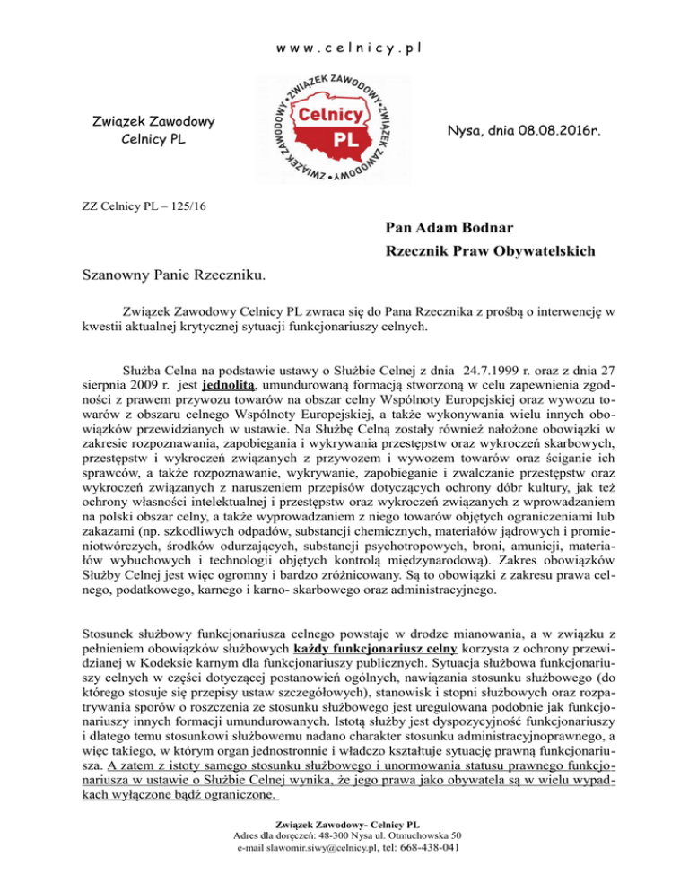 www.celnicy.pl Związek Zawodowy Celnicy PL Nysa, dnia 08.08.2016r. ZZ Celnicy PL – 125/16 Pan Adam Bodnar Rzecznik Praw Obywatelskich Szanowny Panie Rzeczniku. Związek Zawodowy Celnicy PL zwraca się do Pana Rzecznika z prośbą o interwencję w kwestii aktualnej krytycznej sytuacji funkcjonariuszy celnych. Służba Celna na podstawie ustawy o Służbie Celnej z dnia 24.7.1999 r. oraz z dnia 27 sierpnia 2009 r. jest jednolitą, umundurowaną formacją stworzoną w celu zapewnienia zgodności z prawem przywozu towarów na obszar celny Wspólnoty Europejskiej oraz wywozu towarów z obszaru celnego Wspólnoty Europejskiej, a także wykonywania wielu innych obowiązków przewidzianych w ustawie. Na Służbę Celną zostały również nałożone obowiązki w zakresie rozpoznawania, zapobiegania i wykrywania przestępstw oraz wykroczeń skarbowych, przestępstw i wykroczeń związanych z przywozem i wywozem towarów oraz ściganie ich sprawców, a także rozpoznawanie, wykrywanie, zapobieganie i zwalczanie przestępstw oraz wykroczeń związanych z naruszeniem przepisów dotyczących ochrony dóbr kultury, jak też ochrony własności intelektualnej i przestępstw oraz wykroczeń związanych z wprowadzaniem na polski obszar celny, a także wyprowadzaniem z niego towarów objętych ograniczeniami lub zakazami (np. szkodliwych odpadów, substancji chemicznych, materiałów jądrowych i promieniotwórczych, środków odurzających, substancji psychotropowych, broni, amunicji, materiałów wybuchowych i technologii objętych kontrolą międzynarodową). Zakres obowiązków Służby Celnej jest więc ogromny i bardzo zróżnicowany. Są to obowiązki z zakresu prawa celnego, podatkowego, karnego i karno- skarbowego oraz administracyjnego. Stosunek służbowy funkcjonariusza celnego powstaje w drodze mianowania, a w związku z pełnieniem obowiązków służbowych każdy funkcjonariusz celny korzysta z ochrony przewidzianej w Kodeksie karnym dla funkcjonariuszy publicznych. Sytuacja służbowa funkcjonariuszy celnych w części dotyczącej postanowień ogólnych, nawiązania stosunku służbowego (do którego stosuje się przepisy ustaw szczegółowych), stanowisk i stopni służbowych oraz rozpatrywania sporów o roszczenia ze stosunku służbowego jest uregulowana podobnie jak funkcjonariuszy innych formacji umundurowanych. Istotą służby jest dyspozycyjność funkcjonariuszy i dlatego temu stosunkowi służbowemu nadano charakter stosunku administracyjnoprawnego, a więc takiego, w którym organ jednostronnie i władczo kształtuje sytuację prawną funkcjonariusza. A zatem z istoty samego stosunku służbowego i unormowania statusu prawnego funkcjonariusza w ustawie o Służbie Celnej wynika, że jego prawa jako obywatela są w wielu wypadkach wyłączone bądź ograniczone. Związek Zawodowy- Celnicy PL Adres dla doręczeń: 48-300 Nysa ul. Otmuchowska 50 e-mail [email protected], tel: 668-438-041 www.celnicy.pl W dniu 3 marca 2015 r. Trybunał Konstytucyjny skonstatował, że pominięcie funkcjonariuszy Służby Celnej jako osób uprawnionych do świadczeń emerytalnych jest niezgodne z art. 32 Konstytucji W celu usunięcia tej niezgodności, a więc nierównego traktowania funkcjonariuszy celnych w porównaniu do innych służb mundurowych, złożony został projekt obywatelski, dotyczący zmiany ustawy z 18 lutego 1994 r. o zaopatrzeniu emerytalnym funkcjonariuszy Policji, (…) oraz ich rodzin. W dniu 13.07.2016, podczas spotkania Rady Dialogu Społecznego, przedstawicielka Ministerstwa Finansów przekazała stanowisko rządu dot. realizacji wyroku TK i projektu obywatelskiego ws. o zmiany ustawy o zaopatrzeniu emerytalnym funkcjonariuszy Policji, Agencji Bezpieczeństwa Wewnętrznego, Agencji Wywiadu, Służby Kontrwywiadu Wojskowego, Służby Wywiadu Wojskowego, Centralnego Biura Antykorupcyjnego, Straży Granicznej, Biura Ochrony Rządu, Państwowej Straży Pożarnej i Służby Więziennej oraz ich rodzin oraz niektórych innych . Rząd podzielił funkcjonariuszy na tych, którzy powinni zostać uwzględnieni w ww. ustawie emerytalnej i tych, którym według rządu emerytura wcześniejsza się nie należy. Także inaczej niż w innych służbach mundurowych odbywałoby się nabywanie prawa do emerytury, również inaczej niż jest to zapisane w projekcie obywatelskim tj. - f.c. przyjęci do końca 2012 roku licząc od 1999 roku nabywaliby prawa do świadczenia po 15 latach służby i ukończonym 55 roku życia, - f.c. przyjęci po 2012 roku 25 lat służby i 55 lat, W celu wyliczenia wymiaru świadczenia byłoby brane pod uwagę ostatnie 10 lat. Zwracamy się do Pana Rzecznika, ponieważ Rząd w dalszym ciągu planuje podjąć kroki w kierunku dalszej dyskryminacji Służby Celnej i dalszej dyskryminacji jej funkcjonariuszy , nadal naruszony zostanie art. 32. Ustawy zasadniczej. Aby zobrazować obciążenia wynikające z dyspozycyjności, podporządkowania służbie i odpowiedzialności każdego bez wyjątku funkcjonariusza celnego załączamy komparatystykę stosunku służbowego funkcjonariuszy celnych i funkcjonariuszy Straży Granicznej. Pragniemy podkreślić, iż uprawnienia emerytalne w innych służbach mundurowych nie są uwarunkowane rodzajem wykonywanej pracy (np. policjant wykonujący służbę w kadrach czy też prowadzący zajęcia w szkole policji ma takie same uprawnienia w tej kwestii jak funkcjonariusz pracujący “na drodze”). Jednolite we wszystkich pozostałych służbach są też zasady przechodzenia na wcześniejszą emeryturę. Niezrozumiały zatem jest fakt, że jedynie Służba Celna, która obłożona jest katalogiem najcięższych restrykcji, jest traktowana w tak uwłaczający, dyskryminujący ją sposób. Stanowisko o podziale funkcjonariuszy jest także wbrew: 1. Stanowisku Ministerstwa Spraw Wewnętrznych i Administracji wyrażonemu podczas I czytania projektu obywatelskiego w Sejmie RP w dniu 02 grudnia 2015r., gdyż w kolejnym kroku należałoby