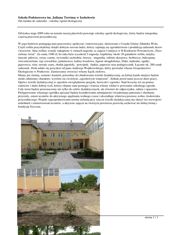 Szkoła Podstawowa im. Juliana Tuwima w Izabelowie Od ziarnka do sadzonki - szkolny ogród ekologiczny Od końca maja 2009 roku na terenie naszej placówki powstaje szkolny ogród ekologiczny, który będzie integralną częścią pracowni przyrodniczej. W jego budowie pomagają nam pracownicy społeczni i interwencyjni, skierowani z Urzędu Gminy Zduńska Wola. Część roślin pozyskaliśmy dzięki dobrym sercom ludzi, którzy zajmują się ogrodnictwem i produkcją sadzonek drzew i krzewów. Inne rośliny zostały zakupione w ramach nagrody za zajęcie I miejsca w II Konkursie Powiatowym „Nasz zielony świat”. Za sumę 1500 zł, bo taka była wysokość I nagrody, kupiliśmy około 30 gatunków roślin, między innymi: jałowce, sosny czarne, żywotniki zachodnie, brzozy, magnolię, robinie akacjowe, berberysy, bukszpany wieczniezielone, irgi szwedzkie, jaśminowce, kaliny koralowe, ligustr okrągłolistny, lilaki, mahonie, ogniki, pigwowce, róże, tawuły szare, złotlin japoński, powojnik, funkie, paprocie oraz podagrycznik. Łącznie ok. 200 sztuk sadzonek. Zioła udało się pozyskać od pana Andrzeja Wojtkowskiego, który prowadzi własne Gospodarstwo Ekologiczne w Pratkowie. Zamierzamy stworzyć własny kącik ziołowy. Mamy już ziemię, cement i kamień, potrzebny do zbudowania ścieżki dydaktycznej, na której każde miejsce będzie miało odmienny charakter, wyróżni się swoistym „ogrodowym wnętrzem”. Jednak przed nami jeszcze dużo pracy. Oprócz ścieżki dydaktycznej w ogrodzie uwzględniono pergole, ławeczki i ognisko. Stąd liczymy też na pomoc rodziców i ludzi dobrej woli, którzy chętnie nam pomogą i wniosą własny wkład w powstanie szkolnego ogrodu. Cały teren będzie przeznaczony nie tylko do celów dydaktycznych, ale również do odpoczynku, zabaw i spacerów. Pielęgnowanie własnego ogródka sprzyjać będzie kształtowaniu umiejętności świadomego patrzenia i słuchania przyrody, zmusi uczniów do aktywnego spędzania wolnego czasu i ukształtuje właściwą postawę wobec środowiska przyrodniczego. Projekt zagospodarowania terenu zielenią przy użyciu ścieżki dydaktycznej ma służyć też rozwojowi uzdolnień i zainteresowań uczniów, a aktywne zajęcia na świeżym powietrzu pozwolą zachować im dobrą formę i kondycję fizyczną. strona 1 / 1