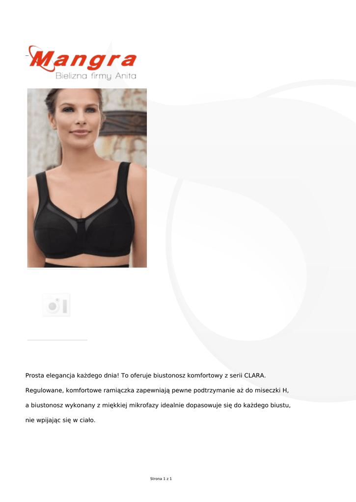 Prosta elegancja każdego dnia! To oferuje biustonosz komfortowy z serii CLARA. Regulowane, komfortowe ramiączka zapewniają pewne podtrzymanie aż do miseczki H, a biustonosz wykonany z miękkiej mikrofazy idealnie dopasowuje się do każdego biustu, nie wpijając się w ciało. Strona 1 z 1