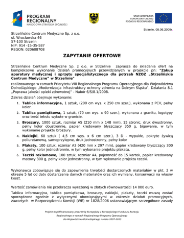 Strzelin, 05.06.2009r. Strzelińskie Centrum Medyczne Sp. z o.o. ul. Wrocławska 46 57-100 Strzelin NIP: 914 -15-35-587 REGON: 020608708 ZAPYTANIE OFERTOWE Strzelińskie Centrum Medyczne Sp. z o.o. w Strzelinie zaprasza do składania ofert na kompleksowe wykonanie działań promocyjnych przewidzianych w projekcie pn: "Zakup aparatury medycznej i sprzętu specjalistycznego dla potrzeb NZOZ „Strzelińskie Centrum Medyczne” w Strzelinie" realizowanego w ramach Priorytetu VIII Regionalnego Programu Operacyjnego dla Województwa Dolnośląskiego „Modernizacja infrastruktury ochrony zdrowia na Dolnym Śląsku”, Działania 8.1 „Poprawa jakości opieki zdrowotnej” - Nabór 6/S/8.1/2008. Zakres działań obejmuje wykonanie: 1. Tablica informacyjna, 1 sztuk, (200 cm wys. x 250 cm szer.), wykonana z PCV, pełny kolor. 2. Tablica pamiątkowa, 1 sztuk, (70 cm wys. x 90 szer.), wykonana z granitu, logotypy oraz treść tekstu wykute w granicie. 3. Broszury, 1000 sztuk, rozmiar A5 (210 mm x 148 mm), 15 stronic, druk dwustronny, pełny kolor obustronnie, papier kredowany błyszczący 350 g, bigowanie, w tym wykonanie projektu broszury. 4. Naklejki, 60 sztuk ( 4,5 cm wys. x 6 cm szer.), 3 D - wypukłe, pokryte żywicą poliuretanową, samoprzylepne, druk jednostronny, pełny kolor 5. Plakaty, 100 sztuk, rozmiar A3 (420 mm x 297 mm), papier kredowany błyszczący 300 g, pełny kolor jednostronnie, w tym wykonanie projektu plakatu. 6. Teczki reklamowe, 100 sztuk, rozmiar A4, pojemność do 15 kartek, papier kredowany matowy 300 g, pełny kolor jednostronny, w tym wykonanie projektu teczki. Wykonawca zobowiązuje się do zapewnienia trwałości dostarczonych materiałów w pkt. 2 w okresie 5 lat od daty dostarczenia danych materiałów oraz ich wymiany, konserwacji na własny koszt. Wartość zamówienia nie przekracza wyrażonej w złotych równowartości 14 000 euro. Tablica informacyjna, tablica pamiątkowa, broszury, naklejki, plakaty, teczki muszą zostać sporządzone zgodnie z wytycznymi obowiązującymi w zakresie działań promocyjnych, zawartych w Rozporządzeniu Komisji (WE) nr 1828/2006 ustanawiającym szczegółowe zasady Projekt współfinansowany przez Unię Europejską z Europejskiego Funduszu Rozwoju Regionalnego w ramach Regionalnego Programu Operacyjnego dla Województwa Dolnośląskiego na lata 2007-2013 wykonania Rozporządzenia Rady (WE) nr 1083/2006 ustanawiającego ogólne przepisy dotyczące Europejskiego Funduszu Rozwoju Regionalnego, Europejskiego Funduszu Społecznego i Funduszu Spójności oraz Rozporządzenia (WE) nr 1080/2006 Parlamentu Europejskiego i Rady w sprawie Europejskiego Funduszu Rozwoju Regionalnego, jak również zgodnie z wymogami zawartymi w Poradniku dla Beneficjenta w ramach Regionalnego programu Operacyjnego dla Województwa Dolnośląskiego na lata 2007 – 2013 z wyłączeniem Działania 1.1 i 1.2 oraz Priorytetu 10. Nie dopuszcza się składania ofert cząstkowych. Kryterium wyboru oferty: 100% cena. Termin wykonania zamówienia: w pkt. 1 do dnia 22.06.2009 w pkt. 2,3,4,5,6 do dnia 03.12.2009 Dostarczone w w/w dniach do Strzelińskiego Centrum Medycznego w Strzelinie (sekretariat). Zainteresowane firmy prosimy o składanie ofert w siedzibie Strzelińskiego Centrum Medycznego w Strzelinie (w sekretariacie) do dnia 15.06.2009 do godziny 15.00. Oferty powinny zawierać wyszczególnienie cen dla każdego przedmiotu zapytania ofertowego. Projekt współfinansowany przez Unię Europejską z Europejskiego Funduszu Rozwoju Regionalnego w ramach Regionalnego Programu Operacyjnego dla Województwa Dolnośląskiego na lata 2007-2013