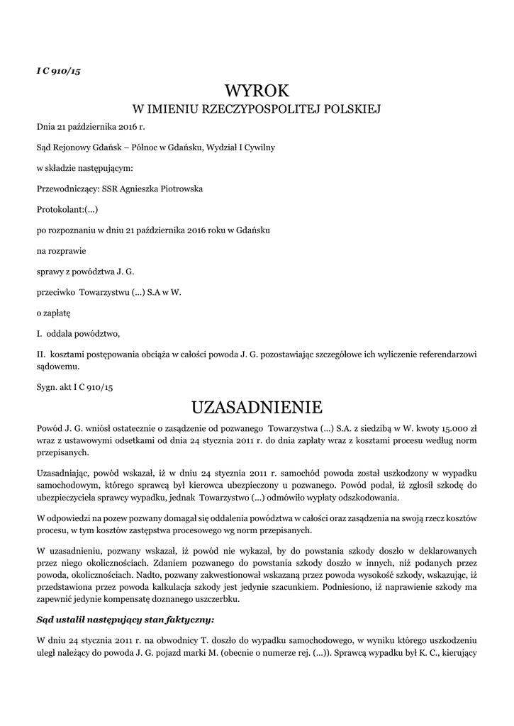 I C 910/15 WYROK W IMIENIU RZECZYPOSPOLITEJ POLSKIEJ Dnia 21 października 2016 r. Sąd Rejonowy Gdańsk – Północ w Gdańsku, Wydział I Cywilny w składzie następującym: Przewodniczący: SSR Agnieszka Piotrowska Protokolant:(...) po rozpoznaniu w dniu 21 października 2016 roku w Gdańsku na rozprawie sprawy z powództwa J. G. przeciwko Towarzystwu (...) S.A w W. o zapłatę I. oddala powództwo, II. kosztami postępowania obciąża w całości powoda J. G. pozostawiając szczegółowe ich wyliczenie referendarzowi sądowemu. Sygn. akt I C 910/15 UZASADNIENIE Powód J. G. wniósł ostatecznie o zasądzenie od pozwanego Towarzystwa (...) S.A. z siedzibą w W. kwoty 15.000 zł wraz z ustawowymi odsetkami od dnia 24 stycznia 2011 r. do dnia zapłaty wraz z kosztami procesu według norm przepisanych. Uzasadniając, powód wskazał, iż w dniu 24 stycznia 2011 r. samochód powoda został uszkodzony w wypadku samochodowym, którego sprawcą był kierowca ubezpieczony u pozwanego. Powód podał, iż zgłosił szkodę do ubezpieczyciela sprawcy wypadku, jednak Towarzystwo (...) odmówiło wypłaty odszkodowania. W odpowiedzi na pozew pozwany domagał się oddalenia powództwa w całości oraz zasądzenia na swoją rzecz kosztów procesu, w tym kosztów zastępstwa procesowego wg norm przepisanych. W uzasadnieniu, pozwany wskazał, iż powód nie wykazał, by do powstania szkody doszło w deklarowanych przez niego okolicznościach. Zdaniem pozwanego do powstania szkody doszło w innych, niż podanych przez powoda, okolicznościach. Nadto, pozwany zakwestionował wskazaną przez powoda wysokość szkody, wskazując, iż przedstawiona przez powoda kalkulacja szkody jest jedynie szacunkiem. Podniesiono, iż naprawienie szkody ma zapewnić jedynie kompensatę doznanego uszczerbku. Sąd ustalił następujący stan faktyczny: W dniu 24 stycznia 2011 r. na obwodnicy T. doszło do wypadku samochodowego, w wyniku którego uszkodzeniu uległ należący do powoda J. G. pojazd marki M. (obecnie o numerze rej. (...)). Sprawcą wypadku był K. C., kierujący samochodem marki V. (...), nr rej (...), ubezpieczony od odpowiedzialności cywilnej w pozwanym Towarzystwie (...). Do kolizji doszło wskutek utraty panowania nad pojazdem prowadzonym przez K. C. podczas wykonywania manewru wyprzedzania samochodu osobowego, kierowanego przez powoda. Wyprzedzający wpadł na śliskiej nawierzchni w poślizg i uderzył swym prawym przednim narożnikiem w tylną część lewego boku samochodu powoda. Wskutek uderzenia M. utracił stabilność ruchu, został zarzucony tyłem w prawo, po czym przednim prawym bokiem i dalszą jego częścią otarł się o prawą barierkę energochłonna i następnie zatrzymał się. Obaj kierowcy odjechali z miejsca zdarzenia własnymi samochodami po spisaniu oświadczenia o przebiegu zdarzenia. Dowody: Oświadczenie sprawcy wypadku K. C. – k. 40, zeznania świadka K. C. – protokół elektroniczny od 5:12 do 18:24, k. 160, przesłuchanie powoda – protokół elektroniczny od 22:31 do 30:45, k. 160, opinia nr (...) wraz ze schematem kolizji – k. 167 – 175, ustna opinia uzupełniająca – protokół elektroniczny od $;04 do 24:46, k. 202. Powód przed wypadkiem zamierzał dokonać darowizny na rzecz córki w postaci najmniej wartościowego spośród samochodów, które posiadał. Samochód uszkodzony w wypadku powód wykorzystywał do prowadzonej przez siebie działalności. Po wypadku J. G. zdecydował się uczynić przedmiotem darowizny uszkodzony samochód, uznawszy, że jego wartość jest niższa od wartości samochodu, który planował dać córce przed wypadkiem. Nadto powód nie chciał sprzedawać uszkodzonego samochodu i nie naprawił go, ponieważ samochód stanowił dowód w niniejszej sprawie. Okoliczności bezsporne, nadto dowód: przesłuchanie powoda – protokół elektroniczny od 22:31 do 30:45, k. 160, darowizna – k. 121. Sąd zważył, co następuje: Powództwo nie było zasadne. Powód w nin. postępowaniu dochodził zapłaty odszkodowania za uszkodzenie pojazdu, którego był właścicielem. Roszczenie skierował do ubezpieczyciela, z którym sprawca kolizji zawarł umowę obowiązkowego ubezpieczenia OC posiadaczy pojazdów mechanicznych. Pozwany kwestionował swoją odpowiedzialność tak co do zasady, jak i co do wysokości. Podnosił, że powód nie wykazał, że do powstania szkody w samochodzie doszło w wyniku przedmiotowego zdarzenia. Pozwany twierdził również, że powód nie wykazał wysokości szkody, bowiem przedstawiona kalkulacja była tylko szacunkiem, dokonanym przez powoda. Sąd uznał za zasługujące na wiarę – w zakresie ustalonego w poprzedzającej części niniejszego uzasadnienia stanu faktycznego – zeznania przesłuchanych w sprawie świadka oraz powoda. Zeznania korelowały ze sobą były spójne i logiczne, nadto korelowały ze zgromadzonym w sprawie materiałem dowodowym w postaci dokumentów. Istotnym było również, że przedstawiany przez powoda i świadka przebieg wydarzeń koreluje z uszkodzeniami w samochodzie powoda, które ustalił po dokonaniu oględzin tego pojazdu. Opinię biegłego Sąd ocenił jako pełną i wyczerpującą, wskazane w niej wnioski zostały w sposób logiczny wyprowadzone z poczynionych ustaleń. Opinia była wprawdzie kwestionowana przez stronę pozwaną, jednak biegły odniósł się do zastrzeżeń w opinii uzupełniającej (ustnie), weryfikując opinię w zakresie umiejscowienia tylnego zderzaka w samochodzie powoda, jednak podtrzymał opinię w pozostałej części. Opierając się na powyższych dowodach, zdaniem Sądu powodowi udało się wykazać, iż do powstania uszkodzeń w samochodzie marki M., należącym w dniu wypadku do powoda, doszło na skutek wypadku drogowego z dnia 24 stycznia 2011 r. w okolicznościach podawanych przez powoda. Niemniej jednak, w świetle ujawnionych w trakcie sprawy przez powoda okoliczności, o czym dalej, kwestia zaistnienia wypadku i jego skutków nie 