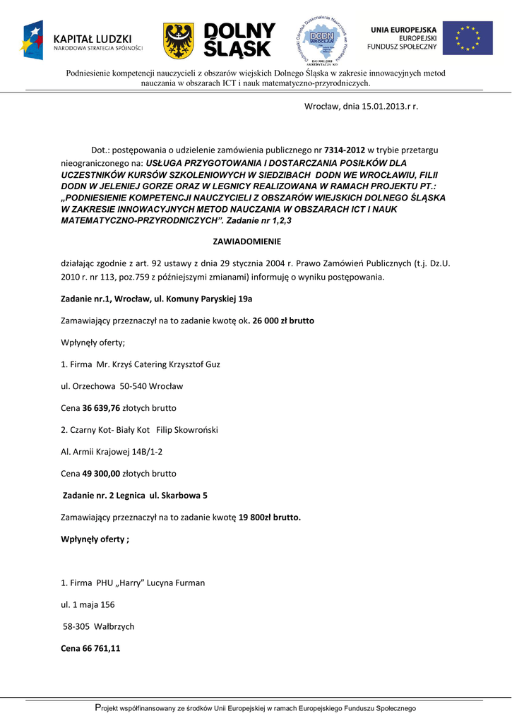Podniesienie kompetencji nauczycieli z obszarów wiejskich Dolnego Śląska w zakresie innowacyjnych metod nauczania w obszarach ICT i nauk matematyczno-przyrodniczych. Wrocław, dnia 15.01.2013.r r. Dot.: postępowania o udzielenie zamówienia publicznego nr 7314-2012 w trybie przetargu nieograniczonego na: USŁUGA PRZYGOTOWANIA I DOSTARCZANIA POSIŁKÓW DLA UCZESTNIKÓW KURSÓW SZKOLENIOWYCH W SIEDZIBACH DODN WE WROCŁAWIU, FILII DODN W JELENIEJ GORZE ORAZ W LEGNICY REALIZOWANA W RAMACH PROJEKTU PT.: „PODNIESIENIE KOMPETENCJI NAUCZYCIELI Z OBSZARÓW WIEJSKICH DOLNEGO ŚLĄSKA W ZAKRESIE INNOWACYJNYCH METOD NAUCZANIA W OBSZARACH ICT I NAUK MATEMATYCZNO-PRZYRODNICZYCH”. Zadanie nr 1,2,3 ZAWIADOMIENIE działając zgodnie z art. 92 ustawy z dnia 29 stycznia 2004 r. Prawo Zamówień Publicznych (t.j. Dz.U. 2010 r. nr 113, poz.759 z późniejszymi zmianami) informuję o wyniku postępowania. Zadanie nr.1, Wrocław, ul. Komuny Paryskiej 19a Zamawiający przeznaczył na to zadanie kwotę ok. 26 000 zł brutto Wpłynęły oferty; 1. Firma Mr. Krzyś Catering Krzysztof Guz ul. Orzechowa 50-540 Wrocław Cena 36 639,76 złotych brutto 2. Czarny Kot- Biały Kot Filip Skowroński Al. Armii Krajowej 14B/1-2 Cena 49 300,00 złotych brutto Zadanie nr. 2 Legnica ul. Skarbowa 5 Zamawiający przeznaczył na to zadanie kwotę 19 800zł brutto. Wpłynęły oferty ; 1. Firma PHU „Harry” Lucyna Furman ul. 1 maja 156 58-305 Wałbrzych Cena 66 761,11 Projekt współfinansowany ze środków Unii Europejskiej w ramach Europejskiego Funduszu Społecznego Podniesienie kompetencji nauczycieli z obszarów wiejskich Dolnego Śląska w zakresie innowacyjnych metod nauczania w obszarach ICT i nauk matematyczno-przyrodniczych. Zadanie nr 3 –Jelenia Góra, ul. 1 maja 43 Na zadanie nr 3 nie wpłynęła żadna oferta. Oferty odrzucone: 1. Czarny Kot - Biały Kot Filip Skowroński Al. Armii Krajowej 14B/1-2 2. Firma PHU „Harry” Lucyna Furman Ul. 1 maja 156 58-305 Wałbrzych Złożone oferty przewyższają kwoty założone w budżecie przez Zamawiającego. Oferty wykluczone: 1. Firma Mr. Krzyś Catering Krzysztof Guz Ul. Orzechowa 50-540 Wrocław Brak w złożonej ofercie Zaświadczenia patrz SIWZ rozdz. IV p.2 e. zgodnie z art.24 p.4. PZP. W związku z brakiem ofert spełniających wymagania SIWZ, Zamawiający unieważnia przetarg w zakresie : USŁUGA PRZYGOTOWANIA I DOSTARCZANIA POSIŁKÓW DLA UCZESTNIKÓW KURSÓW SZKOLENIOWYCH W SIEDZIBACH DODN WE WROCŁAWIU, FILII DODN W JELENIEJ GORZE ORAZ W LEGNICY REALIZOWANA W RAMACH PROJEKTU PT.: „PODNIESIENIE KOMPETENCJI NAUCZYCIELI Z OBSZARÓW WIEJSKICH DOLNEGO ŚLĄSKA W ZAKRESIE INNOWACYJNYCH METOD NAUCZANIA W OBSZARACH ICT I NAUK MATEMATYCZNO-PRZYRODNICZYCH”. Zadanie nr 1,2,3 Dyrektor DODN we Wrocławiu Dr Małgorzata Bacia Projekt współfinansowany ze środków Unii Europejskiej w ramach Europejskiego Funduszu Społecznego