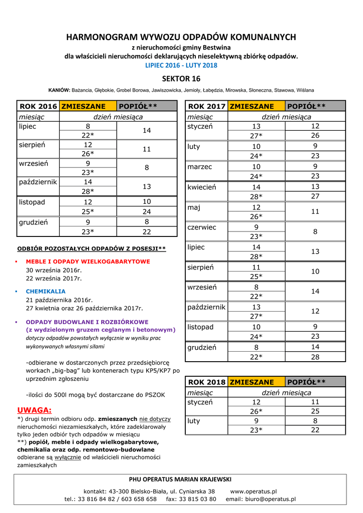 HARMONOGRAM WYWOZU ODPADÓW KOMUNALNYCH z nieruchomości gminy Bestwina dla właścicieli nieruchomości deklarujących nieselektywną zbiórkę odpadów. LIPIEC 2016 - LUTY 2018 SEKTOR 16 KANIÓW: Bażancia, Głębokie, Grobel Borowa, Jawiszowicka, Jemioły, Łabędzia, Mirowska, Słoneczna, Stawowa, Wiślana ROK 2016 ZMIESZANE miesiąc lipiec POPIÓŁ** dzień miesiąca 8 14 22* 12 11 26* 9 8 23* 14 13 28* 10 12 sierpień wrzesień luty 9 23 kwiecień 14 28* 13 27 maj 12 26* 11 czerwiec 9 23* 8 lipiec 14 28* 13 sierpień 11 25* 10 wrzesień 14 21 października 2016r. 27 kwietnia oraz 26 października 2017r. 8 22* październik 12 ODPADY BUDOWLANE I ROZBIÓRKOWE (z wydzielonym gruzem ceglanym i betonowym) 13 27* listopad dotyczy odpadów powstałych wyłącznie w wyniku prac wykonywanych własnymi siłami 10 24* 9 23 grudzień 8 22* 14 25* grudzień 9 23* 24 8 22 ODBIÓR POZOSTAŁYCH ODPADÓW Z POSESJI** MEBLE I ODPADY WIELKOGABARYTOWE 30 września 2016r. 22 września 2017r. dzień miesiąca 12 13 26 27* 9 10 23 24* 10 24* listopad miesiąc styczeń POPIÓŁ** marzec październik ROK 2017 ZMIESZANE CHEMIKALIA -odbierane w dostarczonych przez przedsiębiorcę workach „big-bag” lub kontenerach typu KP5/KP7 po uprzednim zgłoszeniu -ilości do 500l mogą być dostarczane do PSZOK UWAGA: *) drugi termin odbioru odp. zmieszanych nie dotyczy nieruchomości niezamieszkałych, które zadeklarowały tylko jeden odbiór tych odpadów w miesiącu **) popiół, meble i odpady wielkogabarytowe, chemikalia oraz odp. remontowo-budowlane odbierane są wyłącznie od właścicieli nieruchomości zamieszkałych ROK 2018 ZMIESZANE miesiąc styczeń 28 POPIÓŁ** dzień miesiąca 11 12 25 26* 8 9 22 23* luty UWAGA: * odbiór odpadów za 1.11.2017 r. PHU OPERATUS MARIAN KRAJEWSKI kontakt: 43-300 Bielsko-Biała, ul. Cyniarska 38 tel.: 33 816 84 82 / 603 658 658 fax: 33 815 03 80 www.operatus.pl email: [email protected] OGÓLNE ZASADY ODBIORU ODPADÓW: W okresie objętym niniejszym harmonogramem odpady komunalne z terenu gminy odbierają firmy OPERATUS Sp. z o.o. Sp. k. oraz REZBUD S.C. wyłącznie samochodami oznaczonymi logo tych firm. Odpady należy wystawić w dniu odbioru do godziny 7:00 w miejscu widocznym i łatwo dostępnym przed posesją lub w altance śmietnikowej. Odbiór nastąpi między godziną 7:00 a 19:00. Odpady zielone (czyli m.in. trawa, liście, gałęzie itp.) odbierane są wyłącznie w PSZOK. Oznacza to, że tego typu odpady nie mogą być umieszczane w pojemnikach na odpady MOKRE. Odpady mokre, zmieszane oraz popiół będą odbierane wyłącznie w pojemnikach. Odpady źle wysegregowane pozostaną na nieruchomości z informacją dla właściciela nieruchomości „ZŁA SEGREGACJA”. Jeśli zostaną poprawnie wysegregowane będą odebrane w kolejnym terminie wg harmonogramu, zaś w przypadku braku reakcji właściciela zostaną odebrane jako zmieszane, co powoduje zobowiązanie. WAŻNE! Reklamacje należy zgłaszać do UG Bestwina do 3 dni roboczych od daty zaistnienia zdarzenia [tel.: 32 215 77 25]. Uwaga: Jeżeli zauważą Państwo nieoznakowany pojazd odbierający odpady prosimy o natychmiastowe zgłoszenie tego faktu do firmy Operatus [tel.: 33 816 84 82] lub do Urzędu Gminy Bestwina. --------------------------------------------------------------------------------------------------------------------------------------------- PUNKT SELEKTYWNEGO ZBIERANIA ODPADÓW KOMUNALNYCH (PSZOK) adres: Kaniów, ul. Młyńska (obok siedziby KOMBEST) czynny: w okresie od 1 maja do 31 października środa, piątek, sobota, godz. 10:00 – 18:00 w okresie od 2 listopada do 30 kwietnia piątek godz. 10:00 – 16:00 sobota, godz. 10:00 – 14:00 WYSEGREGOWANE ODPADY ODBIERANE W PSZOK: PAPIER I TEKTURA, SZKŁO [w tym rozbite szyby, lustra], METAL, TWORZYWA SZTUCZNE, OPAKOWANIA WIELOMATERIAŁOWE, ODZIEŻ I TEKSTYLIA, ODPADY ULEGAJĄCE BIODEGRADACJI, ODPADY ZIELONE, ZUŻYTE OPONY, POPIÓŁ, CHEMIKALIA, BATERIE I AKUMULATORY, ZUŻYTY SPRZĘT ELEKTRYCZNY I ELEKTRONICZNY, MEBLE I INNE ODPADY WIELKOGABARYTOWE, ODPADY BUDOWLANE I ROZBIÓRKOWE oraz GRUZ CEGLANY I BETONOWY pochodzący z prowadzenia drobnych robót wykonywanych własnymi siłami przez właściciela nieruchomości. UWAGA! JEDNORAZOWO MOŻNA DOSTARCZYĆ DO 500L. ****DO PSZOK MOGĄ TRAFIAĆ WYŁĄCZNIE ODPADY POCHODZĄCE Z NIERUCHOMOŚCI ZAMIESZKAŁYCH**** PHU OPERATUS MARIAN KRAJEWSKI kontakt: 43-300 Bielsko-Biała, ul. Cyniarska 38 tel.: 33 816 84 82 / 603 658 658 fax: 33 815 03 80 www.operatus.pl email: [email protected]