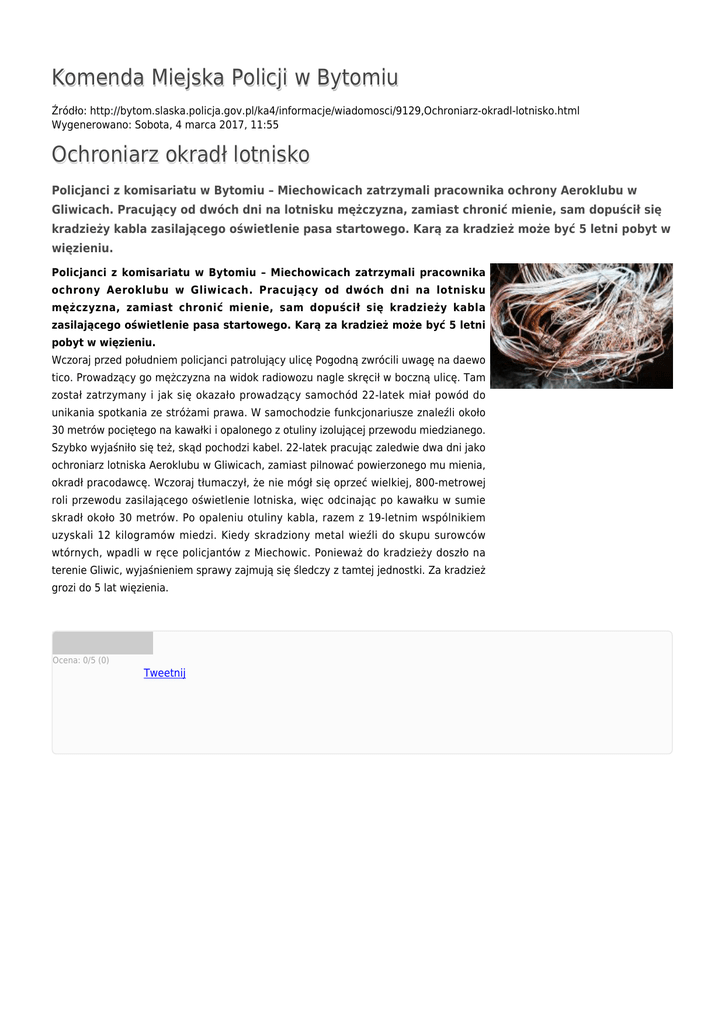 Komenda Miejska Policji w Bytomiu Źródło: http://bytom.slaska.policja.gov.pl/ka4/informacje/wiadomosci/9129,Ochroniarz-okradl-lotnisko.html Wygenerowano: Sobota, 4 marca 2017, 11:55 Ochroniarz okradł lotnisko Policjanci z komisariatu w Bytomiu – Miechowicach zatrzymali pracownika ochrony Aeroklubu w Gliwicach. Pracujący od dwóch dni na lotnisku mężczyzna, zamiast chronić mienie, sam dopuścił się kradzieży kabla zasilającego oświetlenie pasa startowego. Karą za kradzież może być 5 letni pobyt w więzieniu. Policjanci z komisariatu w Bytomiu – Miechowicach zatrzymali pracownika ochrony Aeroklubu w Gliwicach. Pracujący od dwóch dni na lotnisku mężczyzna, zamiast chronić mienie, sam dopuścił się kradzieży kabla zasilającego oświetlenie pasa startowego. Karą za kradzież może być 5 letni pobyt w więzieniu. Wczoraj przed południem policjanci patrolujący ulicę Pogodną zwrócili uwagę na daewo tico. Prowadzący go mężczyzna na widok radiowozu nagle skręcił w boczną ulicę. Tam został zatrzymany i jak się okazało prowadzący samochód 22-latek miał powód do unikania spotkania ze stróżami prawa. W samochodzie funkcjonariusze znaleźli około 30 metrów pociętego na kawałki i opalonego z otuliny izolującej przewodu miedzianego. Szybko wyjaśniło się też, skąd pochodzi kabel. 22-latek pracując zaledwie dwa dni jako ochroniarz lotniska Aeroklubu w Gliwicach, zamiast pilnować powierzonego mu mienia, okradł pracodawcę. Wczoraj tłumaczył, że nie mógł się oprzeć wielkiej, 800-metrowej roli przewodu zasilającego oświetlenie lotniska, więc odcinając po kawałku w sumie skradł około 30 metrów. Po opaleniu otuliny kabla, razem z 19-letnim wspólnikiem uzyskali 12 kilogramów miedzi. Kiedy skradziony metal wieźli do skupu surowców wtórnych, wpadli w ręce policjantów z Miechowic. Ponieważ do kradzieży doszło na terenie Gliwic, wyjaśnieniem sprawy zajmują się śledczy z tamtej jednostki. Za kradzież grozi do 5 lat więzienia. Ocena: 0/5 (0) Tweetnij