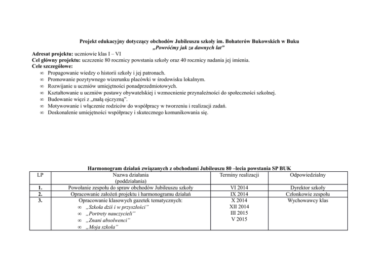 Projekt edukacyjny dotyczący obchodów Jubileuszu szkoły im. Bohaterów Bukowskich w Buku „Powróćmy jak za dawnych lat” Adresat projektu: uczniowie klas I – VI Cel główny projektu: uczczenie 80 rocznicy powstania szkoły oraz 40 rocznicy nadania jej imienia. Cele szczegółowe: • Propagowanie wiedzy o historii szkoły i jej patronach. • Promowanie pozytywnego wizerunku placówki w środowisku lokalnym. • Rozwijanie u uczniów umiejętności ponadprzedmiotowych. • Kształtowanie u uczniów postawy obywatelskiej i wzmocnienie przynależności do społeczności szkolnej. • Budowanie więzi z „małą ojczyzną”. • Motywowanie i włączenie rodziców do współpracy w tworzeniu i realizacji zadań. • Doskonalenie umiejętności współpracy i skutecznego komunikowania się. LP 1. 2. 3. Harmonogram działań związanych z obchodami Jubileuszu 80 –lecia powstania SP BUK Nazwa działania Terminy realizacji Odpowiedzialny (poddziałania) Powołanie zespołu do spraw obchodów Jubileuszu szkoły VI 2014 Dyrektor szkoły Opracowanie założeń projektu i harmonogramu działań IX 2014 Członkowie zespołu Opracowanie klasowych gazetek tematycznych: X 2014 Wychowawcy klas XII 2014 • „Szkoła dziś i w przyszłości” III 2015 • „Portrety nauczycieli” V 2015 • „Znani absolwenci” • „Moja szkoła” 4. 5. 6. 7. 8. 9. 10. 11. 12. 13. 14. 15. Dokumentacja fotograficzna gazetek przesyłana na adres mejlowy szkoły ( Na zdjęciach powinni znaleźć się też uczniowie). Prezentacja dokonań społeczności szkolnej. Rymowanki o nauczycielach i pracownikach szkoły (przesłane drogą mejlową) Prezentacja rymowanek Stworzenie piosenki do wybranej rymowanki Przygotowanie prezentacji multimedialnej „Szkoła w moich oczach” (ulubione miejsca w szkole, wspomnienia z wycieczek szkolnych, rys historyczny itp.) Przygotowanie filmu o swojej klasie (maks. 3 min.) – może być w formie żartobliwej Przesłanie filmu w odpowiednim formacie lub zgranie go na DVD Wykonanie plakatów pt. „Dziadkowie, rodzice i ja” w formacie A2 Wystawa plakatów (dotyczy tylko klas IV – VI) Uwzględnienie w planach pracy wychowawczej obchodów Jubileuszu (realizacja przynajmniej 4 tematów lekcyjnych) Wykonanie albumów w ramach „Biblioteczki patronów” (dotyczy klas V): Stanisław Reszka Andrzej z Buku Kazimierz Wróblewski Prezentacja zdjęć nauczycieli z lat dzieciństwa „Tacy byliśmy jeszcze wczoraj” Cykl spotkań z absolwentami szkoły Gra miejska związana z patronami szkoły (opracowanie zasad gry) Zdjęcie z lotu ptaka społeczności szkolnej (nawiązanie współpracy z fotografem i strażą pożarną) Przygotowanie baneru z okazji 80-lecia powstania szkoły Wykonanie elementów ogrodzenia tematycznie związanych ze szkołą Do 3 X 2014 Wychowawcy klas Do 2 III 2015 (po feriach szkolnych) Wychowawcy klas Do 2 III 2015 Wychowawcy klas Rodzice – pomoc w „obróbce” filmu Teresa Maj Pomoc rodziców Wychowawcy klas Do końca I 2015 V 2015 Cały rok szkolny Do końca IV Teresa Maj Wychowawcy klas Cały rok szkolny nauczyciele Cały rok szkolny 16 V 2015 Opiekunowie SU Nauczyciele rodzice Wicedyrektor szkoły 15 V 2015 Wychowawcy klas 16. Promocja obchodów Jubileuszu za sprawą: - opracowania logo projektu - opracowania i wykonania tzw. przypinek - ulotek reklamujących szkołę - artykułów w prasie lokalnej - umieszczania informacji na Facebooku - rozprowadzanie cegiełek przez Radę Rodziców Cały rok szkolny Agnieszka Wojciechowska Dorota Ogonowska-Springer Lidia Pąpka Alina Konieczna Wicedyrektor szkoły – Anna Krzemińska 17. 18. Zasadzenie „jubileuszowego” drzewa Piknik rodzinny Cały rok szkolny 19. Podsumowanie projektu 15 – 16 V 2015 Rodzice nauczyciele
