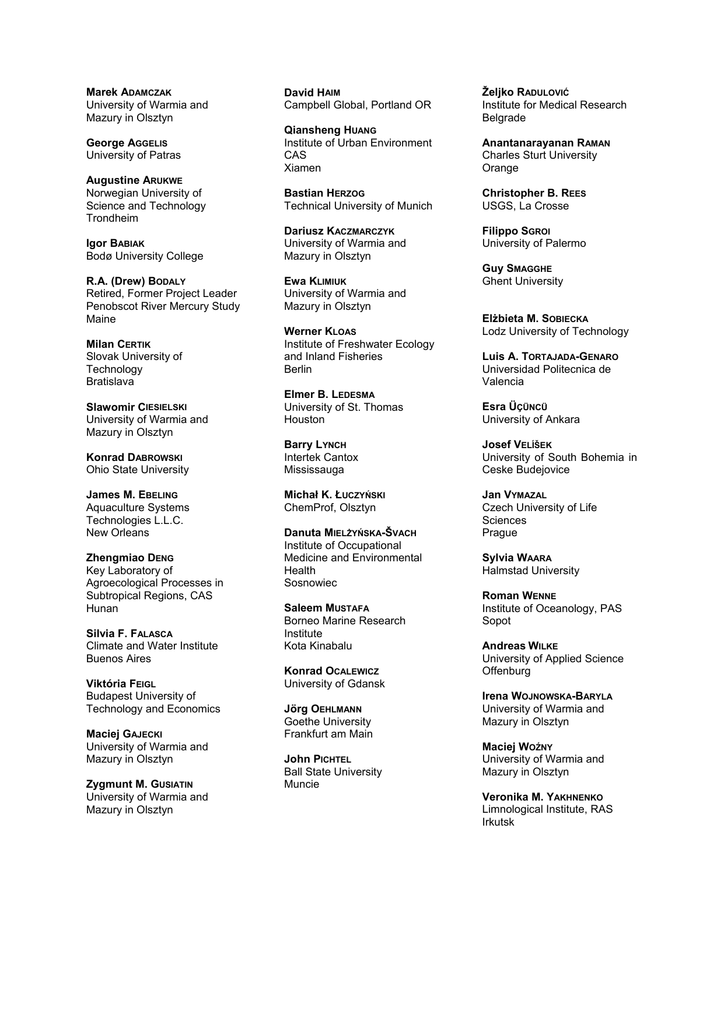 Marek ADAMCZAK University of Warmia and Mazury in Olsztyn David HAIM Campbell Global, Portland OR Željko RADULOVIĆ Institute for Medical Research Belgrade George AGGELIS University of Patras Qiansheng HUANG Institute of Urban Environment CAS Xiamen Anantanarayanan RAMAN Charles Sturt University Orange Augustine ARUKWE Norwegian University of Science and Technology Trondheim Bastian HERZOG Technical University of Munich Christopher B. REES USGS, La Crosse Dariusz KACZMARCZYK University of Warmia and Mazury in Olsztyn Filippo SGROI University of Palermo Igor BABIAK Bodø University College R.A. (Drew) BODALY Retired, Former Project Leader Penobscot River Mercury Study Maine Milan CERTIK Slovak University of Technology Bratislava Slawomir CIESIELSKI University of Warmia and Mazury in Olsztyn Konrad DABROWSKI Ohio State University James M. EBELING Aquaculture Systems Technologies L.L.C. New Orleans Zhengmiao DENG Key Laboratory of Agroecological Processes in Subtropical Regions, CAS Hunan Silvia F. FALASCA Climate and Water Institute Buenos Aires Viktória FEIGL Budapest University of Technology and Economics Maciej GAJECKI University of Warmia and Mazury in Olsztyn Zygmunt M. GUSIATIN University of Warmia and Mazury in Olsztyn Ewa KLIMIUK University of Warmia and Mazury in Olsztyn Werner KLOAS Institute of Freshwater Ecology and Inland Fisheries Berlin Guy SMAGGHE Ghent University Elżbieta M. SOBIECKA Lodz University of Technology Luis A. TORTAJADA-GENARO Universidad Politecnica de Valencia Elmer B. LEDESMA University of St. Thomas Houston Esra ÜÇÜNCÜ University of Ankara Barry LYNCH Intertek Cantox Mississauga Josef VELÍŠEK University of South Bohemia in Ceske Budejovice Michał K. ŁUCZYŃSKI ChemProf, Olsztyn Jan VYMAZAL Czech University of Life Sciences Prague Danuta MIELŻYŃSKA-ŠVACH Institute of Occupational Medicine and Environmental Health Sosnowiec Saleem MUSTAFA Borneo Marine Research Institute Kota Kinabalu Konrad OCALEWICZ University of Gdansk Jörg OEHLMANN Goethe University Frankfurt am Main John PICHTEL Ball State University Muncie Sylvia WAARA Halmstad University Roman WENNE Institute of Oceanology, PAS Sopot Andreas WILKE University of Applied Science Offenburg Irena WOJNOWSKA-BARYLA University of Warmia and Mazury in Olsztyn Maciej WOŹNY University of Warmia and Mazury in Olsztyn Veronika M. YAKHNENKO Limnological Institute, RAS Irkutsk
