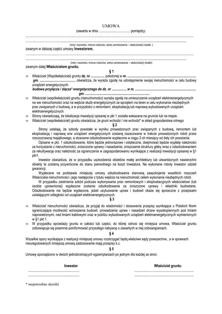 UMOWA zawarta w dniu .................................. pomiędzy: …………………………………………………………………………………………………………………………… ………………………….............................................................................................................................. (imię i nazwisko, imiona rodziców, adres zamieszkania – właściciela(i) działki .) zwanym w dalszej części umowy Inwestorem, …………………………………………………………………………………………………………………………… ………………………….............................................................................................................................. (imię i nazwisko, imiona rodziców, adres zamieszkania – właściciela(i) działki) zwanym dalej Właścicielem gruntu. • • • • §1 Właściciel (Współwłaściciel) gruntu dz. nr ................ połoŜonej w m. ............................................................................... gm. ......................................... oświadcza, Ŝe wyraŜa zgodę na udostępnienie swojej nieruchomości w celu budowy urządzeń energetycznych: budowa przyłącza / złącza* energetycznego do dz. nr ................. w m. ...................................................................... gm. .......................................................................... Właściciel (współwłaściciel) gruntu (nieruchomości) wyraŜa zgodę na umieszczenie urządzeń elektroenergetycznych na ww nieruchomości oraz na wejście słuŜb energetycznych ze sprzętem na teren w celu wykonania niezbędnych prac związanych z budową, a w przyszłości z remontami, eksploatacją lub naprawą wybudowanych urządzeń elektroenergetycznych. Strony oświadczają, Ŝe lokalizacja inwestycji opisanej w pkt 1 została wskazana na gruncie lub na mapie. Właściciel (współwłaściciel) gruntu oświadcza, Ŝe grunt wchodzi / nie wchodzi* w skład gospodarstwa rolnego §2 Strony ustalają, Ŝe szkody powstałe w wyniku prowadzonych prac związanych z budową, remontem lub eksploatacją i naprawą w/w urządzeń energetycznych zostaną oszacowane w trakcie prowadzonych robót przez rzeczoznawcę majątkowego, a stosowne odszkodowanie wypłacone w ciągu 2-ch miesięcy od daty ich powstania. Opisane w pkt. 1 odszkodowanie, które będzie jednorazowe i ostateczne, obejmować będzie wypłatę naleŜności za korzystanie z nieruchomości, zniszczone uprawy i nasadzenia, zniszczenie struktury gleby wraz z odszkodowaniem za rekultywację oraz naleŜność za ograniczenia w zagospodarowaniu wynikające z realizacji inwestycji opisanej w §1 pkt1. Inwestor oświadcza, Ŝe w przypadku uszkodzenia obiektów małej architektury lub utwardzonych nawierzchni obiekty te zostaną przywrócone do stanu pierwotnego na koszt Inwestora. Na wykonane roboty Inwestor udzieli gwarancji. Wypłacane na podstawie niniejszej umowy odszkodowania stanowią zaspokojenie wszelkich roszczeń Właściciela nieruchomości i jego następców z tytułu wejścia na nieruchomość celem wykonania niezbędnych robót. W przypadku zaistnienia szkód podczas wykonywania prac remontowych i eksploatacyjnych właścicielowi (lub osobie uprawnionej) wypłacone zostanie odszkodowanie za zniszczone uprawy i składniki budowlane. Odszkodowanie nie będzie wypłacone, jeŜeli usytuowanie upraw i budowli okaŜe się sprzeczne z przepisami ustalającymi odległości od urządzeń elektroenergetycznych. §3 • Właściciel nieruchomości oświadcza, Ŝe przyjął do wiadomości i stosowania przepisy wynikające z Polskich Norm ograniczające moŜliwość wznoszenia budowli, prowadzenia upraw i nasadzeń drzew wysokopiennych pod liniami napowietrznymi, nad liniami kablowymi oraz w pobliŜu wybudowanych urządzeń elektroenergetycznych wymienionych w §1 pkt 1. • W przypadku sprzedaŜy gruntu w całości lub części, do której odnosi się niniejsza umowa, Właściciel gruntu zobowiązuje się pisemnie poinformować przyszłego nabywcę o zawartych w niej zobowiązaniach. §4 Wszelkie spory wynikające z realizacji niniejszej umowy rozstrzygać będą właściwe sądy powszechne., a w sprawach nieuregulowanych niniejszą umową zastosowanie mają przepisy k.c. §5 Umowę sporządzono w dwóch jednobrzmiących egzemplarzach po jednym dla kaŜdej ze stron. Inwestor ........................................................ ........................................................ * niepotrzebne skreślić Właściciel gruntu ................................................................. .................................................................