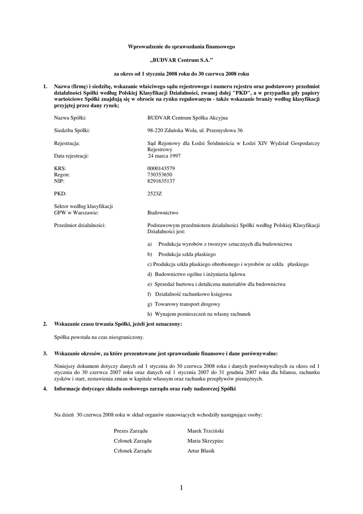 Wprowadzenie do sprawozdania finansowego „BUDVAR Centrum S.A.” za okres od 1 stycznia 2008 roku do 30 czerwca 2008 roku 1. Nazwa (firm ) i siedzib , wskazanie wła ciwego s du rejestrowego i numeru rejestru oraz podstawowy przedmiot działalno ci Spółki według Polskiej Klasyfikacji Działalno ci, zwanej dalej "PKD", a w przypadku gdy papiery warto ciowe Spółki znajduj si w obrocie na rynku regulowanym - tak e wskazanie bran y według klasyfikacji przyj tej przez dany rynek; Nazwa Spółki: BUDVAR Centrum Spółka Akcyjna Siedziba Spółki: 98-220 Zdu ska Wola, ul. Przemysłowa 36 Rejestracja: Data rejestracji: S d Rejonowy dla Łodzi ródmie cia w Łodzi XIV Wydział Gospodarczy Rejestrowy 24 marca 1997 KRS: Regon: NIP: 0000143579 730353650 8291635137 PKD: 2523Z Sektor według klasyfikacji GPW w Warszawie: Budownictwo Przedmiot działalno ci: Podstawowym przedmiotem działalno ci Spółki według Polskiej Klasyfikacji Działalno ci jest: a) Produkcja wyrobów z tworzyw sztucznych dla budownictwa b) Produkcja szkła płaskiego c) Produkcja szkła płaskiego obrobionego i wyrobów ze szkła płaskiego d) Budownictwo ogólne i in ynieria l dowa e) Sprzeda hurtowa i detaliczna materiałów dla budownictwa f) Działalno rachunkowo ksi gowa g) Towarowy transport drogowy h) Wynajem pomieszcze na własny rachunek 2. Wskazanie czasu trwania Spółki, je eli jest oznaczony: Spółka powstała na czas nieograniczony. 3. Wskazanie okresów, za które prezentowane jest sprawozdanie finansowe i dane porównywalne: Niniejszy dokument dotyczy danych od 1 stycznia do 30 czerwca 2008 roku i danych porównywalnych za okres od 1 stycznia do 30 czerwca 2007 roku oraz danych od 1 stycznia 2007 do 31 grudnia 2007 roku dla bilansu, rachunku zysków i start, zestawienia zmian w kapitale własnym oraz rachunku przepływów pieni nych. 4. Informacje dotycz ce składu osobowego zarz du oraz rady nadzorczej Spółki Na dzie 30 czerwca 2008 roku w skład organów stanowi cych wchodziły nast puj ce osoby: Prezes Zarz du Marek Trzci ski Członek Zarz du Maria Skrzypiec Członek Zarz du Artur Błasik 1 Skład Rady Nadzorczej Spółki na dzie 30 czerwca 2008 roku: Jan Kaczmarek Urszula Trzci ska Kazimierz Trzci ski Krzysztof J drzejewski Aleksander Kowalczyk 5. - Przewodnicz cy Rady Nadzorczej - Zast pca Przewodnicz cego Rady Nadzorczej - Sekretarz Rady Nadzorczej - Członek Rady Nadzorczej - Członek Rady Nadzorczej Wskazanie, czy sprawozdanie finansowe i dane porównywalne zawieraj dane ł czne - je eli w skład Spółki wchodz wewn trzne jednostki organizacyjne sporz dzaj ce samodzielne sprawozdania finansowe. W skład Spółki nie wchodziły wewn trzne jednostki organizacyjne sporz dzaj ce samodzielnie sprawozdanie Finansowe . 6. Wskazanie, czy Spółka jest jednostk dominuj c lub znacz cym inwestorem oraz czy sporz dza skonsolidowane sprawozdanie finansowe. Spółka jest jednostk dominuj c wobec Spółki zale nej Budvar Centrum Handel Sp. z o.o. Nie ma obowi zku sporz dzania skonsolidowanego sprawozdania finansowego. 7. W przypadku sprawozdania finansowego sporz dzonego za okres, w czasie którego nast piło poł czenie – wskazanie, e jest to sprawozdanie finansowe po poł czeniu spółek, oraz wskazanie zastosowanej metody rozliczenia poł czenia. W okresie obj tym sprawozdaniem finansowym nie nast piło poł czenie Spółek. 8. Wskazanie, czy sprawozdanie finansowe zostało sporz dzone przy zało eniu kontynuowania działalno ci gospodarczej przez Spółk w daj cej si przewidzie przyszło ci oraz czy nie istniej okoliczno ci wskazuj ce na zagro enie kontynuowania działalno ci; Sprawozdanie finansowe zostało sporz dzone przy zało eniu kontynuowania działalno ci gospodarczej jednostki w daj cej si przewidzie przyszło ci oraz nie istniej okoliczno ci wskazuj ce na zagro enie kontynuowania działalno ci 9. Stwierdzenie, e sprawozdania finansowe podlegały przekształceniu w celu zapewnienia porównywalno ci danych, a zestawienie i obja nienie ró nic, b d cych wynikiem korekt z tytułu zmian zasad (polityki) rachunkowo ci lub korekt bł dów podstawowych, zostało zamieszczone w dodatkowej nocie obja niaj cej; Sprawozdanie finansowe za okres od 1 stycznia do 30 czerwca 2008 roku nie podlegało przekształceniu w celu zapewnienia porównywalno ci danych, gdy dane finansowe zaprezentowane w poszczególnych sprawozdaniach s porównywalne. 10. Wskazanie, czy w przedstawionym sprawozdaniu finansowym lub porównywalnych danych finansowych dokonano korekt wynikaj cych z zastrze e w opiniach podmiotów uprawnionych do badania o sprawozdaniach finansowych za lata, za które sprawozdanie finansowe lub porównywalne dane finansowe zostały zamieszczone w raporcie. W przedstawionym sprawozdaniu finansowym oraz porównywalnych danych finansowych nie było potrzeby dokonania korekt wynikaj cych z zastrze e w opiniach podmiotów uprawnionych do badania. 11. Opis przyj tych zasad (polityki) rachunkowo ci, w tym metod wyceny aktywów i pasywów, ustalenia przychodów, kosztów i wyniku finansowego oraz sposobu sporz dzenia sprawozdania finansowego i danych porównywalnych. Sprawozdanie finansowe zostało sporz dzone w oparciu o przepisy Ustawy z dnia 29 wrze nia 1994 roku o rachunkowo ci wraz z pó niejszymi zmianami oraz o Polityk rachunkowo ci firmy BUDVAR Centrum S.A. Zasady obowi zuj ce przy sporz dzaniu sprawozdania nie odbiegały od ni ej opisanych zasad. Wszystkie dane zaprezentowano w tysi cach złotych, o ile nie zaznaczono inaczej. 2 Spółka sporz dza: 1. 2. Rachunek zysków i strat metod kalkulacyjn . Rachunek przepływów pieni nych sporz dzany jest metod po redni . Rok obrotowy pokrywa si z rokiem kalendarzowym. 11.1 Rzeczowe aktywa trwałe, warto ci niematerialne i prawne Spółka stosuje nast puj ce roczne stawki amortyzacyjne dla podstawowych grup rodków trwałych: • • • • • • własne budynki, lokale i obiekty in ynierii l dowej i wodnej ulepszenia w obcych obiektach urz dzenia techniczne