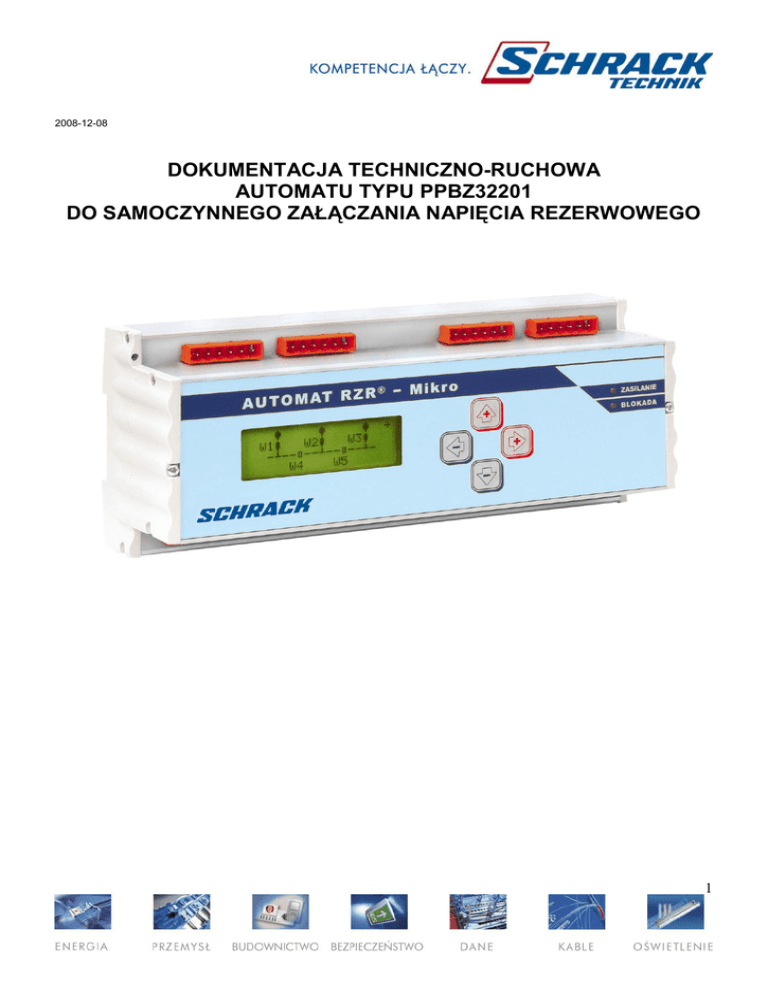 2008-12-08 DOKUMENTACJA TECHNICZNO-RUCHOWA AUTOMATU TYPU PPBZ32201 DO SAMOCZYNNEGO ZAŁĄCZANIA NAPIĘCIA REZERWOWEGO 1 (Wersja [322]) Spis treści 1. 2. 3. 4. 5. Zastosowanie .................................................................................................................... 3 Dane o kompletności ........................................................................................................ 3 Dane techniczne ............................................................................................................... 4 Budowa ............................................................................................................................. 4 Opis techniczny................................................................................................................. 5 5.1. Uwagi ogólne ................................................................................................................ 5 5.2. Płyta czołowa ................................................................................................................ 6 5.2.1. Sygnalizacja optyczna ............................................................................................. 6 5.2.2. Elementy manipulacyjne ......................................................................................... 6 5.3. Cykle przełączeń automatu PPBZ32201 ....................................................................... 6 5.3.1. Cykl SZR ................................................................................................................. 7 5.3.2. Cykl APZ ................................................................................................................. 7 5.3.3. Cykle AZZ ............................................................................................................... 7 5.3.4. SZR jednokrotny ..................................................................................................... 7 5.3.5. Zasilanie z UPS....................................................................................................... 8 5.4. Włączenie automatu ...................................................................................................... 8 5.5. Warunki działania .......................................................................................................... 8 6. Instalacja........................................................................................................................... 8 7. Obsługa automatu PPBZ32201 ....................................................................................... 9 7.1. Blokada ......................................................................................................................... 9 7.2. Sygnalizacja optyczna ................................................................................................... 9 7.3. Sygnalizacja stykowa blokady ....................................................................................... 9 7.4. Wyświetlacz LCD ........................................................................................................ 10 7.4.1. Kontrola stanu położenia wyłączników .................................................................. 10 7.4.2. Obecność kontrolowanych napięć ......................................................................... 10 7.4.3. Ustawienie opóźnienia zaniku napięć .................................................................... 11 7.4.4. Ustawienie opóźnienia działania PPBZ32201 ....................................................... 11 7.4.5. Ustawienie konfiguracji automatu .......................................................................... 12 7.4.6. Alarmy................................................................................................................... 13 8. Eksploatacja ................................................................................................................... 14 9. Pakowanie ...................................................................................................................... 14 10. Uwagi końcowe............................................................................................................ 14 11. Rysunek gabarytowy obudowy PPBZ32201 ................................................................ 15 12. Schemat połączeń zewnętrznych automatu PPBZ32201 ............................................. 16 13. Schemat połączeń zewnętrznych automatu PPBZ32201 gdy zasilany jest z UPS’a .... 17 14. Przykładowy schemat układu sterowania wyłącznikami ............................................... 18 15. Schemat podłączenia układu odwzorowania i blokad................................................... 19 2 1. Zastosowanie Automat PPBZ32201 jest mikroprocesorowym automatem do samoczynnego załączania napięcia rezerwowego (SZR) i automatycznego powrotu na zasilanie podstawowe (APZ) rozdzielni 0,4 kV. Zapewnia on ciągłość zasilania w sieciach n/n dla budynków użyteczności publicznej, budynków mieszkalnych oraz obiektów przemysłowych. Automat w wersji [322] przystosowany jest do pracy w układzie 3 – wyłączników, 2 sekcji i 2 źródeł zasilania. Automat realizuje przełączenia: 2. SZR - od zaniku napięcia, APZ - po powrocie napięcia, AZZ - automatyczne załączenie zasilania po włączeniu automatu do pracy. Dane o kompletności W skład dostawy dla odbiorcy wchodzą: automat PPBZ32201, wtyki przyłączające, dokumentacja techniczno-ruchowa, 3 3. Dane techniczne Znamionowe napięcie pomiarowe trójfazowe Un Znamionowe napięcie zasilania Uz Napięcie progowe kontrolowanych faz Zakres nastawienia czasu opóźnienia rozruchu od zaniku napięcia Zakres nastawienia czasu opóźnienia rozruchu od powrotu napięcia Zakres nastawienia czasu opóźnienia rozruchu wyłączania wyłącznika Zakres nastawienia czasu opóźnienia rozruchu załączania wyłącznika Czas trwania impu