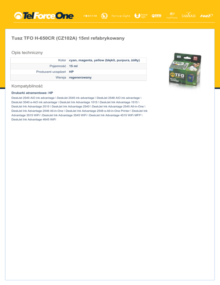 Tusz TFO H-650CR (CZ102A) 15ml refabrykowany Opis techniczny Kolor cyan, magenta, yellow (błękit, purpura, żółty) Pojemność 15 ml Producent urządzeń HP Wersja regenerowany Kompatybilność Drukarki atramentowe: HP DeskJet 2545 AiO ink advantage \ DeskJet 2545 ink advantage \ DeskJet 2546 AiO ink advantage \ DeskJet 3540 e-AiO ink advantage \ DeskJet Ink Advantage 1015 \ DeskJet Ink Advantage 1515 \ DeskJet Ink Advantage 2515 \ DeskJet Ink Advantage 2540 \ DeskJet Ink Advantage 2545 All-in-One \ DeskJet Ink Advantage 2546 All-in-One \ DeskJet Ink Advantage 2548 e-All-in-One Printer \ DeskJet Ink Advantage 3515 WiFi \ DeskJet Ink Advantage 3545 WiFi \ DeskJet Ink Advantage 4515 WiFi MFP \ DeskJet Ink Advantage 4645 WiFi