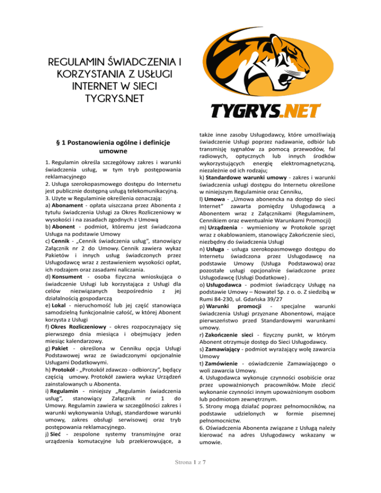 REGULAMIN ŚWIADCZENIA I KORZYSTANIA Z USŁUGI INTERNET W SIECI TYGRYS.NET § 1 Postanowienia ogólne i definicje umowne 1. Regulamin określa szczegółowy zakres i warunki świadczenia usług, w tym tryb postępowania reklamacyjnego 2. Usługa szerokopasmowego dostępu do Internetu jest publicznie dostępną usługą telekomunikacyjną. 3. Użyte w Regulaminie określenia oznaczają: a) Abonament - opłata uiszczana przez Abonenta z tytułu świadczenia Usługi za Okres Rozliczeniowy w wysokości i na zasadach zgodnych z Umową b) Abonent - podmiot, któremu jest świadczona Usługa na podstawie Umowy c) Cennik - „Cennik świadczenia usług”, stanowiący Załącznik nr 2 do Umowy. Cennik zawiera wykaz Pakietów i innych usług świadczonych przez Usługodawcę wraz z zestawieniem wysokości opłat, ich rodzajem oraz zasadami naliczania. d) Konsument - osoba fizyczna wnioskująca o świadczenie Usługi lub korzystająca z Usługi dla celów niezwiązanych bezpośrednio z jej działalnością gospodarczą e) Lokal - nieruchomość lub jej część stanowiąca samodzielną funkcjonalnie całość, w której Abonent korzysta z Usługi f) Okres Rozliczeniowy - okres rozpoczynający się pierwszego dnia miesiąca i obejmujący jeden miesiąc kalendarzowy. g) Pakiet - określona w Cenniku opcja Usługi Podstawowej wraz ze świadczonymi opcjonalnie Usługami Dodatkowymi. h) Protokół - „Protokół zdawczo - odbiorczy”, będący częścią umowy. Protokół zawiera wykaz Urządzeń zainstalowanych u Abonenta. i) Regulamin - niniejszy „Regulamin świadczenia usług”, stanowiący Załącznik nr 1 do Umowy. Regulamin zawiera w szczególności zakres i warunki wykonywania Usługi, standardowe warunki umowy, zakres obsługi serwisowej oraz tryb postępowania reklamacyjnego. j) Sieć - zespolone systemy transmisyjne oraz urządzenia komutacyjne lub przekierowujące, a także inne zasoby Usługodawcy, które umożliwiają świadczenie Usługi poprzez nadawanie, odbiór lub transmisję sygnałów za pomocą przewodów, fal radiowych, optycznych lub innych środków wykorzystujących energię elektromagnetyczną, niezależnie od ich rodzaju; k) Standardowe warunki umowy - zakres i warunki świadczenia usługi dostępu do Internetu określone w niniejszym Regulaminie oraz Cenniku, l) Umowa - „Umowa abonencka na dostęp do sieci Internet” zawarta pomiędzy Usługodawcą a Abonentem wraz z Załącznikami (Regulaminem, Cennikiem oraz ewentualnie Warunkami Promocji) m) Urządzenia - wymieniony w Protokole sprzęt wraz z okablowaniem, stanowiący Zakończenie sieci, niezbędny do świadczenia Usługi n) Usługa - usługa szerokopasmowego dostępu do Internetu świadczona przez Usługodawcę na podstawie Umowy (Usługa Podstawowa) oraz pozostałe usługi opcjonalnie świadczone przez Usługodawcę (Usługi Dodatkowe) . o) Usługodawca - podmiot świadczący Usługę na podstawie Umowy – Nowatel Sp. z o. o. Z siedzibą w Rumi 84-230, ul. Gdańska 39/27 p) Warunki promocji - specjalne warunki świadczenia Usługi przyznane Abonentowi, mające pierwszeństwo przed Standardowymi warunkami umowy. r) Zakończenie sieci - fizyczny punkt, w którym Abonent otrzymuje dostęp do Sieci Usługodawcy. s) Zamawiający - podmiot wyrażający wolę zawarcia Umowy t) Zamówienie - oświadczenie Zamawiającego o woli zawarcia Umowy. 4. Usługodawca wykonuje czynności osobiście oraz przez upoważnionych pracowników. Może zlecić wykonanie czynności innym upoważnionym osobom lub podmiotom zewnętrznym. 5. Strony mogą działać poprzez pełnomocników, na podstawie udzielonych w formie pisemnej pełnomocnictw. 6. Oświadczenia Abonenta związane z Usługą należy kierować na adres Usługodawcy wskazany w umowie. Strona 1 z 7 7. Uprawnienia i obowiązki Abonenta określone w Regulaminie stosuje się odpowiednio do Zamawiającego. § 2 Zakres i warunki świadczenia Usługi 1. Usługodawca świadczy Usługę Podstawową oraz związane z Usługą Podstawową Usługi Dodatkowe 2. Usługa jest świadczona na obszarze działania Usługodawcy. 3. Szczegółowy zakres Usługi świadczonej Abonentowi określa Umowa. 4. W ramach Abonamentu z tytułu świadczonej Usługi Usługodawca zapewnia: a) Usługę Podstawową, zgodnie z wybranym Pakietem b) Usługi Dodatkowe, w przypadku ich przypisania do wybranego Pakietu c) obsługę serwisową 5. Usługę Podstawową stanowi usługa szerokopasmowego dostępu do Internetu. Usługa ta polega na udostępnieniu stałego, całodobowego połączenia z ogólnoświatową siecią komputerową, łączącą lokalne sieci, korzystającą z pakietowego protokołu komunikacyjnego TCP/IP. 6. Usługi Dodatkowe są związane z Usługą Podstawową i mogą obejmować w szczególności: konto pocztowe, hosting, publiczny adres IP. Z tytułu świadczenia Usług Dodatkowych Usługodawca może pobierać dodatkową opłatę. 7. Obsługa serwisowa obejmuje: a) instalację Urządzeń i uruchomienie Usługi w celu rozpoczęcia świadczenia Usług b) monitoring Sieci, c) usuwanie usterek, d) umożliwienie uzyskania informacji o: dostępnych Usługach świadczonych przez Usługodawcę, stanie Usług w ramach Pakietu, realizacji zamówień Abonenta i zgłoszonych usterek e) zgłaszanie reklamacji oraz pomoc techniczna w związku ze świadczoną Usługą. 8. Obsługa serwisowa w zakresie wskazanym w lit. d) i e) może być wykonywana w formie telefonicznej, listownej, mailowej lub innej udostępnionej przez Usługodawcę. 9. W ramach Usługi, Abonent otrzymuje od Usługodawcy konto poczty elektronicznej (indywidualny adres poczty elektronicznej) . 10. Abonent zobowiązuje się do korzystania z adresu poczty elektronicznej zgodnie z Umowa i Regulaminem § 3 Zamówienie Usługi 1. Abonentem może zostać każdy podmiot ubiegający się o świadczenie Usługi na obszarze działania Usługodawcy, jeżeli nie zachodzą negatywne przesłanki zawarcia Umowy wskazane w Umowie oraz przepisach prawa. 2. Zamó