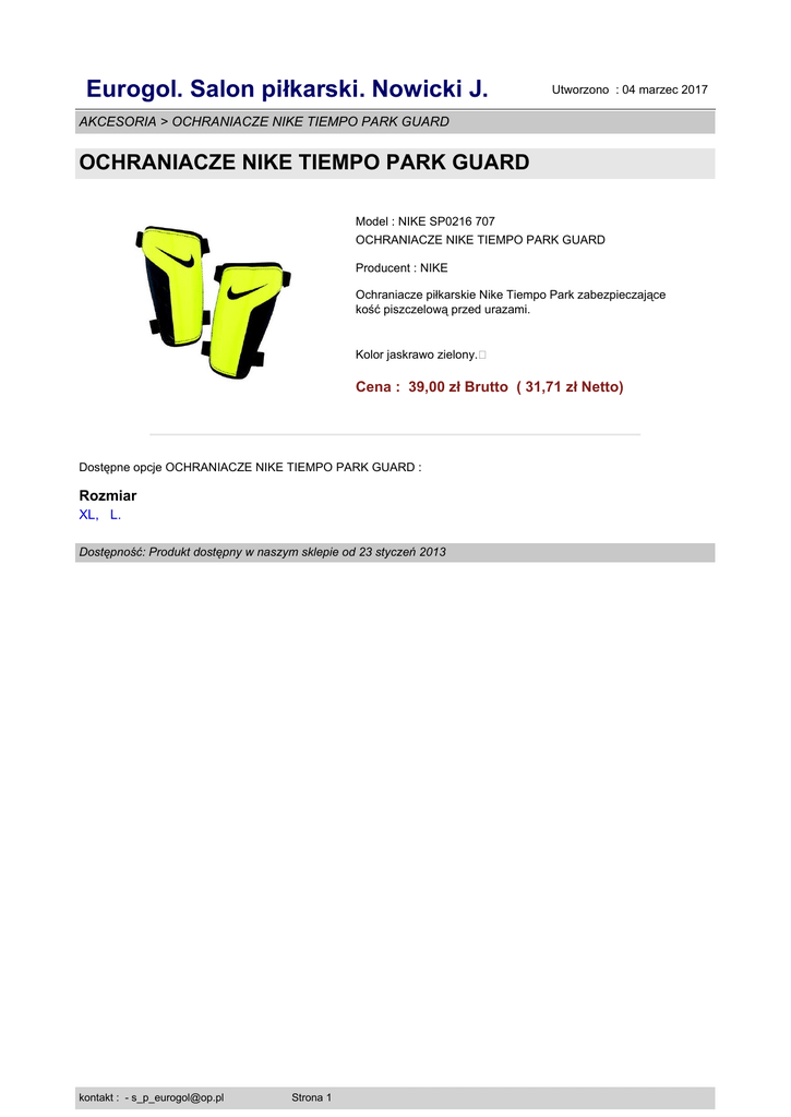 Eurogol. Salon piłkarski. Nowicki J. Utworzono : 04 marzec 2017 AKCESORIA > OCHRANIACZE NIKE TIEMPO PARK GUARD OCHRANIACZE NIKE TIEMPO PARK GUARD Model : NIKE SP0216 707 OCHRANIACZE NIKE TIEMPO PARK GUARD Producent : NIKE Ochraniacze piłkarskie Nike Tiempo Park zabezpieczające kość piszczelową przed urazami. Kolor jaskrawo zielony.� Cena : 39,00 zł Brutto ( 31,71 zł Netto) Dostępne opcje OCHRANIACZE NIKE TIEMPO PARK GUARD : Rozmiar XL, L. Dostępność: Produkt dostępny w naszym sklepie od 23 styczeń 2013 kontakt : - [email protected] Strona 1