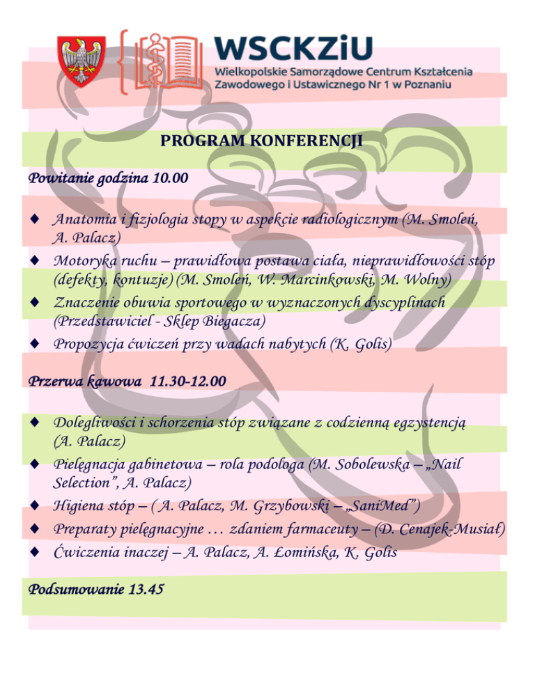 PROGRAM KONFERENCJI Powitanie godzina 10.00 Anatomia i fizjologia stopy w aspekcie radiologicznym (M. Smoleń, A. Palacz) Motoryka ruchu – prawidłowa postawa ciała, nieprawidłowości stóp (defekty, kontuzje) (M. Smoleń, W. Marcinkowski, M. Wolny) Znaczenie obuwia sportowego w wyznaczonych dyscyplinach (Przedstawiciel - Sklep Biegacza) Propozycja ćwiczeń przy wadach nabytych (K. Golis) Przerwa kawowa 11.30-12.00 Dolegliwości i schorzenia stóp związane z codzienną egzystencją (A. Palacz) Pielęgnacja gabinetowa – rola podologa (M. Sobolewska – „Nail Selection”, A. Palacz) Higiena stóp – ( A. Palacz, M. Grzybowski – „SaniMed”) Preparaty pielęgnacyjne … zdaniem farmaceuty – (D. Cenajek-Musiał) Ćwiczenia inaczej – A. Palacz, A. Łomińska, K. Golis Podsumowanie 13.45