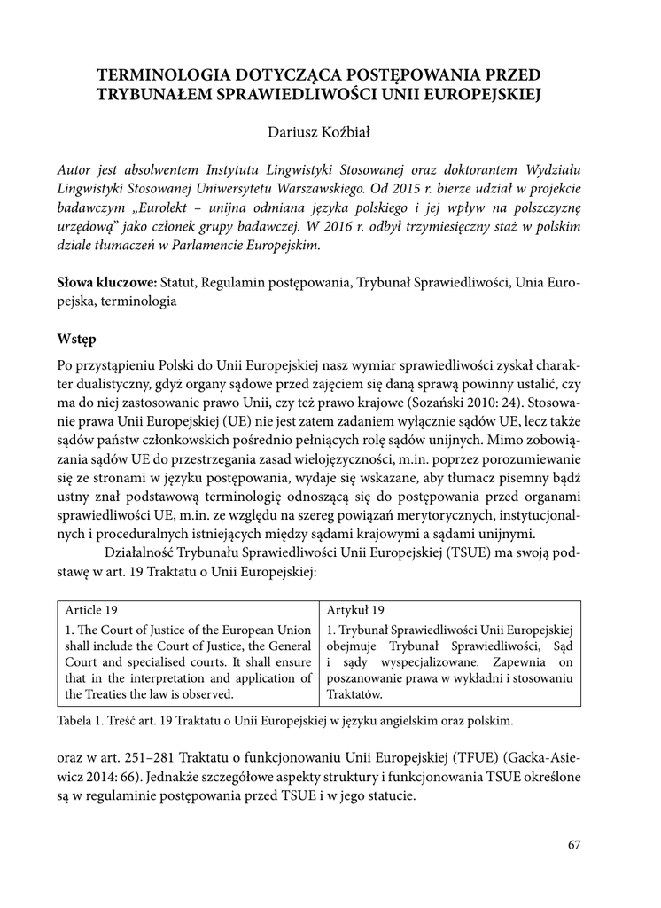 TERMINOLOGIA DOTYCZĄCA POSTĘPOWANIA PRZED TRYBUNAŁEM SPRAWIEDLIWOŚCI UNII EUROPEJSKIEJ Dariusz Koźbiał Autor jest absolwentem Instytutu Lingwistyki Stosowanej oraz doktorantem Wydziału Lingwistyki Stosowanej Uniwersytetu Warszawskiego. Od 2015 r. bierze udział w projekcie badawczym „Eurolekt – unijna odmiana języka polskiego i jej wpływ na polszczyznę urzędową” jako członek grupy badawczej. W 2016 r. odbył trzymiesięczny staż w polskim dziale tłumaczeń w Parlamencie Europejskim. Słowa kluczowe: Statut, Regulamin postępowania, Trybunał Sprawiedliwości, Unia Europejska, terminologia Wstęp Po przystąpieniu Polski do Unii Europejskiej nasz wymiar sprawiedliwości zyskał charakter dualistyczny, gdyż organy sądowe przed zajęciem się daną sprawą powinny ustalić, czy ma do niej zastosowanie prawo Unii, czy też prawo krajowe (Sozański 2010: 24). Stosowanie prawa Unii Europejskiej (UE) nie jest zatem zadaniem wyłącznie sądów UE, lecz także sądów państw członkowskich pośrednio pełniących rolę sądów unijnych. Mimo zobowiązania sądów UE do przestrzegania zasad wielojęzyczności, m.in. poprzez porozumiewanie się ze stronami w języku postępowania, wydaje się wskazane, aby tłumacz pisemny bądź ustny znał podstawową terminologię odnoszącą się do postępowania przed organami sprawiedliwości UE, m.in. ze względu na szereg powiązań merytorycznych, instytucjonalnych i proceduralnych istniejących między sądami krajowymi a sądami unijnymi. Działalność Trybunału Sprawiedliwości Unii Europejskiej (TSUE) ma swoją podstawę w art. 19 Traktatu o Unii Europejskiej: Article 19 1. The Court of Justice of the European Union shall include the Court of Justice, the General Court and specialised courts. It shall ensure that in the interpretation and application of the Treaties the law is observed. Artykuł 19 1. Trybunał Sprawiedliwości Unii Europejskiej obejmuje Trybunał Sprawiedliwości, Sąd i sądy wyspecjalizowane. Zapewnia on poszanowanie prawa w wykładni i stosowaniu Traktatów. Tabela 1. Treść art. 19 Traktatu o Unii Europejskiej w języku angielskim oraz polskim. oraz w art. 251–281 Traktatu o funkcjonowaniu Unii Europejskiej (TFUE) (Gacka-Asiewicz 2014: 66). Jednakże szczegółowe aspekty struktury i funkcjonowania TSUE określone są w regulaminie postępowania przed TSUE i w jego statucie. 67 Dariusz Koźbiał Celem artykułu jest przedstawienie informacji na temat składu Trybunału Sprawiedliwości UE, jego kompetencji, trybu postępowania przed nim oraz terminologii anglojęzycznej związanej z działalnością tej instytucji. Za źródło informacji (uzupełnionych informacjami z wybranych źródeł książkowych) i tłumaczeń terminów posłużyła oficjalna strona internetowa Trybunału (http://curia.europa.eu). W artykule przedstawiono ponadto tabelę zawierającą terminologię w trzech głównych językach urzędowych UE, tj. angielskim, francuskim i niemieckim (tabela uwzględnia również ekwiwalenty polskie), opracowaną w oparciu o oficjalne tłumaczenia Statutu TSUE oraz Regulaminu postępowania przed TSUE. 1. Trybunał Sprawiedliwości Unii Europejskiej Trybunał Sprawiedliwości to jeden z trzech sądów wchodzących w skład Trybunału Sprawiedliwości Unii Europejskiej1 (Court of Justice of the European Union) stanowiącego instytucję sądowniczą UE (EU’s judicial institution) (Reinisch 2012: 78). Ze względu na niedookreśloność źródeł prawa pierwotnego oraz wtórnego Trybunał zyskał możliwość wniesienia znacznego wkładu w rozwój acquis (Davies 2013: 99), a jego orzecznictwo odgrywa ważną rolę w wykładni i rozumieniu całości prawa UE (Sozański 2010: 26). Trybunał w swojej działalności zajmuje się głównie przekazywanymi przez sądy krajowe wnioskami o wydanie orzeczenia w trybie prejudycjalnym, skargami o stwierdzenie nieważności i skargami o stwierdzenie uchybienia (Reinisch 2012: 81). Dwoma pozostałymi sądami są: Sąd (General Court) i Sąd do spraw Służby Publicznej (Civil Service Tribunal). Zadaniem Trybunału, Sądu i Sądu do spraw Służby Publicznej jest zapewnianie poszanowania prawa w wykładni i stosowaniu traktatów (to ensure that in the interpretation and application of the Treaties the law is observed) stanowiących element prawa pierwotnego UE (EU primary legislation), w szczególności poprzez kontrolowanie legalności aktów unijnych (review of legality of Union acts). Sąd orzeka w sprawach o stwierdzenie nieważności przedłożonych przez osoby fizyczne i przedsiębiorstwa oraz, w niektórych przypadkach, przez rządy państw członkowskich. W praktyce oznacza to, że Sąd orzeka przede wszystkim w sprawach dotyczących prawa konkurencji, pomocy państwa, handlu, rolnictwa i znaków towarowych. Sąd do spraw Służby Publicznej orzeka w sporach między UE a urzędnikami służby cywilnej UE na mocy art. 270 TFUE (Borchardt 2011: 110). 2. Skład Trybunału Sprawiedliwości (composition): W skład Trybunału Sprawiedliwości wchodzi 28 sędziów (jeden sędzia z każdego państwa członkowskiego2) oraz 11 rzeczników generalnych (Advocates General) mianowanych 1 Warto zauważyć, że nazwa Europejski Trybunał Sprawiedliwości (European Court of Juctice) jest jedynie nazwą potoczną, a nazwa oficjalna to Trybunał Sprawiedliwości Unii Europejskiej (Davies 2013: 12). 2 Por. Art. 19 ust. 2 TUE – „W skład Trybunału Sprawiedliwości wchodzi jeden sędzia z każdego 68 Terminologia dotycząca postępowania przed Trybunałem Sprawiedliwości Unii Europejskiej (appointed) za wspólnym porozumieniem (jointly) przez rządy krajów UE, po konsultacji z komitetem, którego zadaniem jest opiniowanie, czy kandydaci są odpowiedni do pełnienia danej funkcji (suitability to perform the duties concerned), na okres sześciu lat (Gacka-Asiewicz 2014: 67). Mandat jest odnawialny (the term of office is renewable). Sędziami i rzecznikami generalnymi mog