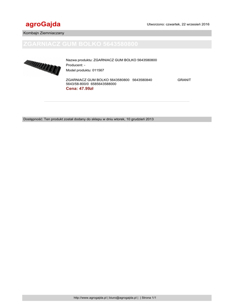 agroGajda Utworzono: czwartek, 22 wrzesień 2016 Kombajn Ziemniaczany ZGARNIACZ GUM BOLKO 5643580800 Nazwa produktu: ZGARNIACZ GUM BOLKO 5643580800 Producent: Model produktu: 011567 ZGARNIACZ GUM BOLKO 5643580800 5643580840 5643/58-800/0 6585643588000 Cena: 47.99zł Dostępność: Ten produkt został dodany do sklepu w dniu wtorek, 10 grudzień 2013 http://www.agrogajda.pl | [email protected] | | Strona 1/1 GRANIT