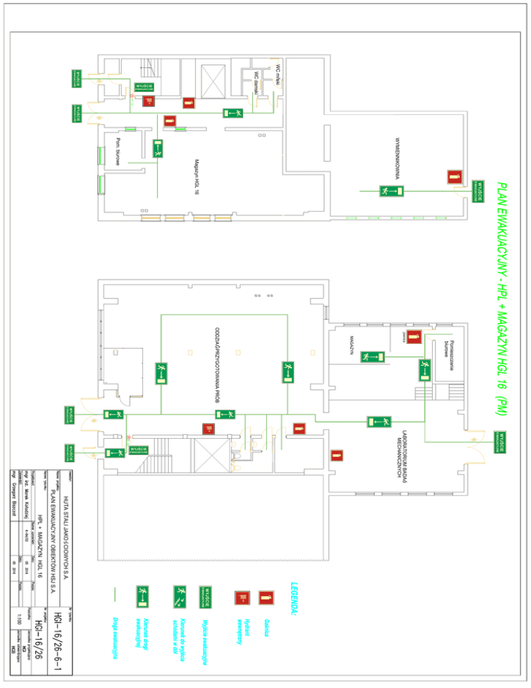 WC męski WC damski WYMIENNIKOWNIA Magazyn HGL 16 Pom. biurowe Pomieszczenie biurowe piwnica MAGAZYN ODDZIAŁ PRZYGOTOWANIA PRÓB LABORATORIUM BADAŃ MECHANICZNYCH HUTA STALI JAKO ŚCIOWYCH S.A. PLAN EWAKUACYJNY OBIEKTÓW HSJ S.A. HPL + MAGAZYN HGL 16