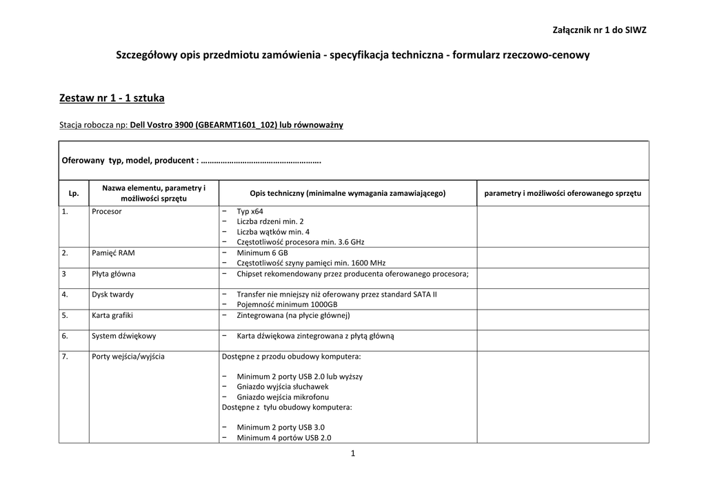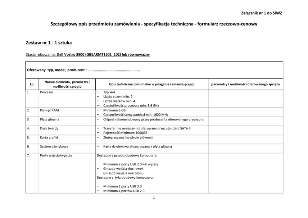 Załącznik nr 1 do SIWZ Szczegółowy opis przedmiotu zamówienia - specyfikacja techniczna - formularz rzeczowo-cenowy Zestaw nr 1 - 1 sztuka Stacja robocza np: Dell Vostro 3900 (GBEARMT1601_102) lub równoważny Oferowany typ, model, producent : ………………………………………………. Lp. Nazwa elementu, parametry i możliwości sprzętu Opis techniczny (minimalne wymagania zamawiającego) − − − − − − − Typ x64 Liczba rdzeni min. 2 Liczba wątków min. 4 Częstotliwość procesora min. 3.6 GHz Minimum 6 GB Częstotliwość szyny pamięci min. 1600 MHz Chipset rekomendowany przez producenta oferowanego procesora; Karta grafiki − − − Transfer nie mniejszy niż oferowany przez standard SATA II Pojemność minimum 1000GB Zintegrowana (na płycie głównej) 6. System dźwiękowy − Karta dźwiękowa zintegrowana z płytą główną 7. Porty wejścia/wyjścia Dostępne z przodu obudowy komputera: 1. Procesor 2. Pamięć RAM 3 Płyta główna 4. Dysk twardy 5. − Minimum 2 porty USB 2.0 lub wyższy − Gniazdo wyjścia słuchawek − Gniazdo wejścia mikrofonu Dostępne z tyłu obudowy komputera: − − Minimum 2 porty USB 3.0 Minimum 4 portów USB 2.0 1 parametry i możliwości oferowanego sprzętu Załącznik nr 1 do SIWZ 8. Interfejs sieciowy − − − − − 9. Napędy optyczne − 10. Klawiatura 11. Urządzenie wskazujące (Mysz) − − − 12. Obudowa 13. Bezpieczeństwo 14. Poziom emitowanego hałasu Minimum 1 port VGA Minimum 1 port HDMI Minimum 1 gniazdo wejścia/wyjścia audio Minimum 1 port interfejsu sieciowego RJ-45 Karta sieciowa zintegrowana 100/1000, gniazdo RJ-45 wewnętrzny, zapis/odczyt DVD Standardowa klawiatura w układzie US Trwałe oznaczenie logo producenta komputera Bezprzewodowa dwuprzyciskowa mysz optyczna lub laserowa z przewijaniem (rolką) − Trwałe oznaczenie logo producenta komputera − Miniwieża fabrycznie przygotowana do pracy w pionie − Trwałe oznaczenie logo producenta komputera − Możliwość startu komputera z urządzeń podłączanych przez port USB, Wg norm ISO 7779 i 9296 − Nie więcej niż 28 dB w normalnym trybie pracy (z pracującym dyskiem, bez napędów optycznych) 15. Zarządzanie energią − Tak 16. System operacyjny − − − 17. Certyfikaty − MS Windows 7 Professional SP1 64-bit PL Preinstalowany fabrycznie przez producenta komputera, Zawierający wszystkie niezbędne do prawidłowego działania komputera sterowniki. Certyfikat ISO 9001:2000 i 14001 lub równoważny dla producenta komputera na proces projektowania i produkcji oferowanego sprzętu, Certyfikat lub deklaracja zgodności CE dla oferowanego sprzętu, Certyfikat lub deklaracja zgodności komputera z normą Energy Star 5.0 lub wyższy Certyfikat dla komputera potwierdzający wymagany poziom hałasu dla oferowanego modelu komputera zgodny z normami ISO 9001 lub równoważny − − − 2 Załącznik nr 1 do SIWZ 18. Kopie zainstalowanego oprogramowania Kopia preinstalowanego systemu operacyjnego oraz dodatkowego oprogramowania na płytach lub oprogramowanie umożliwiające przygotowanie w/w płyt na nośnikach opracowane przez producenta oferowanego sprzętu, umożliwiające odtworzenie do poziomu preinstalowanego. 19. Części zamienne Dostępność oryginalnych części zamiennych przez okres min. 2 lat po upływie gwarancji 20 Dokumentacja Dokumentacja techniczna standardowa dla każdego zestawu 21. Oprogramowanie użytkowe MS Office 2013 dla Użyt. Domowych i Małych Firm PL (Zamawiający nie dopuszcza w ofercie licencji EDUKACYJNYCH) 22. Gwarancja Minimum 36 miesięcy od daty dostawy. Serwis wykonywany w siedzibie zamawiającego z czasem reakcji w następnym dniu roboczym (NBD). Serwis realizowany przez Producenta, lub Autoryzowanego Partnera Serwisowego Producenta. 23. Akcesoria Kabel zasilający, kabel sieciowy min. 2M Kat 5e, dysk zewnętrzny USB 2,5” lub 3,5” o pojemności min. 1TB Liczba stacji roboczych Cena brutto za 1 stację roboczą 1 Monitor LED np: Benq GL2250HM 9H.L6XLA.TPE lub równoważny Oferowany typ, model, producent : ……………………………………………….. Lp. 1. Nazwa elementu, parametry i możliwości sprzętu Typ Opis techniczny (minimalne wymagania zamawiającego) LED panoramiczny kolorowy 3 parametry i możliwości oferowanego sprzętu Załącznik nr 1 do SIWZ matryca TN 2. Przekątna ekranu Min 21,5” 3. Wielkość plamki Maksymalnie 0.248 mm x 0.248 mm 4. Rozdzielczość fizyczna Co najmniej 1920x1080 5. Jasność Min 250 cd/m2 6. Kontrast 1000:1 7. Czas rekcji Maksimum 5 ms 8. Kąt widzenia Min. (lewo/prawo;góra/dół) (wsp. kontr.>=10) 170/160 9. Wyświetlane kolory Minimum 16,7 mln 10. Wejścia sygnałowe Trzy wejścia: Analogowe złącze D-sub 15 pin Cyfrowe złącze DVI Złącze HDMI 11 Regulacja parametrów On-Screen-Display (OSD) 12. Parametry regulowane 13. Regulacja kąta pochylenia Jasność Kontrast Temperatura kolorów Regulacja obrazu: pozycja pozioma/pionowa, rozmiar w poziomie/pionie Pochylanie (dół/góra) -5do +15(do przodu / do tyłu) 14. Bezpieczeństwo Certyfikat lub deklaracja zgodności CE dla oferowanego sprzętu 15. Złącza wejściowe 15-stykowe D-Sub 4 Załącznik nr 1 do SIWZ DVI-D HDMI 16. Zasilacz Wewnętrzny 17. Zarządzanie energią Tak 18. Akcesoria w zestawie 19. Sterowniki 20. Kolorystyka Kabel zasilający Kabel sygnałowy z wtykami D-Sub Kabel sygnałowy z wtykami DVI Kabel sygnałowy z wtykami HDMI Oprogramowanie dodatkowe (sterowniki) o ile jest konieczne do zapewnienia poprawnej pracy monitora pod systemem MS Windows 7 Czarny 21 Gwarancja Minimum 36 miesięcy Liczba monitorów 1 Cena brutto za 1 monitor Zasilacz awaryjny UPS np: Ever Duo II 1000 1000VA 600W, UPS Eaton 5SC lub równoważny Oferowany typ, model, producent : ………………………………………………. Lp. Nazwa elementu, parametry i możliwości sprzętu Zasilacz awaryjny UPS 1. Opis techniczny (minimalne wymagania zamawiającego) - minimum cztery gniazda wy