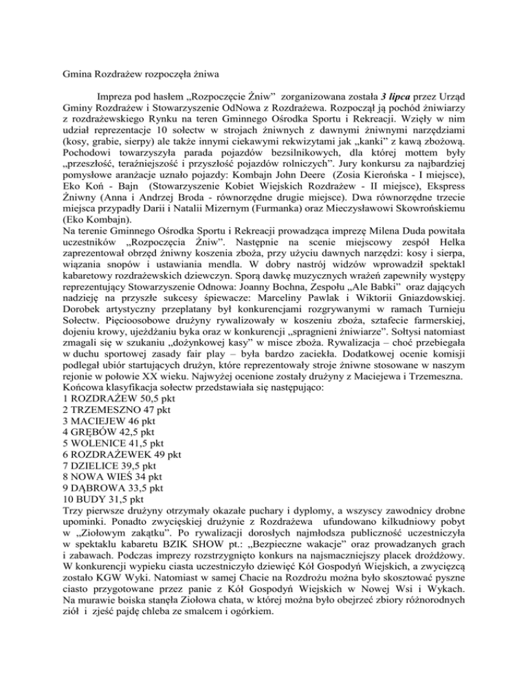 Gmina Rozdrażew rozpoczęła żniwa Impreza pod hasłem „Rozpoczęcie Żniw” zorganizowana została 3 lipca przez Urząd Gminy Rozdrażew i Stowarzyszenie OdNowa z Rozdrażewa. Rozpoczął ją pochód żniwiarzy z rozdrażewskiego Rynku na teren Gminnego Ośrodka Sportu i Rekreacji. Wzięły w nim udział reprezentacje 10 sołectw w strojach żniwnych z dawnymi żniwnymi narzędziami (kosy, grabie, sierpy) ale także innymi ciekawymi rekwizytami jak „kanki” z kawą zbożową. Pochodowi towarzyszyła parada pojazdów bezsilnikowych, dla której mottem były „przeszłość, teraźniejszość i przyszłość pojazdów rolniczych”. Jury konkursu za najbardziej pomysłowe aranżacje uznało pojazdy: Kombajn John Deere (Zosia Kierońska - I miejsce), Eko Koń - Bajn (Stowarzyszenie Kobiet Wiejskich Rozdrażew - II miejsce), Ekspress Żniwny (Anna i Andrzej Broda - równorzędne drugie miejsce). Dwa równorzędne trzecie miejsca przypadły Darii i Natalii Mizernym (Furmanka) oraz Mieczysławowi Skowrońskiemu (Eko Kombajn). Na terenie Gminnego Ośrodka Sportu i Rekreacji prowadząca imprezę Milena Duda powitała uczestników „Rozpoczęcia Żniw”. Następnie na scenie miejscowy zespół Helka zaprezentował obrzęd żniwny koszenia zboża, przy użyciu dawnych narzędzi: kosy i sierpa, wiązania snopów i ustawiania mendla. W dobry nastrój widzów wprowadził spektakl kabaretowy rozdrażewskich dziewczyn. Sporą dawkę muzycznych wrażeń zapewniły występy reprezentujący Stowarzyszenie Odnowa: Joanny Bochna, Zespołu „Ale Babki” oraz dających nadzieję na przyszłe sukcesy śpiewacze: Marceliny Pawlak i Wiktorii Gniazdowskiej. Dorobek artystyczny przeplatany był konkurencjami rozgrywanymi w ramach Turnieju Sołectw. Pięcioosobowe drużyny rywalizowały w koszeniu zboża, sztafecie farmerskiej, dojeniu krowy, ujeżdżaniu byka oraz w konkurencji „spragnieni żniwiarze”. Sołtysi natomiast zmagali się w szukaniu „dożynkowej kasy” w misce zboża. Rywalizacja – choć przebiegała w duchu sportowej zasady fair play – była bardzo zaciekła. Dodatkowej ocenie komisji podlegał ubiór startujących drużyn, które reprezentowały stroje żniwne stosowane w naszym rejonie w połowie XX wieku. Najwyżej ocenione zostały drużyny z Maciejewa i Trzemeszna. Końcowa klasyfikacja sołectw przedstawiała się następująco: 1 ROZDRAŻEW 50,5 pkt 2 TRZEMESZNO 47 pkt 3 MACIEJEW 46 pkt 4 GRĘBÓW 42,5 pkt 5 WOLENICE 41,5 pkt 6 ROZDRAŻEWEK 49 pkt 7 DZIELICE 39,5 pkt 8 NOWA WIEŚ 34 pkt 9 DĄBROWA 33,5 pkt 10 BUDY 31,5 pkt Trzy pierwsze drużyny otrzymały okazałe puchary i dyplomy, a wszyscy zawodnicy drobne upominki. Ponadto zwycięskiej drużynie z Rozdrażewa ufundowano kilkudniowy pobyt w „Ziołowym zakątku”. Po rywalizacji dorosłych najmłodsza publiczność uczestniczyła w spektaklu kabaretu BZIK SHOW pt.: „Bezpieczne wakacje” oraz prowadzanych grach i zabawach. Podczas imprezy rozstrzygnięto konkurs na najsmaczniejszy placek drożdżowy. W konkurencji wypieku ciasta uczestniczyło dziewięć Kół Gospodyń Wiejskich, a zwycięzcą zostało KGW Wyki. Natomiast w samej Chacie na Rozdrożu można było skosztować pyszne ciasto przygotowane przez panie z Kół Gospodyń Wiejskich w Nowej Wsi i Wykach. Na murawie boiska stanęła Ziołowa chata, w której można było obejrzeć zbiory różnorodnych ziół i zjeść pajdę chleba ze smalcem i ogórkiem. Uczestnicy obchodów mogli spróbować swoich sił w Mistrzostwach Gminy w dojeniu krowy oraz ujeżdżaniu byka na czas. W konkurencji dojenia krowy wyłoniono zwycięzców w kategoriach: Mężczyźni I - Krzysztof Waliszewski II - Mirosław Jarocki III - Łukasz Gęstwa Kobiety I - Magdalena Kolenda II - Ewa Kaczmarek III - Monika Dąbrowska Natomiast w ujeżdżaniu byka bezkonkurencyjni okazali się w kategoriach: Mężczyźni I - Marcin Drygas II - Rafał Chudy III - Karol Patalas Kobiety I - Anna Kasprzak II - Ewa Kaczmarek III - Barbara Kasprzak Młodzież I - Marcin Kramarczyk II - Szymon Bartowiak III - Bogusław Wygralak Wójt Gminy Mariusz Dymarski i Maria Stasik Prezes Stowarzyszenia OdNowa wręczyli najlepszym dyplomy i upominki, a zwycięzcom także pamiątkowe puchary. Wieczorna część imprezy rozpoczęła się od koncertu zespołu ZAYAZD. Gdański zespół, który od 30 lat tworzy muzykę country i folku uraczył słuchaczy swoimi hitami i ciekawymi aranżacjami poezji Mickiewicza. Imprezę zakończyła zabawa taneczna przy muzyce zespołu REXONA.