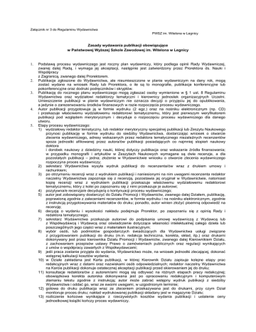 Załącznik nr 3 do Regulaminu Wydawnictwa PWSZ im. Witelona w Legnicy Zasady wydawania publikacji obowiązujące w Państwowej Wyższej Szkole Zawodowej im. Witelona w Legnicy 1. 2. 3. 4. 5. Podstawą procesu wydawniczego jest roczny plan wydawniczy, który podlega opinii Rady Wydawniczej, zwanej dalej Radą, i wymaga jej akceptacji, następnie jest zatwierdzony przez Prorektora ds. Nauki i Współpracy z Zagranicą, zwanego dalej Prorektorem. Publikacje zgłoszone do Wydawnictwa, ale nieumieszczone w planie wydawniczym na dany rok, mogą zostać wydane na wniosek Rady lub Prorektora, o ile są to monografie, publikacje konferencyjne lub pokonferencyjne oraz dodruki podręczników i skryptów. Publikację do rocznego planu wydawniczego mogą zgłaszać osoby wymienione w § 1 ust. 8 Regulaminu Wydawnictwa oraz wydziałowi redaktorzy tematyczni i kierownicy jednostek organizacyjnych Uczelni. Umieszczenie publikacji w planie wydawniczym nie oznacza decyzji o przyjęciu jej do opublikowania, a jedynie o zarezerwowaniu środków finansowych w razie rozpoczęcia procesu wydawniczego. Autor publikacji przygotowuje ją w formie wydruku (2 egz.) oraz na nośniku elektronicznym (np. CD) i przekazuje właściwemu wydziałowemu redaktorowi tematycznemu, który jest pierwszym weryfikatorem publikacji pod względem merytorycznym i decyduje o rozpoczęciu procesu wydawniczego dla danego utworu. Etapy procesu wydawniczego: 1) wydziałowy redaktor tematyczny, lub redaktor merytoryczny specjalnej publikacji lub Zeszytu Naukowego przynosi publikację w formie wydruku do siedziby Wydawnictwa, dostarczając wniosek o otwarcie zlecenia wydawniczego, adresy wskazanych przez redaktora tematycznego niezależnych recenzentów spoza jednostki afiliowanej przez autora/ów publikacji posiadających co najmniej stopień naukowy doktora i dorobek naukowy z dziedziny nauki, której dotyczy publikacja oraz wskazanie źródła finansowania; w przypadku monografii i artykułów w Zeszytach Naukowych wymagane są dwie recenzje, a dla pozostałych publikacji – jedna; złożenie w Wydawnictwie wniosku o otwarcie zlecenia wydawniczego rozpoczyna proces wydawniczy; 2) sekretarz Wydawnictwa wysyła wydruk publikacji do recenzenta/ów wraz z drukiem umowy i rachunkiem; 3) po otrzymaniu recenzji wraz z wydrukiem publikacji i naniesionymi na nim uwagami recenzenta redaktor naczelny Wydawnictwa zapoznaje się z recenzją, pozostawia jej oryginał w Wydawnictwie, natomiast kopię recenzji wraz z wydrukiem publikacji przekazuje właściwemu wydziałowemu redaktorowi tematycznemu, który z kolei po zapoznaniu się z nimi przekazuje je autorowi; 4) pozytywna/e recenzja/e decyduje/ą o kontynuacji procesu wydawniczego; 5) autor jest zobowiązany dostarczyć do Działu Promocji i Wydawnictw, zwanego dalej Działem, publikację, poprawioną zgodnie z zaleceniami recenzentów, w formie wydruku i na nośniku elektronicznym, zgodnie z instrukcją przygotowywania materiałów do druku; ponadto, autor winien złożyć pisemną odpowiedź na recenzję; 6) decyzję o wydaniu i wysokości nakładu podejmuje Prorektor, po zapoznaniu się z opinią Rady i redaktora tematycznego; 7) sekretarz Wydawnictwa przekazuje autorowi do podpisania umowę wydawniczą z Wydawcą lub z Współwydawcą i Wydawcą oraz oświadczenie dotyczące własności intelektualnej całego dzieła lub poszczególnych jego części wraz z materiałem ilustracyjnym; 8) wybór osób, lub podmiotów gospodarczych świadczących dla Wydawnictwa usługi związane z przygotowaniem publikacji do druku (m.in. redakcja techniczna, korekta, skład, itp.) oraz drukarni dokonywany jest przez kierownika Działu Promocji i Wydawnictw, zwanego dalej Kierownikiem Działu, z zachowaniem przepisów ustawy Prawo o zamówieniach publicznych oraz regulacji wynikających z umów o współpracy zawartych z Współwydawcami; 9) jeśli praca zostanie przyjęta do wydania, Wydawnictwo może, na wniosek jednostki zlecającej, dokonać wstępnej kalkulacji kosztów wydania; 10) w Dziale zakładana jest Karta publikacji, w której Kierownik Działu zapisuje kolejne etapy prac redakcyjnych wraz z datami oraz nazwiskami osób odpowiedzialnych; redaktor naczelny Wydawnictwa na Karcie publikacji dokonuje ostatecznej akceptacji publikacji przed skierowaniem jej do druku; 11) konsultacje redaktora/ów z autorem/ami mogą się odbywać na różnych etapach pracy redakcyjnej; obowiązkowa korekta autorska dokonywana jest po opracowaniu redakcyjnym i komputerowym złamaniu tekstu zgodnie z instrukcją; autor może zabrać wstępny wydruk publikacji z siedziby Wydawnictwa i oddać go, wraz ze swoimi uwagami, w uzgodnionym terminie; 12) gotowa do druku publikacja wraz ze zleceniem przekazywana jest do drukarni, przy czym Dział monitoruje proces druku; nakład wydrukowanej publikacji składany jest w magazynie Działu; 13) rozliczenie końcowe wynikające z rzeczywistych kosztów wydania publikacji i ustalenie ceny jednostkowej książki kończy proces wydawniczy. 6. 7. 8. 9. 10. 11. 12. 13. Autor jest zobowiązany – przed zakończeniem procesu wydawniczego – do napisania streszczenia lub noty o swojej publikacji w języku polskim i angielskim lub w jednym z języków kongresowych, którą Wydawnictwo może wykorzystywać w celach promocyjnych, np. poprzez zamieszczenie jej na stronach internetowych. Rozliczenie końcowe wydania stanowi podstawę do wystawienia jednostce zlecającej dokumentu finansowego zgodnie z zasadami obowiązującymi na Uczelni. Nakład książki magazynowany jest w przeznaczonych do tego pomieszczeniach i dystrybuowany pod nadzorem Działu. Zasady dodrukowywania książek: 1) propozycję dodruku publikacji, na podstawie sugestii wydziałowego redaktora tematycznego lub zapotrzebowania odbiorców, redaktor naczelny Wydawnictwa składa autorowi; 2) decyzję o wysokości nakładu dodruku podejmuje Prorektor, po zapoznaniu się z opinią Kierownika Działu; 3) dodrukowywany tytuł umieszc