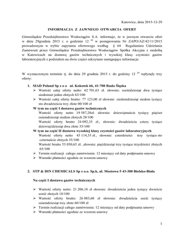Katowice, dnia 2015-12-29 INFORMACJA Z JAWNEGO OTWARCIA OFERT Górnośląskie Przedsiębiorstwo Wodociągów S.A. informuje, że w jawnym otwarciu ofert w dniu 29grudnia 2015 r. o godzinie 12 30 w postępowaniu Nr ZAPO/AZ/42/11/2015 prowadzonym w trybie zapytania ofertowego według § 64 Regulaminu Udzielania Zamówień przez Górnośląskie Przedsiębiorstwo Wodociągów Spółka Akcyjna z siedzibą w Katowicach na dostawę gazów technicznych i wysokiej klasy czystości gazów laboratoryjnych z podziałem na dwie części odczytano następujące informacje: W wyznaczonym terminie tj. do dnia 29 grudnia 2015 r. do godziny 12 oferty: 30 wpłynęły trzy 1. SIAD Poland Sp z o o ul. Kokotek 66, 41-700 Ruda Śląska Wartość całej oferty netto: 62 701,63 zł. słownie: sześćdziesiąt dwa tysiące siedemset jeden złotych 63/100 Wartość całej oferty brutto: 77 123,00 zł słownie: siedemdziesiąt siedem tysięcy sto dwadzieścia trzy złote 00/100 zł W tym na część I dostawa gazów technicznych Wartość oferty netto 19 587,28zł. słownie: dziewiętnaście tysięcy pięćset osiemdziesiąt siedem złotych 28/100 Wartość oferty brutto 24 092,35 zł., słownie: dwadzieścia cztery tysiące dziewięćdziesiąt dwa złote 35/100 W tym na część II dostawa wysokiej klasy czystości gazów laboratoryjnych Wartość oferty netto 43 114,35 zł., słownie: czterdzieści trzy tysiące sto czternaście złotych 35/100 Wartość brutto 53 030,65 zł. ,słownie: pięćdziesiąt trzy tysiące trzydzieści złotych 65/100 Termin realizacji całego zamówienia: 12 miesięcy od daty podpisania umowy Warunki płatności zgodnie ze wzorem umowy 2. STP & DIN CHEMICALS Sp z o.o. Sp.k, ul. Mostowa 5 43-300 Bielsko-Biała Na część I dostawa gazów technicznych Wartość oferty netto: 21 206,18 zł słownie: dwadzieścia jeden tysięcy dwieście sześć złotych 18/100 Wartość oferty brutto: 26 083,60 zł słownie: dwadzieścia sześć tysięcy osiemdziesiąt trzy złote 60/100 zł Termin realizacji całego zamówienia: 12 miesięcy od daty podpisania umowy Warunki płatności zgodnie ze wzorem umowy 1 3. Air Products Sp z o.o. ul. 17 stycznia 48, 02-146 Warszawa Wartość całej oferty netto: 57 305,63 zł. słownie: pięćdziesiąt siedem tysięcy trzysta pięć złotych 63/100 Wartość całej oferty brutto: 70 485,92 zł słownie: siedemdziesiąt tysięcy czterysta osiemdziesiąt pięć złotych 92/100 zł W tym na część I dostawa gazów technicznych Wartość oferty netto 20 909,50 zł. słownie: dwadzieścia tysięcy dziewięćset dziewięć złotych 50/100 Wartość oferty brutto 25 718,69 zł., słownie: dwadzieścia pięć tysięcy siedemset osiemnaście złotych 69/100 W tym na część II dostawa wysokiej klasy czystości gazów laboratoryjnych Wartość oferty netto 36 396,13 zł., słownie: trzydzieści sześć tysięcy trzysta dziewięćdziesiąt sześć złotych 13/100 Wartość brutto 44 767,23 zł. ,słownie: czterdzieści cztery tysiące siedemset sześćdziesiąt siedem złotych 23/100 Termin realizacji całego zamówienia: 12 miesięcy od daty podpisania umowy Warunki płatności zgodnie ze wzorem umowy Kopia AZ a/a 2