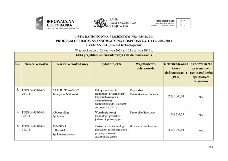 LISTA RANKINGOWA PROJEKTÓW NR: 4.3/42/2011 PROGRAM OPERACYJNY INNOWACYJNA GOSPODARKA, LATA 2007-2013 DZIAŁANIE 4.3 Kredyt technologiczny W ramach naboru: 20 czerwca 2011 r. – 21 czerwca 2011 r. Lista projektów rekomendowanych do dofinansowania Lp. Numer Wniosku 1. POIG.04.03.00-00261/11 2. POIG.04.03.00-00269/11 3. POIG.04.03.00-00312/11 Nazwa Wnioskodawcy Tytuł projektu Województwo/ miejscowość Zakup i wdrożenie technologii produkcji rur trzywarstwowych z wypełnieniem wzmacniającym, kluczem do poprawy oferty KujawskoPomorskie/Ciechocinek JG Consulting Sp. Jawna Wdrożenie nowej technologii produkcji jednostek pływających Pomorskie/Sztutowo RBB-STAL J. Borusiak Sp. Komandytowa Zastosowanie technologii Wielkopolskie/Jarocin plastycznego odkształcania przy wytwarzaniu zasobników ciepła P.P.U.H. "Euro-Plast" Remigiusz Waldowski Rekomendowana Końcowa liczba kwota przyznanych dofinansowania punktów/Liczba (PLN) spełnionych kryteriów 2 730 000,00 9/9 1 568 332,25 9/9 4 000 000,00 9/9 1/3 4. POIG.04.03.00-00335/11 5. POIG.04.03.00-00338/11 6. POIG.04.03.00-00- Przedsiębiorstwo Wielobranżowe Produkcja betonów wysokowartościowych w Marek Mackiewicz oparciu o innowacyjne rozwiązanie KWAZAR CORPORATION Sp. z o.o. Wdrożenie innowacyjnej technologii wytwarzania elementów wielkogabarytowych z tworzyw sztucznych Mazowieckie/Budy Grzybek Renova Sp. z o.o. Wdrożenie innowacyjnej technologii wytwarzania metalowych elementów usztywniających do profili z tworzyw sztucznych Łódzkie/Łódź Zakup i wdrożenie technologii produkcji kasetonu elewacyjnego z wykorzystaniem nanomiedzi Łódzkie/Łódź Gaweł Zakład Produkcji Śrub Sp. z o.o. Wdrożenie technologii produkcji wyrobów złącznych z gwintem ALFA Tech Podkarpackie/Palikówka KAMET Sp. z o.o. Wdrożenie nowej, innowacyjnej technologii produkcji mechanicznych zabezpieczeń mienia Warmińskomazurskie/Piątki 339/11 7. POIG.04.03.00-00- REX-BUD Sp. z o.o. 341/11 8. POIG.04.03.00-00344/11 9. POIG.04.03. 00-00-348/11 10. POIG.04.03. 00-00-351/11 Podlaskie/Łomża Netart S.A. Sp. Komandytowo- Akcyjna Wdrożenie technologii Małopolskie/Kraków "Dynamicznej chmury hostingu współdzielonego" w firmie NetArt 4 000 000,00 9/9 1 920 000,00 9/9 685 000,00 9/9 3 999 900,00 9/9 3 852 000,00 9/9 3 906 288,00 9/9 2 481 600,00 9/9 2/3 11. POIG.04.03. 00-00-364/11 Grupa 3 Stanisław Jasonek Sp. Jawna RAZEM Wdrożenie innowacyjnej technologii produkcji personalizowanych kart plastikowych Małopolskie/Kraków 2 880 122,00 9/9 32 023 242,25 3/3