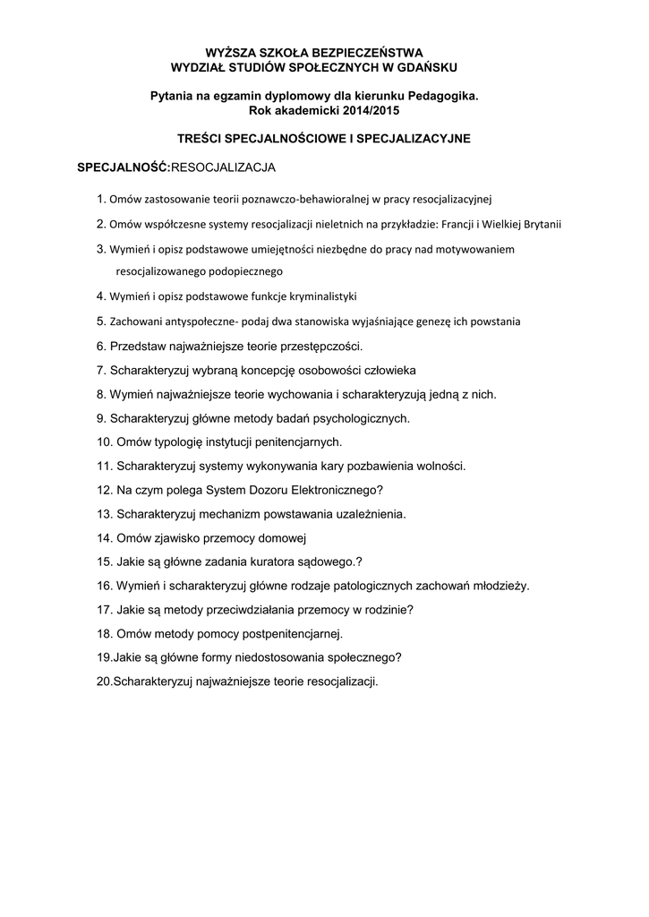 WYŻSZA SZKOŁA BEZPIECZEŃSTWA WYDZIAŁ STUDIÓW SPOŁECZNYCH W GDAŃSKU Pytania na egzamin dyplomowy dla kierunku Pedagogika. Rok akademicki 2014/2015 TREŚCI SPECJALNOŚCIOWE I SPECJALIZACYJNE SPECJALNOŚĆ:RESOCJALIZACJA 1. Omów zastosowanie teorii poznawczo-behawioralnej w pracy resocjalizacyjnej 2. Omów współczesne systemy resocjalizacji nieletnich na przykładzie: Francji i Wielkiej Brytanii 3. Wymień i opisz podstawowe umiejętności niezbędne do pracy nad motywowaniem resocjalizowanego podopiecznego 4. Wymień i opisz podstawowe funkcje kryminalistyki 5. Zachowani antyspołeczne- podaj dwa stanowiska wyjaśniające genezę ich powstania 6. Przedstaw najważniejsze teorie przestępczości. 7. Scharakteryzuj wybraną koncepcję osobowości człowieka 8. Wymień najważniejsze teorie wychowania i scharakteryzują jedną z nich. 9. Scharakteryzuj główne metody badań psychologicznych. 10. Omów typologię instytucji penitencjarnych. 11. Scharakteryzuj systemy wykonywania kary pozbawienia wolności. 12. Na czym polega System Dozoru Elektronicznego? 13. Scharakteryzuj mechanizm powstawania uzależnienia. 14. Omów zjawisko przemocy domowej 15. Jakie są główne zadania kuratora sądowego.? 16. Wymień i scharakteryzuj główne rodzaje patologicznych zachowań młodzieży. 17. Jakie są metody przeciwdziałania przemocy w rodzinie? 18. Omów metody pomocy postpenitencjarnej. 19.Jakie są główne formy niedostosowania społecznego? 20.Scharakteryzuj najważniejsze teorie resocjalizacji.