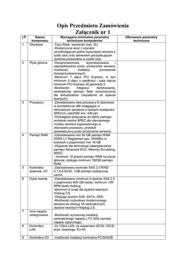 Opis Przedmiotu Zamówienia Załącznik nr 1 LP 1 Nazwa komponetu Obudowa 2 Płyta główna 3 Procesory 4 Pamięć RAM 5 Kontrolery dyskowe, I/O 6 Dyski twarde 7 Inne napędy zintegrowane Wymagane minimalne parametry techniczne komputerów -Typu Rack, wysokość max. 2U; -Dostarczona wraz z szynami umożliwiającymi pełne wysunięcie serwera z szafy rack oraz ramieniem porządkującym ułożenie przewodów w szafie rack; -Dwuprocesorowa, wyprodukowana i zaprojektowana przez producenta serwera, możliwość instalacji procesorów dziesięciordzeniowych; -Minimum 7 złącz PCI Express, w tym minimum 6 złącz o prędkości i typie złącza minimum PCI Express x8 generacji 3; -Możliwość integracji dedykowanej, wewnętrznej pamięci flash przeznaczonej dla wirtualizatora (niezależne od dysków twardych); -Zainstalowane dwa procesory 6-rdzeniowe w architekturze x86 osiągające w oferowanym serwerze w testach wydajności SPECint_rate2006 min. 436 pkt; -Wymagane dołączenie do oferty pełnego protokołu testów SPEC dla oferowanego modelu serwera wyposażonego w oferowane procesory, protokół poświadczony przez producenta serwera; -Zainstalowane min 64 GB pamięci RAM DDR3 LV Registered typu 1600Mhz w kościach o pojemności min 16 GB -Wsparcie dla technologii zabezpieczania pamięci Advanced ECC, Memory Scrubbing, SDDC; - minimum 12 gniazd pamięci RAM na płycie głównej, obsługa minimum 192GB pamięci RAM; -Zainstalowany kontroler SAS 2.0 RAID 0,1,5,6,50,60, 1GB pamięci podręcznej cache, -Zainstalowane minimum 6 dysków SAS 2.0 o pojemności 600 GB każdy, minimum 10K RPM dyski Hotplug; -Minimum 8 wnęk dla dysków twardych Hotplug 2,5; -Obsługa dysków SAS, SATA, SSD; -Możliwość rozbudowy dostarczonego serwera do obsługi 16 wewnętrznych dysków twardych Hotplug 2,5; 8 Kontrolery LAN -Możliwość wymiennej instalacji wewnętrznego napędu LTO SAS zamiast napędu optycznego; -2x 1Gb/s LAN, ze wsparciem iSCSI i iSCSI boot i teamingu, RJ-45; 9 Kontrolery I/O -możliwość instalacji kontrolera FC/SAS/IB Oferowane parametry techniczne 10 Porty 11 Zasilanie, chłodzenie 12 Zarządzanie 13 Wspierane OS 14 Gwarancja -zintegrowana karta graficzna ze złączem VGA; -9x USB 2.0, w tym minimum 2 na panelu przednim, minimum 2 wewnętrzne; -1x RS-232; -Redundantne zasilacze hotplug o sprawności 94% (tzw klasa Platinum) o mocy maksymalnej 800W; -Redundantne wentylatory hotplug; -Wbudowane diody informacyjne lub wyświetlacz informujące o stanie serwera -Zintegrowany z płytą główną serwera kontroler sprzętowy zdalnego zarządzania zgodny z IPMI 2.0 o funkcjonalnościach: • Niezależny od systemu operacyjnego, sprzętowy kontroler umożliwiający pełne zarządzanie, zdalny restart serwera; • Dedykowana karta LAN 1 Gb/s (dedykowane złącze RJ-45 z tyłu obudowy) do komunikacji wyłącznie z kontrolerem zdalnego zarządzania z możliwością przeniesienia tej komunikacji na inną kartę sieciową współdzieloną z systemem operacyjnym; • Dostęp poprzez przeglądarkę Web (także SSL, SSH) • Zarządzanie mocą i jej zużyciem oraz monitoring zużycia energii • Zarządzanie alarmami (zdarzenia poprzez SNMP) • Możliwość przejęcia konsoli tekstowej • Opcjonalne przekierowanie konsoli graficznej na poziomie sprzętowym oraz możliwość montowania zdalnych napędów i ich obrazów na poziomie sprzętowym (cyfrowy KVM) • Oprogramowanie zarządzające i diagnostyczne wyprodukowane przez producenta serwera umożliwiające konfigurację kontrolera RAID, instalację systemów operacyjnych, zdalne zarządzanie, diagnostykę i przewidywanie awarii w oparciu o informacje dostarczane w ramach zintegrowanego w serwerze systemu umożliwiającego monitoring systemu i środowiska (m.in. temperatura, dyski, zasilacze, płyta główna, procesory, pamięć operacyjna itd.). Windows 2012 Hyper-V, VMWare, Suse, RHEL -3 lata gwarancji onsite -Dostępność części zamiennych przez 5 lat od momentu zakupu serwera; 15 Dokumentacja, inne 16 System operacyjny -Elementy, z których zbudowane są serwery muszą być produktami producenta tych serwerów lub być przez niego certyfikowane (wymagane oświadczenie producenta dołączone do oferty) oraz muszą być objęte gwarancją producenta, potwierdzoną przez oryginalne karty gwarancyjne; -Serwer musi być fabrycznie nowy i pochodzić z oficjalnego kanału dystrybucyjnego w Polsce - Wymagane oświadczenie producenta serwera, że oferowany do przetargu sprzęt spełnia ten wymóg; -Oferent zobowiązany jest dostarczyć wraz z ofertą kartę produktową oferowanego serwera umożliwiającą weryfikację parametrów oferowanego sprzętu; -Ogólnopolska, telefoniczna infolinia/linia techniczna producenta komputera, (ogólnopolski numer o zredukowanej odpłatności 0-800/0-801, w ofercie należy podać nr telefonu) w czasie obowiązywania gwarancji na sprzęt i umożliwiająca po podaniu numeru seryjnego urządzenia weryfikację: konfiguracji sprzętowej serwera, w tym model i typ dysków twardych, procesora, ilość fabrycznie zainstalowanej pamięci operacyjnej, czasu obowiązywania i typ udzielonej gwarancji; -Możliwość aktualizacji i pobrania sterowników do oferowanego modelu serwera w najnowszych certyfikowanych wersjach bezpośrednio z sieci Internet za pośrednictwem strony www producenta serwera; Zamawiający wymaga dostarczenia 3 licencji na serwerowy system operacyjny. Liczba rdzeni procesorów i ilość pamięci nie mogą mieć wpływu na liczbę wymaganych licencji. Licencja musi uprawniać do uruchamiania serwerowego systemu operacyjnego (SSO) w środowisku fizycznym i dwóch wirtualnych środowisk serwerowego systemu operacyjnego za pomocą wbudowanych mechanizmów wirtualizacji. Serwerowy system operacyjny (SSO) typ I musi posiadać następujące, wbudowane cechy. 1. Możliwość wykorzystania, do 320 logicznych procesorów oraz co najmniej 4 TB pamięci RAM w środowisku fizycznym 2. Możliwość wykorzystywania 64 proces