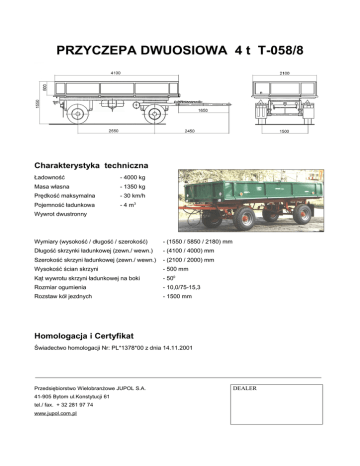 PRZYCZEPA DWUOSIOWA 4 t T-058/8 Charakterystyka techniczna Ładowność - 4000 kg Masa własna - 1350 kg Prędkość maksymalna - 30 km/h Pojemność ładunkowa - 4 m3 Wywrot dwustronny Wymiary (wysokość / długość / szerokość) - (1550 / 5850 / 2180) mm Długość skrzynki ładunkowej (zewn./ wewn.) - (4100 / 4000) mm Szerokość skrzyni ładunkowej (zewn./ wewn.) - (2100 / 2000) mm Wysokość ścian skrzyni - 500 mm Kąt wywrotu skrzyni ładunkowej na boki - 500 Rozmiar ogumienia - 10,0/75-15,3 Rozstaw kół jezdnych - 1500 mm Homologacja i Certyfikat Świadectwo homologacji Nr: PL*1378*00 z dnia 14.11.2001 Przedsiębiorstwo Wielobranżowe JUPOL S.A. 41-905 Bytom ul.Konstytucji 61 tel./ fax. + 32 281 97 74 www.jupol.com.pl DEALER