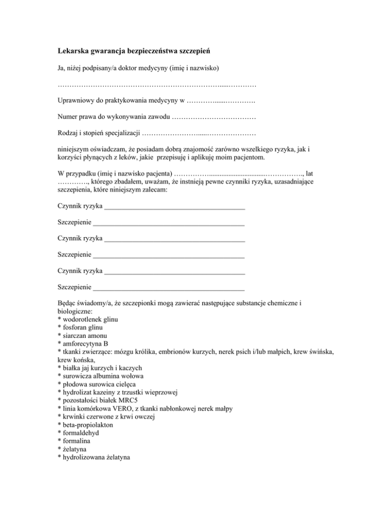 Lekarska gwarancja bezpieczeństwa szczepień Ja, niżej podpisany/a doktor medycyny (imię i nazwisko) …………………………………………………………….....………… Uprawniowy do praktykowania medycyny w …………......…………. Numer prawa do wykonywania zawodu ……………………………… Rodzaj i stopień specjalizacji …………………….....………………… niniejszym oświadczam, że posiadam dobrą znajomość zarówno wszelkiego ryzyka, jak i korzyści płynących z leków, jakie przepisuję i aplikuję moim pacjentom. W przypadku (imię i nazwisko pacjenta) ……………................................……………., lat …………., którego zbadałem, uważam, że instnieją pewne czynniki ryzyka, uzasadniające szczepienia, które niniejszym zalecam: Czynnik ryzyka ________________________________________ Szczepienie ___________________________________________ Czynnik ryzyka ________________________________________ Szczepienie ___________________________________________ Czynnik ryzyka ________________________________________ Szczepienie ___________________________________________ Będąc świadomy/a, że szczepionki mogą zawierać następujące substancje chemiczne i biologiczne: * wodorotlenek glinu * fosforan glinu * siarczan amonu * amforecytyna B * tkanki zwierzące: mózgu królika, embrionów kurzych, nerek psich i/lub małpich, krew świńska, krew końska, * białka jaj kurzych i kaczych * surowicza albumina wołowa * płodowa surowica cielęca * hydrolizat kazeiny z trzustki wieprzowej * pozostałości białek MRC5 * linia komórkowa VERO, z tkanki nabłonkowej nerek małpy * krwinki czerwone z krwi owczej * beta-propiolakton * formaldehyd * formalina * żelatyna * hydrolizowana żelatyna * glicerol * ludzkie komórki diploidalne pochodzące z abortowanych płodów * tiomersal/metriolat * glutaminian monosodowy (MSG) * neomycyna * siarczan neomycyny * czerwień fenolowa * 2-Fenoksyetanol * dwufosforan potasu * monofosforan potasu * polimyksyna B * polisorbat 20 * polisorbat 80 * sorbitol * fosforan tributylu niniejszym deklaruję, że wyżej wymienione substancje, po podaniu ich pacjentowi drogą iniekcji, nie stanowią żadnego zagrożenia dla jego zdrowia i życia. Oświadczam też, że zapoznałem/łam się z badaniami przeciwnymi, np. o tym, że tiomersal (związek zawierający rtęć), może wywoływać poważne uszkodzenia neurologiczne oraz immunologiczne, i stwierdzam, że raporty te nie są wiarygodne. Wiem, że niektóre szczepionki okazały się być zanieczyszczone wirusem SV40, który jest przez niektórych badaczy wiązany przyczynowo z występowaniem chłoniaka nieziarniczego i międzybłoniaków u ludzi jak również u zwierząt doświadczalnych. Niniejszym gwarantuję, że szczepionki, których używam w mojej praktyce, nie zawierają SV40 lub innych żywych wirusów. Gwarantuję też, że szczepionki, które rekomenduję pacjentowi (imię i nazwisko) ………………………………………………, nie zawierają żadnych tkanek/komórek abortowanych płodów ludzkich. Celem zabezpieczenia zdrowia mojego pacjenta, podjąłem/podjęłam odpowiednie kroki, aby zagwarantować, że szczepionki, których używam, nie zawierają żadnych szkodliwych dla zdrowia substancji. Podjęte starania: ______________________________________________________________________________ ______________________________________________________________________________ ______________________________________________________________________________ ______________________________________________________________________________ ________________________________________________ Osobiście przestudiowałem/łam raporty zawarte w bazie danych niepożądanych odczynów poszczepiennych VAERS i oświadczam, że zgodnie z moją zawodową opinią, podanie zalecanych przeze mnie szczepionek dzieciom w wieku poniżej 5 roku życia jest bezpieczne. Miejscowość, data ………......................................……………….. Podpis lekarza ………………....................................……………..