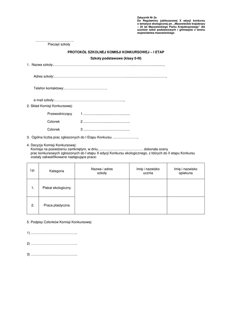 Załącznik Nr 2a Do Regulaminu jubileuszowej X edycji konkursu o tematyce ekologicznej pn. „Mazowieckie krajobrazy – 25 lat Mazowieckiego Parku Krajobrazowego” dla uczniów szkół podstawowych i gimnazjów z terenu województwa mazowieckiego ……………………………. Pieczęć szkoły PROTOKÓŁ SZKOLNEJ KOMISJI KONKURSOWEJ – I ETAP Szkoły podstawowe (klasy 0-III) 1. Nazwa szkoły:…………………………………………………………....................................., Adres szkoły:…………………………………………………….............................................., Telefon kontaktowy:…………………………….…, e-mail szkoły:……………………………………….…………...., 2. Skład Komisji Konkursowej: Przewodniczący 1 ................................................. Członek 2 ................................................. Członek 3 ................................................. 3. Ogólna liczba prac zgłoszonych do I Etapu Konkursu …………………., 4. Decyzja Komisji Konkursowej: Komisja na posiedzeniu zamkniętym, w dniu………………….……………… dokonała oceny prac konkursowych zgłoszonych do I etapu X edycji Konkursu ekologicznego, z których do II etapu Konkursu zostały zakwalifikowane następujące prace: Lp. Kategoria 1. Plakat ekologiczny 2. Praca plastyczna Nazwa i adres szkoły 5. Podpisy Członków Komisji Konkursowej: 1) ………………………………….. 2) ………………………………….. 3) ………………………………….. Imię i nazwisko ucznia Imię i nazwisko opiekuna Załącznik Nr 2b Do Regulaminu jubileuszowej X edycji konkursu o tematyce ekologicznej pn. „Mazowieckie krajobrazy – 25 lat Mazowieckiego Parku Krajobrazowego” dla uczniów szkół podstawowych i gimnazjów z terenu województwa mazowieckiego ……………………………. Pieczęć szkoły PROTOKÓŁ SZKOLNEJ KOMISJI KONKURSOWEJ – I ETAP Szkoły podstawowe (klasy IV-VI) 1. Nazwa szkoły:…………………………………………………………....................................., Adres szkoły:…………………………………………………….............................................., Telefon kontaktowy:…………………………….…, e-mail szkoły:……………………………………….…………...., 2. Skład Komisji Konkursowej: Przewodniczący 1 ................................................. Członek 2 ................................................. Członek 3 ................................................. 3. Ogólna liczba prac zgłoszonych do I Etapu Konkursu …………………., 4. Decyzja Komisji Konkursowej: Komisja na posiedzeniu zamkniętym, w dniu………………….……………… dokonała oceny prac konkursowych zgłoszonych do I etapu X edycji Konkursu ekologicznego, z których do II etapu Konkursu zostały zakwalifikowane następujące prace: Lp. Kategoria 1. Plakat ekologiczny 2. Album ukazujący piękno mazowieckich krajobrazów Nazwa i adres szkoły 5. Podpisy Członków Komisji Konkursowej: 1) ………………………………….. 2) ………………………………….. 3) ………………………………….. Imię i nazwisko ucznia Imię i nazwisko opiekuna Załącznik Nr 2c Do Regulaminu jubileuszowej X edycji konkursu o tematyce ekologicznej pn. „Mazowieckie krajobrazy – 25 lat Mazowieckiego Parku Krajobrazowego” dla uczniów szkół podstawowych i gimnazjów z terenu województwa mazowieckiego ……………………………. Pieczęć szkoły PROTOKÓŁ SZKOLNEJ KOMISJI KONKURSOWEJ – I ETAP Gimnazjum (klasy I-III) 1. Nazwa szkoły:…………………………………………………………....................................., Adres szkoły:…………………………………………………….............................................., Telefon kontaktowy:…………………………….…, e-mail szkoły:……………………………………….…………...., 2. Skład Komisji Konkursowej: Przewodniczący 1 ................................................. Członek 2 ................................................. Członek 3 ................................................. 3. Ogólna liczba prac zgłoszonych do I Etapu Konkursu …………………., 4. Decyzja Komisji Konkursowej: Komisja na posiedzeniu zamkniętym, w dniu………………….……………… dokonała oceny prac konkursowych zgłoszonych I etapu X edycji Konkursu ekologicznego,z których do II etapu Konkursu zostały zakwalifikowane następujące prace: Lp. Kategoria 1. Plakat ekologiczny 2. Reportaż dotyczący ochrony walorów przyrodniczych, kulturowych i turystycznych Nazwa i adres szkoły 5. Podpisy Członków Komisji Konkursowej: 1) ………………………………….. 2) ………………………………….. 3) ………………………………….. Imię i nazwisko ucznia Imię i nazwisko opiekuna Załącznik Nr 3a Do Regulaminu jubileuszowej X edycji konkursu o tematyce ekologicznej pn. „Mazowieckie krajobrazy – 25 lat Mazowieckiego Parku Krajobrazowego” dla uczniów szkół podstawowych i gimnazjów z terenu województwa mazowieckiego ……………………………. Pieczęć Delegatury PROTOKÓŁ KOMISJI KONKURSOWEJ II ETAPU Szkoły podstawowe (klasy 0–III) 1. Nazwa Delegatury: ……………………………………………………....................................., Adres Delegatury: ……………………………………………….............................................., Telefon kontaktowy:…………………………….…, e-mail Delegatury:……………………………………….…………...., 2. Skład Komisji Konkursowej: Przewodniczący 1 ................................................. Członek 2 ................................................. Członek 3 .....