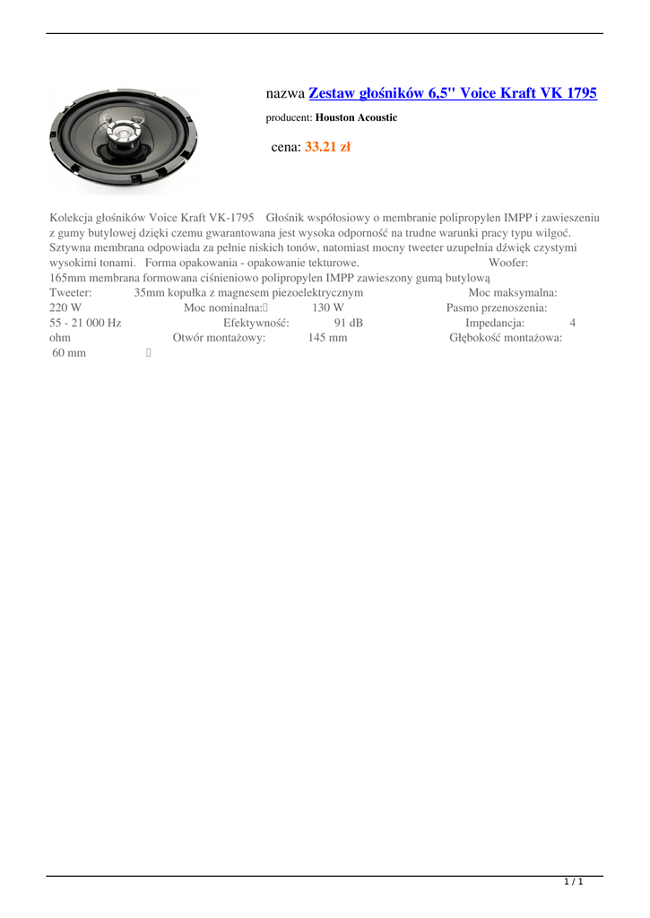 nazwa Zestaw głośników 6,5" Voice Kraft VK 1795 producent: Houston Acoustic cena: 33.21 zł Kolekcja głośników Voice Kraft VK-1795 Głośnik współosiowy o membranie polipropylen IMPP i zawieszeniu z gumy butylowej dzięki czemu gwarantowana jest wysoka odporność na trudne warunki pracy typu wilgoć. Sztywna membrana odpowiada za pełnie niskich tonów, natomiast mocny tweeter uzupełnia dźwięk czystymi wysokimi tonami. Forma opakowania - opakowanie tekturowe. Woofer: 165mm membrana formowana ciśnieniowo polipropylen IMPP zawieszony gumą butylową Tweeter: 35mm kopułka z magnesem piezoelektrycznym Moc maksymalna: 220 W Moc nominalna: 130 W Pasmo przenoszenia: 55 - 21 000 Hz Efektywność: 91 dB Impedancja: 4 ohm Otwór montażowy: 145 mm Głębokość montażowa: 60 mm 1/1