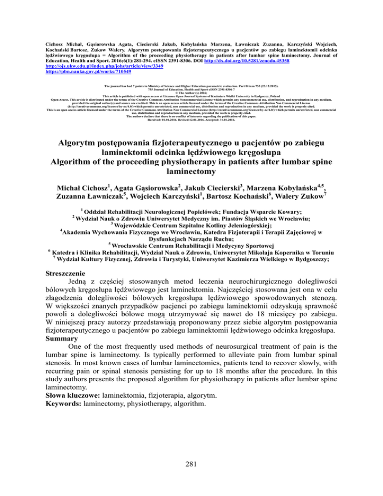 Cichosz Michał, Gąsiorowska Agata, Ciecierski Jakub, Kobylańska Marzena, Ławniczak Zuzanna, Karczyński Wojciech, Kochański Bartosz, Zukow Walery. Algorytm postępowania fizjoterapeutycznego u pacjentów po zabiegu laminektomii odcinka lędźwiowego kręgosłupa = Algorithm of the proceeding physiotherapy in patients after lumbar spine laminectomy. Journal of Education, Health and Sport. 2016;6(1):281-294. eISSN 2391-8306. DOI http://dx.doi.org/10.5281/zenodo.45358 http://ojs.ukw.edu.pl/index.php/johs/article/view/3349 https://pbn.nauka.gov.pl/works/710549 The journal has had 7 points in Ministry of Science and Higher Education parametric evaluation. Part B item 755 (23.12.2015). 755 Journal of Education, Health and Sport eISSN 2391-8306 7 © The Author (s) 2016; This article is published with open access at Licensee Open Journal Systems of Kazimierz Wielki University in Bydgoszcz, Poland Open Access. This article is distributed under the terms of the Creative Commons Attribution Noncommercial License which permits any noncommercial use, distribution, and reproduction in any medium, provided the original author(s) and source are credited. This is an open access article licensed under the terms of the Creative Commons Attribution Non Commercial License (http://creativecommons.org/licenses/by-nc/4.0/) which permits unrestricted, non commercial use, distribution and reproduction in any medium, provided the work is properly cited. This is an open access article licensed under the terms of the Creative Commons Attribution Non Commercial License (http://creativecommons.org/licenses/by-nc/4.0/) which permits unrestricted, non commercial use, distribution and reproduction in any medium, provided the work is properly cited. The authors declare that there is no conflict of interests regarding the publication of this paper. Received: 01.01.2016. Revised 12.01.2016. Accepted: 31.01.2016. Algorytm postępowania fizjoterapeutycznego u pacjentów po zabiegu laminektomii odcinka lędźwiowego kręgosłupa Algorithm of the proceeding physiotherapy in patients after lumbar spine laminectomy Michał Cichosz1, Agata Gąsiorowska2, Jakub Ciecierski3, Marzena Kobylańska4,5, Zuzanna Ławniczak5, Wojciech Karczyński1, Bartosz Kochański6, Walery Zukow7 1 Oddział Rehabilitacji Neurologicznej Popielówek; Fundacja Wsparcie Kowary; Wydział Nauk o Zdrowiu Uniwersytet Medyczny im. Piastów Śląskich we Wrocławiu; 3 Wojewódzkie Centrum Szpitalne Kotliny Jeleniogórskiej; 4 Akademia Wychowania Fizycznego we Wrocławiu, Katedra Fizjoterapii i Terapii Zajęciowej w Dysfunkcjach Narządu Ruchu; 5 Wrocławskie Centrum Rehabilitacji i Medycyny Sportowej 6 Katedra i Klinika Rehabilitacji, Wydział Nauk o Zdrowiu, Uniwersytet Mikołaja Kopernika w Toruniu 7 Wydział Kultury Fizycznej, Zdrowia i Turystyki, Uniwersytet Kazimierza Wielkiego w Bydgoszczy; 2 Streszczenie Jedną z częściej stosowanych metod leczenia neurochirurgicznego dolegliwości bólowych kręgosłupa lędźwiowego jest laminektomia. Najczęściej stosowana jest ona w celu złagodzenia dolegliwości bólowych kręgosłupa lędźwiowego spowodowanych stenozą. W większości znanych przypadków pacjenci po zabiegu laminektomii odzyskują sprawność powoli a dolegliwości bólowe mogą utrzymywać się nawet do 18 miesięcy po zabiegu. W niniejszej pracy autorzy przedstawiają proponowany przez siebie algorytm postępowania fizjoterapeutycznego u pacjentów po zabiegu laminektomii lędźwiowego odcinka kręgosłupa. Summary One of the most frequently used methods of neurosurgical treatment of pain is the lumbar spine is laminectomy. Is typically performed to alleviate pain from lumbar spinal stenosis. In most known cases of lumbar laminectomies, patients tend to recover slowly, with recurring pain or spinal stenosis persisting for up to 18 months after the procedure. In this study authors presents the proposed algorithm for physiotherapy in patients after lumbar spine laminectomy. Słowa kluczowe: laminektomia, fizjoterapia, algorytm. Keywords: laminectomy, physiotherapy, algorithm. 281 Wstęp. Zmiany zwyrodnieniowe w odcinku lędźwiowym kręgosłupa obserwuje się już u osób po dwudziestym roku życia, jednak największe nasilenie osiągają w piątej dekadzie życia. W młodszym wieku przyjmują one najczęściej charakter niemy klinicznie jednak z czasem nieodzownie zaczynają towarzyszą im ból oraz ubytkowe objawy neurologiczne. Z uwagi na stale zwiększające się średnie przeżycie, liczba osób cierpiących z powodu zmian zwyrodnieniowych będzie stale rosła stawiając coraz większe wyzwania światu fizjoterapii oraz neurochirurgii [1]. Charakter oraz umiejscowienie zmian zwyrodnieniowych stwierdzonych w badaniach radiologicznych oraz neuroradiologicznych nie zawsze korelują ze zmianami neurologicznymi oraz nasileniem dolegliwości pacjenta. Sytuacja taka powoduje iż odnotowane duże zmiany degeneracyjne zarówno krążka międzykręgowego jak i elementów kostnych kręgosłupa mogą dawać skąpe objawy neurologiczne, a w przypadku nieznacznych zmian zwyrodnieniowych powodować uporczywy ból i znaczne ubytkowe objawy neurologiczne [2]. W momencie kiedy leczenie zachowawcze w postaci fizjoterapii nie przynosi zadowalającego rezultatu podejmowana jest decyzja o leczeniu operacyjnym [3]. Aktualnie przyjmuje się że do leczenia chirurgicznego kwalifikowani są chorzy z dużym bólem 8-10 w skali VAS, ubytkowymi objawami neurologicznymi nieustępującymi po leczeniu zachowawczym obejmującym farmakoterapię oraz fizjoterapię trwającą przez okres co najmniej trzech miesięcy [4]. Aktualnie stosowane są różne techniki operacyjne w zależności od nasilenia zmian klinicznych oraz charakteru obrazu radiologicznego, z nie zawsze zadowalającą skutecznością [5]. Jednym z typów zabiegów o największym charakterze resekcji jest obarczająca laminektomia dająca zadowalające wyniki w 62% do 70% przypadków [6]. Stosowana jest on
