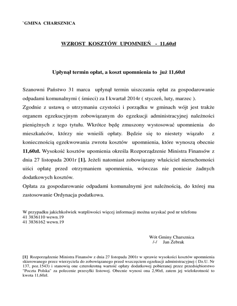 `GMINA CHARSZNICA WZROST KOSZTÓW UPOMNIEŃ - 11,60zł Upłynął termin opłat, a koszt upomnienia to już 11,60zł Szanowni Państwo 31 marca upłynął termin uiszczania opłat za gospodarowanie odpadami komunalnymi ( śmieci) za I kwartał 2014r ( styczeń, luty, marzec ). Zgodnie z ustawą o utrzymaniu czystości i porządku w gminach wójt jest trakże organem egzekucyjnym zobowiązanym do egzekucji administracyjnej należności pieniężnych z tego tytułu. Wkrótce będę zmuszony wystosować upomnienia do mieszkańców, którzy nie wnieśli opłaty. Będzie się to niestety wiązało z koniecznością egzekwowania zwrotu kosztów upomnienia, które wynoszą obecnie 11,60zł. Wysokość kosztów upomienia określa Rozporządzenie Ministra Finansów z dnia 27 listopada 2001r [1]. Jeżeli natomiast zobowiązany właściciel nieruchomości uiści opłatę przed otrzymaniem upomnienia, wówczas nie poniesie żadnych dodatkowych kosztów. Opłata za gospodarowanie odpadami komunalnymi jest należnością, do której ma zastosowanie Ordynacja podatkowa. W przypadku jakichkolwiek watpliwości więcej informacji można uzyskać pod nr telefonu 41 3836110 wewn.19 41 3836162 wewn.19 Wót Gminy Charsznica /-/ Jan Żebrak [1] Rozporządzenie Ministra Finansów z dnia 27 listopada 2001r w sprawie wysokości kosztów upomnienia skierowanego przez wierzyciela do zobowiązanego przed wszczęciem egzekucji administracyjnej ( Dz.U. Nr 137, poz.1543) i stanowią one czterokrotną wartość opłaty dodatkowej pobieranej przez przedsiębiorstwo "Poczta Polska" za polecenie przesyłki listowej. Obecnie wynosi ona 2,90zł, zatem jej wielokrotność to kwota 11,60zł.
