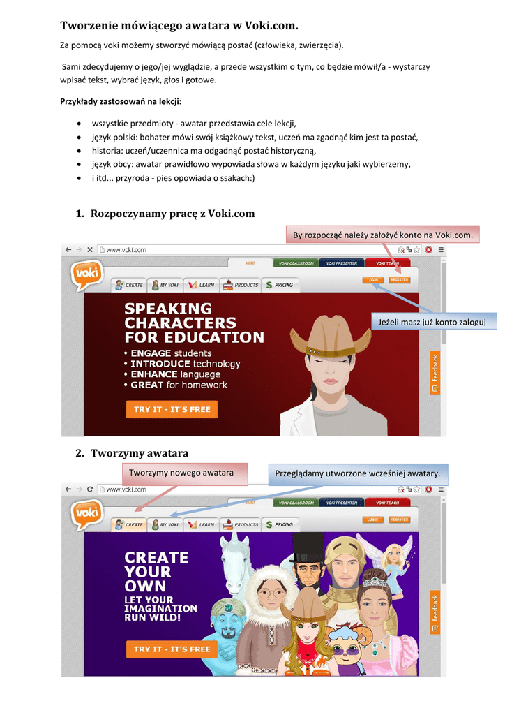 Tworzenie mówiącego awatara w Voki.com. Za pomocą voki możemy stworzyć mówiącą postać (człowieka, zwierzęcia). Sami zdecydujemy o jego/jej wyglądzie, a przede wszystkim o tym, co będzie mówił/a - wystarczy wpisać tekst, wybrać język, głos i gotowe. Przykłady zastosowań na lekcji: wszystkie przedmioty - awatar przedstawia cele lekcji, język polski: bohater mówi swój książkowy tekst, uczeń ma zgadnąć kim jest ta postać, historia: uczeń/uczennica ma odgadnąć postać historyczną, język obcy: awatar prawidłowo wypowiada słowa w każdym języku jaki wybierzemy, i itd... przyroda - pies opowiada o ssakach:) 1. Rozpoczynamy pracę z Voki.com By rozpocząć należy założyć konto na Voki.com. Jeżeli masz już konto zaloguj 2. Tworzymy awatara Tworzymy nowego awatara Przeglądamy utworzone wcześniej awatary. Wybieramy i dostosujemy postać. Dajemy głos dla postaci. Kończymy pracę. Publikujemy awatara. 2.1 Wybór postaci. Postać można dostosować do swoich potrzeb. 2.2 Głos może zostać dodany poprzez nagranie, Wpisanie tekstu, lub wczytanie pliku. 2.3 Należy dopasować tło do postaci. 2.4 Dopasowanie kolorystyki ramki do awatara. 2.5 Publikacja awatara. Wymagane jest nazwanie postaci. 3. Wykorzystanie awatara w praktyce. Moje Voki Publikowanie awatara na innych stronach. Wybieramy rozmiar Możemy skopiować i wkleić link do naszego awatara. innych stronach. Możemy kopiując i wklejając w odpowiednie miejsce, osadzić awatara na swojej stronie internetowej lub blogu 3.1 Przykład stworzenia własnej strony z awatarem. 1. Wklejam kod z Voki.com do notatnika. 2. Wybieram opcję zapisz jako. 3. Plik zapisuje jako *.html ( znak * oznacza dowolną nazwę pliku). Uwaga. By poprawnie zapisać stronę html należy wybrać rodzaj pliku: Wszystkie pliki 4. Po uruchomieniu pliku w przeglądarce pojawi się nasz awatar.