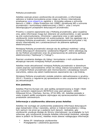 zbieranych przez Astellas za pośrednictwem niniejszej Strony internetowej