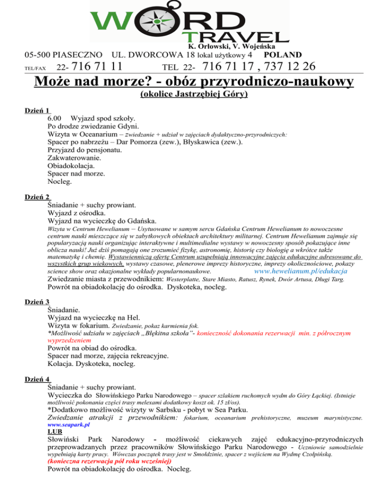 05-500 PIASECZNO TEL/FAX 22- 716 71 K. Orłowski, V. Wojeńska UL. DWORCOWA 18 lokal użytkowy 4 POLAND 11 TEL 22- 716 71 17 , 737 12 26 Może nad morze? - obóz przyrodniczo-naukowy (okolice Jastrzębiej Góry) Dzień 1 6.00 Wyjazd spod szkoły. Po drodze zwiedzanie Gdyni. Wizyta w Oceanarium – zwiedzanie + udział w zajęciach dydaktyczno-przyrodniczych: Spacer po nabrzeżu – Dar Pomorza (zew.), Błyskawica (zew.). Przyjazd do pensjonatu. Zakwaterowanie. Obiadokolacja. Spacer nad morze. Nocleg. Dzień 2 Śniadanie + suchy prowiant. Wyjazd z ośrodka. Wyjazd na wycieczkę do Gdańska. Wizyta w Centrum Hewelianum – Usytuowane w samym sercu Gdańska Centrum Hewelianum to nowoczesne centrum nauki mieszczące się w zabytkowych obiektach architektury militarnej. Centrum Hewelianum zajmuje się popularyzacją nauki organizując interaktywne i multimedialne wystawy w nowoczesny sposób pokazujące inne oblicza nauki! Już dziś pomagają one zrozumieć fizykę, astronomię, historię czy biologię a wkrótce także matematykę i chemię. Wystawienniczą ofertę Centrum uzupełniają innowacyjne zajęcia edukacyjne adresowane do wszystkich grup wiekowych, wystawy czasowe, plenerowe imprezy historyczne, imprezy okolicznościowe, pokazy science show oraz okazjonalne wykłady popularnonaukowe. www.hewelianum.pl/edukacja Zwiedzanie miasta z przewodnikiem: Westerplatte, Stare Miasto, Ratusz, Rynek, Dwór Artusa, Długi Targ. Powrót na obiadokolację do ośrodka. Dyskoteka, nocleg. Dzień 3 Śniadanie. Wyjazd na wycieczkę na Hel. Wizyta w fokarium. Zwiedzanie, pokaz karmienia fok. *Możliwość udziału w zajęciach „Błękitna szkoła”- konieczność dokonania rezerwacji min. z półrocznym wyprzedzeniem Powrót na obiad do ośrodka. Spacer nad morze, zajęcia rekreacyjne. Kolacja. Dyskoteka, nocleg. Dzień 4 Śniadanie + suchy prowiant. Wycieczka do Słowińskiego Parku Narodowego – spacer szlakiem ruchomych wydm do Góry Łąckiej. (Istnieje możliwość pokonania części trasy melexami dodatkowy koszt ok. 15 zł/os). *Dodatkowo możliwość wizyty w Sarbsku - pobyt w Sea Parku. Zwiedzanie atrakcji z przewodnikiem: fokarium, oceanarium prehistoryczne, muzeum marynistyczne. www.seapark.pl LUB Słowiński Park Narodowy - możliwość ciekawych zajęć edukacyjno-przyrodniczych przeprowadzanych przez pracowników Słowińskiego Parku Narodowego - Uczniowie samodzielnie wypełniają karty pracy. Wówczas początek trasy jest w Smołdzinie, spacer z wejściem na Wydmę Czołpińską. (konieczna rezerwacja pół roku wcześniej) Powrót na obiadokolację do ośrodka. Nocleg. Dzień 5 Śniadanie + suchy prowiant. Wykwaterowanie, wyjazd. W drodze powrotnej zwiedzanie zamku w Malborku. Program edukacyjny ,,Szlak zamkowych tajemnic” - Klasa szkolna staje się drużyną rycerską, która otrzymuje zadanie odnalezienia ukrytego hasła. Litery poszukiwanych słów można zdobywać na zamkowej trasie, rozwiązując szereg zagadek i wypełniając zadania stawiane przez mistrza drogi (przewodnik w stroju historycznym). Skompletowane w zamku hasło daje młodym odkrywcom malborskich tajemnic możliwość spotkania z wielkim mistrzem zakonu. Dzieci uczestniczące aktywnie w zamkowej przygodzie, uzyskują wiele informacji o twierdzy nad Nogatem, zakonie krzyżackim, Królestwie Polskim i kulturze wieków średnich (ok. 2h). * Możliwość dokupienia pizzy z napojem + 10zł/os lub obiadu + 20zł/os. Wyjazd. ok 20.00-21.00 -20.30 powrót pod szkołę. KOLEJNOŚĆ ZWIEDZANIA MOŻE ULEC ZMIANIE Świadczenia: - transport lux autokarem marki, np. Mercedes, Volvo, Scania, MAN, Neoplan z WC, DVD, barkiem, uchylnymi siedzeniami - zakwaterowanie w hotelu, pensjonacie, ośrodku wypoczynkowym, pokoje z łazienkami lub studio - wyżywienie zgodnie z programem - realizacja programu turystycznego - opieka pilota - ubezpieczenie NW 5000 zł - VAT - grupy 30 os. - 2 miejsca gratis dla nauczycieli, od 30 do 45 os. – 3 miejsca gratis dla nauczycieli Cena: 570 zł /min. 40 os. - max. 45 os. płacących 620 zł /min. 35 os. - max. 39 os. płacących 670 zł /min. 30 os. - max. 34 os. płacących + dodatkowo bilety wstępu i przewodnicy miejscowi od 110 do 140 zł/os. (w zależności od wybranych punktów programu) +Możliwość dokupienia posiłku ostatniego dnia wycieczki :pizza z napojem + 10zł/os lub obiad + 20zł/os. Standardowy rozmiar naszych autokarów to 49 miejsc (do dyspozycji grupy wraz z opiekunami). Na Państwa życzenie możemy zarezerwować autokary 57-70 miejsc (w tym przypadku prosimy o kontakt z biurem w celu sprawdzenia kalkulacji na ponadstandardowy pojazd i jego dostępności w wybranym przez Państwa terminie). W celu podpisania umowy i rezerwacji konkretnego terminu prosimy o telefon do biura 022 716 71 11 lub 022 716 71 17 lub mail [email protected] Zaliczka konieczna do podpisania umowy 200 zł/os. Ze względu na szczyt sezonu wycieczek szkolnych w miesiącach maj-czerwiec sugerujemy dokonanie rez. wstępnej na czas zebrania zaliczek! KWOTĘ NA BILETY WSTĘPU POTWIERDZAMY PRZED DOPŁATĄ ZGODNIE Z OBOWIĄZUJĄCYMI CENNIKAMI Wyciąg z warunków uczestnictwa imprez turystycznych organizowanych przez B.P. Word Travel (pełna wersja warunków uczestnictwa dostępna jest u nauczyciela organizującego wycieczkę): 13. W przypadku rezygnacji lub nie uczestniczenia Uczestnika w wykupionej imprezie Organizator uprawniony jest do potrącenia RZECZYWIŚCIE PONIESIONYCH KOSZTÓW. 14. Zmiana uczestnika nie pociąga za sobą kosztów finansowych. 18. Uczestnik odpowiada za wszelkie szkody materialne wyrządzone w trakcie trwania imprezy (zniszczenia w hotelu, autokarze) 15. Jeżeli w programie jest wyjazd poza granicę Polski - uczestnik winien posiadać na miejscu zbiórki aktualnie obowiązujące dokumenty uprawniające do przekroczenia granic krajów objętych programem imprezy (wyłącznie dowód osobisty lub paszport ważny min. 6 m-cy od daty powrotu). 9 B. W przypadku chorób uznawanych za przewlek
