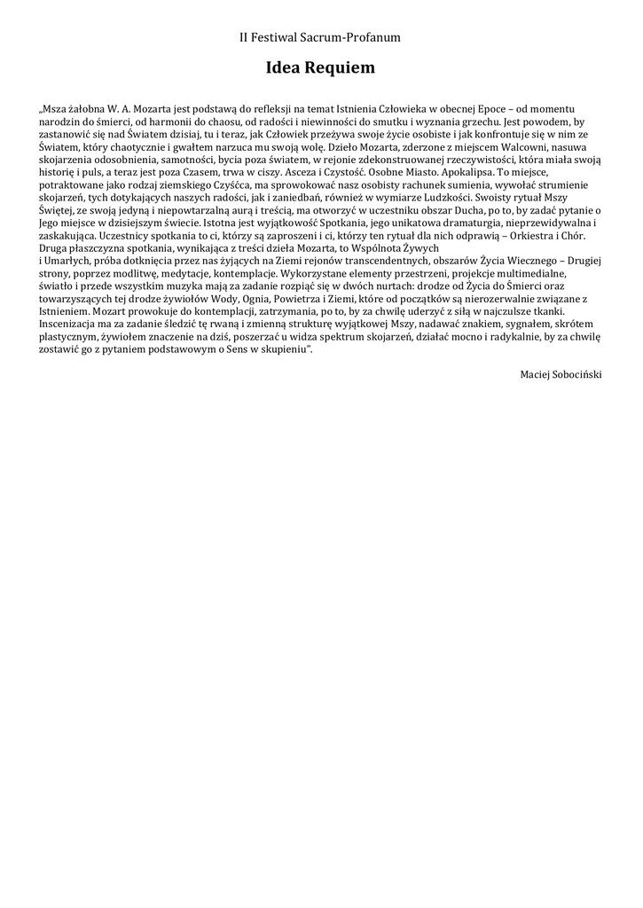 II Festiwal Sacrum-Profanum Idea Requiem „Msza żałobna W. A. Mozarta jest podstawą do refleksji na temat Istnienia Człowieka w obecnej Epoce – od momentu narodzin do śmierci, od harmonii do chaosu, od radości i niewinności do smutku i wyznania grzechu. Jest powodem, by zastanowić się nad Światem dzisiaj, tu i teraz, jak Człowiek przeżywa swoje życie osobiste i jak konfrontuje się w nim ze Światem, który chaotycznie i gwałtem narzuca mu swoją wolę. Dzieło Mozarta, zderzone z miejscem Walcowni, nasuwa skojarzenia odosobnienia, samotności, bycia poza światem, w rejonie zdekonstruowanej rzeczywistości, która miała swoją historię i puls, a teraz jest poza Czasem, trwa w ciszy. Asceza i Czystość. Osobne Miasto. Apokalipsa. To miejsce, potraktowane jako rodzaj ziemskiego Czyśćca, ma sprowokować nasz osobisty rachunek sumienia, wywołać strumienie skojarzeń, tych dotykających naszych radości, jak i zaniedbań, również w wymiarze Ludzkości. Swoisty rytuał Mszy Świętej, ze swoją jedyną i niepowtarzalną aurą i treścią, ma otworzyć w uczestniku obszar Ducha, po to, by zadać pytanie o Jego miejsce w dzisiejszym świecie. Istotna jest wyjątkowość Spotkania, jego unikatowa dramaturgia, nieprzewidywalna i zaskakująca. Uczestnicy spotkania to ci, którzy są zaproszeni i ci, którzy ten rytuał dla nich odprawią – Orkiestra i Chór. Druga płaszczyzna spotkania, wynikająca z treści dzieła Mozarta, to Wspólnota Żywych i Umarłych, próba dotknięcia przez nas żyjących na Ziemi rejonów transcendentnych, obszarów Życia Wiecznego – Drugiej strony, poprzez modlitwę, medytacje, kontemplacje. Wykorzystane elementy przestrzeni, projekcje multimedialne, światło i przede wszystkim muzyka mają za zadanie rozpiąć się w dwóch nurtach: drodze od Życia do Śmierci oraz towarzyszących tej drodze żywiołów Wody, Ognia, Powietrza i Ziemi, które od początków są nierozerwalnie związane z Istnieniem. Mozart prowokuje do kontemplacji, zatrzymania, po to, by za chwilę uderzyć z siłą w najczulsze tkanki. Inscenizacja ma za zadanie śledzić tę rwaną i zmienną strukturę wyjątkowej Mszy, nadawać znakiem, sygnałem, skrótem plastycznym, żywiołem znaczenie na dziś, poszerzać u widza spektrum skojarzeń, działać mocno i radykalnie, by za chwilę zostawić go z pytaniem podstawowym o Sens w skupieniu”. Maciej Sobociński