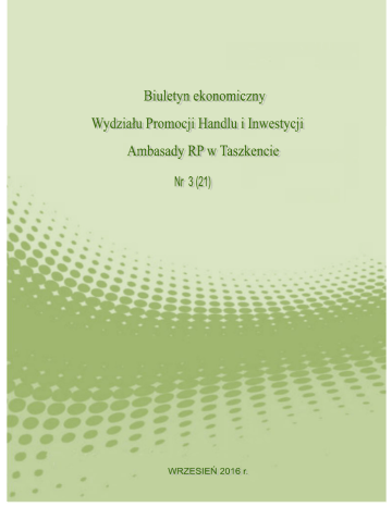 1 Spis treści I. Sytuacja społeczno-gospodarcza Uzbekistanu w I półroczu 2016 r. str. 3 II. Sytuacja społeczno-gospodarcza Tadżykistanu w I półroczu 2016 r. str. 8 III. Informacje bieżące str. 11 · · · · · · · · · · · Informacja nt. zatwierdzenia wykazu towarów wwożonych czasowo do Uzbekistanu, zwolnionych z opłat celnych i podatkowych, Informacja nt. przedłużenia przez Rosję embarga na artykuły rolno-spożywcze, Informacja nt. współpracy uzbekistańsko-chińskiej, Informacja nt. ograniczeń w korzystaniu z kart płatniczych przez obywateli Uzbekistanu, Informacja nt. wprowadzenie kontroli przesyłek pocztowych i kurierskich w Uzbekistanie, Informacja nt. uzbekistańskich ograniczeń na wwóz bydła z krajów ościennych, Informacja nt. tworzenia strefy wolnego handlu na granicy tadżykistańsko-chińskiej, Informacja nt. nowego wykazu wyrobów medycznych dopuszczonych do stosowania w RU, Informacja nt. zmian w wykazie sprzętu wwożonego do Uzbekistanu na zasadach ulgowych, Informacja nt. eksportu uzbekistańskich płodów rolnych, Informacja nt. budowy stacji fotowoltaicznych w Uzbekistanie. 2 I. Sytuacja społeczno-gospodarcza w I półroczu Uzbekistanu 2016 roku (dane oficjalne) 1. Produkt Krajowy Brutto Wg danych Państwowego Komitetu ds. Statystyki, w I półroczu 2016 roku PKB Uzbekistanu osiągnął poziom 83.966,3 mld UZS, a jego wzrost wyniósł 7,8%. Wg oficjalnego kursu na koniec czerwca 2016 r. gdzie 1 USD = 2.943,46 UZS, PKB wyniósł ok. 28.526,39 mln USD. 79,1% PKB wygenerował sektor niepaństwowy, a 20,9% – sektor państwowy. W strukturze PKB 11,4% stanowiły podatki na towary, 88,6% - wartość dodana sektorów przemysłu, z czego 57,6% w usługach, 33,6% - w przemyśle i budownictwie, 8,8% - w rolnictwie, gospodarce leśnej i rybołówstwie. W przekroju terytorialnym największy wzrost PKB odnotowano w Republice Karakalpakstanu (dynamika 121,2%), Taszkencie (111,4%), obwodzie Samarkandzkim (110,2%) i Dżyzakskim (109,5%), najmniejszy – w obwodzie Andiżańskim (95,5%) i Chorezmskim (103,7%). Największy wzrost PKB per capita odnotowano w Republice Karakalpakstanu (119,3%) i w Taszkencie (110,3%), najmniejszy – w obwodzie Andiżańskim (93,7%) i Chorezmskim (101,8%). Uwzględniając liczbę ludności Uzbekistanu na dzień 1.07.2016 r. (31.807 tys. osób – wstępne dane), dochód narodowy na osobę w pierwszym półroczu 2016 r. wynosił ok. 896 USD. 2. Budżet Państwa W informatorze statystycznym dane nie zostały opublikowane. Wg informacji Ministerstwa Finansów RU (opublikowana na www.uzdaily.uz/articles-id-29555.htm) budżet Uzbekistanu w I półroczu 2016 r. został zrealizowany z proficytem w wysokości 60,7 mld UZS, dochody budżetu w tym okresie przekroczyły 19,105 trl UZS, a wydatki – 19,044 trl UZS. Około 9,783 trl UZS pochodziło z podatków pośrednich, 4,735 trl UZS – z podatków bezpośrednich i 2,447 trl UZS – z płatności od zasobów oraz z podatków majątkowych. Wydatki na cele socjalne wyniosły 11,389 trl UZS, na gospodarkę - przekroczyły 1,791 trl UZS, a na finansowanie zcentrolizowanych inwestycji – 1,06 trl UZS. 3. Zadłużenie zagraniczne Oficjalnie dane dotyczące zadłużenia zagranicznego nie są publikowane. 4. Inflacja Oficjalnie dane dotyczące inflacji zostały opublikowane tylko częściowo. W okresie styczeń – czerwiec 2016 r. w porównania do grudnia 2015 r. ceny artykułów konsumpcyjnych wzrosły o 2,5%. Natomiast według danych Europejskiego Banku Odbudowy i Rozwoju inflacja w Uzbekistanie w całym 2016 r. wyniesie 9% (https://www.uzdaily.uz/articles-id-28596.htm). Ceny producentów produkcji przemysłowej w I pólroczu br. wzrosły o 8,9% (w I-II 2015 r. – 5%). Największy wpływ na wzrost cen producentów produkcji przemysłowej miał wzrost w produkcji niemetalicznych produktów mineralnych (dynamika 139,4%), w produkcji napojów (120,6%), w produkcji wyrobów metalowych, z wyłączeniem maszyn i urządzeń (118,9%), w przemyśle urządzień elektrycznych (117,7%), w przemyśle spożywczym (107,8%), w produkcji wyrobów tekstylnych (106,8%), w przemyśle chemicznym (106%). Największy wzrost cen dotyczył usług: finansowych (dynamika 121,2%), usług najmu (117,1%), usług komunalnych (116,6%), ochrony zdrowia (115,7%), napraw i obsługi sprzętu technologicznego (114,7%), handlu (114,1%), łączności i informatycznych (111,4%), usług indywidualnych (113,9%), usług w zakresie architektury i inżynierii, badań technicznych i analiz (112,6%) oraz transportowych (109,1%). 5. Bezrobocie i dochody ludności a/ Liczba osób zarejestrowanych w urzędach pracy jako osoby poszukujące pracy wynosiła na koniec czerwca 2016 r. 5,8 tys. (w czerwcu 2015 r. – 5,2 tys. osób, 2014 r. – 9,4 tys.). W okresie I półrocza 2016 r. liczba osób poszukujących pracy wynosiła (liczona zgodnie z Rozporządzeniem 3 Rady Ministrów RU nr. 106 z dn. 24.05.2007 r.) 725,1 tys. osób, czyli 5,2% ludności aktywnej zawodowo. Łączna liczba ludności Uzbekistanu wynosiła na dzień 1.07.2016 r. 31.807 tys. osób. Liczba osób zatrudnionych w gospodarce narodowej Uzbekistanu wynosiła w I półroczu br. 13.191,5 tys. osób (wzrost o 1,8% w porównaniu z okresem I-VI 2015 r.). Wg wstępnych danych, w okresie sprawozdawczym do Uzbekistanu przybyło 72 tys. osób, a wyemigrowało – 84,4 tys. osób. (Migracja zarobkowa obywateli Uzbekistanu odbywa się w dalszym ciągu głównie do Rosji i Kazachstanu – WPHI; zwiększa się także zainteresowanie migracją do Europy, w tym do Polski). b/ Informacje nt. dochodów ludności Uzbekistanu w I półroczu 2016 r. w „Przeglądzie statystycznym RU za pierwsze półrocze 2016 roku” nie zostały opublikowane. W omawianym okresie minimalna pensja w kraju wynosiła 130.240 UZS, a minimalna emerytura – 254.730 UZS. 6. Przemysł, podmioty gospodarcze a/ Produkcja przemysłowa Uzbekistanu w okresie 6 miesięcy 2016 roku osiągnęła poziom 50.897,9 mld U
