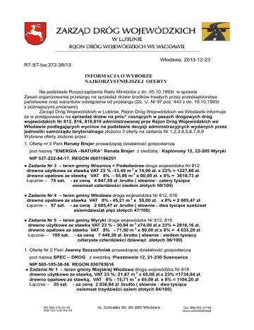 Włodawa, 2013-12-23 R7-ST-bw.372-38/13 INFORMACJA O WYBORZE NAJKORZYSTNIEJSZEJ OFERTY Na podstawie Rozporządzenia Rady Ministrów z dn. 05.10.1993r. w sprawie Zasad organizowania przetargu na sprzedaż drzew środków trwałych przez przedsiębiorstwa państwowe oraz warunków odstąpienia od przetargu (Dz. U. Nr 97 poz. 443 z dn. 19.10.1993r. z późniejszymi zmianami) Zarząd Dróg Wojewódzkich w Lublinie, Rejon Dróg Wojewódzkich we Włodawie informuje że w postępowaniu na sprzedaż drzew na pniu” rosnących w pasach drogowych dróg wojewódzkich Nr 812, 816, 818,819 administrowanej prze Rejon Dróg Wojewódzkich we Włodawie podlegających wycince na podstawie decyzji administracyjnych wydanych przez jednostki samorządu terytorialnego złożono 3 oferty na zadania Nr 1,2,3,4,5,6,7,8,9 Wybrane oferty złożone przez: 1. Ofertę nr 3 Pani Renaty Brejer prowadzącej działalność gospodarczą pod nazwą ”ENERGIA –NATURA” Renata Brejer z siedzibą : Kaplonosy 12, 22-205 Wyryki NIP 537-222-84-17, REGON 0601186251 ● Zadanie Nr 3 – teren gminy Wisznice + Podedwórze droga wojewódzka Nr 812 drewno użytkowe ze stawką VAT 23 % -13,49 m 3 x 74,00 zł. x 23% = 1227,86 zł. drewno opałowe ze stawką VAT 8% - 55,86 m 3 x 60,00 zł. x 8% = 3619,73 zł Łącznie – 75 szt. - za cenę 4 847,59 zł .brutto ( słownie : cztery tysiące osiemset czterdzieści siedem złotych 59/100) ● Zadanie Nr 4 – teren gminy Włodawa droga wojewódzka Nr 812, 816 drewno opałowe ze stawka VAT 8% - 45,21 m 3 x 55,00 zł. x 8% = 2 685,47 zł Łącznie – 57 szt. - za cenę 2 685,47 zł .brutto ( słownie : dwa tysiące sześćset osiemdziesiąt pięć złotych 47/100) ● Zadanie Nr 5 – teren gminy Wyryki droga wojewódzka Nr 812, 816 drewno użytkowe ze stawka VAT 23 % - 30,94 m 3 x74,00 zł.x 23% = 2816,16 zł. drewno opałowe ze stawka VAT 8% - 71,50 m 3 x 60,00 zł.x 8% = 4 633,20 zł Łącznie – 105 szt. - za cenę 7 449,36 zł .brutto ( słownie : siedem tysięcy czterysta czterdzieści dziewięć złotych 36/100) 1. Ofertę Nr 2 Pani Joanny Szczuchniak prowadzącej działalność gospodarczą pod nazwą SPEC – DROG z siedzibą :Pieszowola 12, 21-230 Sosnowica NIP 565-105-38-56 REGON 030783616 ● Zadanie Nr 1 – teren gminy Miejskiej Włodawa droga wojewódzka Nr 818 drewno użytkowe ze stawką, VAT 23 %- 21,67 m 3 x 65,08 zł.x 23% =1734,64 zł. drewno opałowe ze stawką, VAT 8% - 15,71 m 3 x 65,08 zł. x 8% = 1104,20 zł Łącznie – 35 szt. - za cenę 2 838,84 zł .brutto ( słownie : dwa tysiące osiemset trzydzieści osiem złotych 84/100) ● Zadanie Nr 2 – teren gminy Sosnowica Stary Brus droga wojewódzka Nr 819 drewno użytkowe ze stawką, VAT 23 % - 9,67 m 3 x 56,44 zł. x 23% = 671,30 zł. drewno opałowe ze stawką, VAT 8% - 37,72 m 3 x 56,44 zł. x 8% = 2 299,23 zł Łącznie – 29 szt. - za cenę 2 970,53 zł .brutto ( słownie : dwa tysiące dziewięćset siedemdziesiąt złotych 53/100) ● Zadanie Nr 6 – teren gminy Ruda Huta droga wojewódzka Nr 816 drewno opałowe ze stawka VAT 8% - 49,65 m 3 x 51,75 zł. x 8% = 2 774,94 zł Łącznie – 21 szt. - za cenę 2 774,94 zł .brutto ( słownie : dwa tysiące siedemset siedemdziesiąt cztery złote 94/100) ● Zadanie Nr 7 – teren gminy Hańsk droga wojewódzka Nr 812, drewno opałowe ze stawka VAT 8% - 22,65 m 3 x 51,75 zł. x 8% = 1 265,91 zł Łącznie – 26 szt. - za cenę 1 265,91 zł .brutto ( słownie : jeden tysiąc dwieście sześćdziesiąt pięć złotych 91/100) ● Zadanie Nr 8 – teren gminy Wola Uhruska droga wojewódzka Nr 816 drewno opałowe ze stawka VAT 8% - 2,73 m 3 x 51,75 zł. x 8% = 152,58 zł Łącznie – 4 szt. - za cenę 152,58 zł .brutto ( słownie :sto pięćdziesiąt dwa złote 58/100) ● Zadanie Nr 9 – teren gminy Sawin droga wojewódzka Nr 812, 819 drewno opałowe ze stawka VAT 8% - 7,09 m 3 x 51,75 zł. x 8% = 396,26 zł Łącznie – 18 szt. - za cenę 396,26 zł .brutto ( słownie : trzysta dziewięćdziesiąt sześć złotych 26/100) Ogółem w przetargu sprzedano 370 szt. drzew na łączną kwotę 25 381,48 zł. Ponadto wpłynęła oferta Nr 1 Firmy BIO-ENERGIA Sp. z o.o z siedzibą : Różanka 118, 22-200 Włodawa na zadanie Nr 4,5,7 z ceną niższą niż w/w oferty. Sporządził: B Winiarczyk Zatwierdził: Kierownik RDW mgr inż. M. Chwała