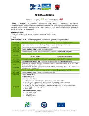 PROGRAM PIKNIKU Patronat honorowy Patronat medialny „Piknik z Naturą” to impreza plenerowa dla dzieci i młodzieŜy, nauczycieli z podopiecznymi, rodzin i wszystkich zainteresowanych tym, co dzieje się w ochronie przyrody, edukacji ekologicznej, agroturystyce i eko-Ŝywności eko Ŝywności oraz prośrodowiskowym podejściu do zbiórki surowców i odpadów. TERMIN I MIEJSCE 1 czerwca 2012 r., park wiejskii w Słońsku, godziny 10.00 – 18.00. SCENA Godzina 10.00 – 18.00 - część zęść artystyczna „uczestniczę i jestem zaangaŜowany” 10:00 -10:30 Przywitanie gości, zapoznanie z głównymi atrakcjami oraz ramowym programem pikniku 10:30 -10:45 Wprowadzenie do konkursu malarskiego „Natura w twoich oczach” , start konkursu 10:45 -11:00 Wprowadzenie do konkursu „Co to za drzewo?” , start konkursu 11:00 -11:30 Konkurs „Odgłosy Natury” - część I dla dzieci starszych 11:30 -12:00 Inscenizacja Niepublicznej Szkoły Podstawowej w Sosnach - „śyj z przyrodą w zgodzie” Rozstrzygnięcie konkursów 12:00 -12:15 „Co to za drzewo?” „Natura w twoich oczach” 12:15 -12:30 I losowanie osowanie nagród za udział w warsztatach przyrodniczych (indywidualnie / szkoły) 12:30 -13:30 Quiz wiedzy o sieci Natura 2000 – quiz prowadzi dziennikarka TVP Odeta Moro-Figurska Moro 12:50 13:30 -14:00 Informacja nt. budowy „śywego” logo Natura 2000 – uczestnicy zbierają się o 13.00 na ul. Paderewskiego przy parku wiejskim Przedstawienie teatralne przygotowane przygotowane przez Szkołę Podstawową Nr 3 w Słubicach „Skąd się wzięły lilie wodne?” 14:00 -14:15 II losowanie nagród za udział w warsztatach przyrodniczych (indywidualnie / szkoły) 14:15 -14:45 Konkurs „Odgłosy Natury” - część II dla dzieci młodszych 14:45 -15:00 Konkurs „Zgnieć PET’a” KINO EKOLOGICZNE - prezentacje tematyczne: 15:00 -18:00 • • • • • ZPK Województwa Lubuskiego – „Walory parków krajobrazowych” RDOŚ Gorzów Wielkopolski – „Siedliska Przyrodnicze województwa lubuskiego” lubuskiego Celowy Związek Gmin – „Akcje edukacyjno-ekologiczne” Park ark Narodowy Doliny Dolnej Odry Odr – „Awifauna Awifauna województwa zachodniopomorskiego gatunki ujęte w dyrektywie ptasiej” ptasie Ptaki Polski - filmy edukacyjne Dzika Polska: • • • „Lasy pełne Ŝycia” „Pełna Energii” „Badacze Badacze Natury” Natury Pokonywać granice poprzez wspólne inwestowanie w przyszłość przyszłość” / Grenzen überwinden durch gemeinsame Investition in die ZukunftProjekt współfinansowany ze środków Europejskiego Funduszu Rozwoju Regionalnegow ramach Programu Operacyjnego Współpracy Transgranicznej Polska (Województwo Lubuskie) – Brandenburgia 2007-2013, 2013, Fundusz Małych Projektów i Projekty Sieciowe Euroregionu Pro Europa Viadrina oraz z budŜetu państwa POZA SCENĄ Godzina 10.00 - 18.00 – część warsztatowa „odkrywam, poznaję, lubię, wspieram”, realizowana w sektorach tematycznych: • sektor informacji i edukacji przyrodniczej • sektor wspierania inicjatyw • sektor ekokonsumenta i wyrobów regionalnych Godzina 13.30 „śywe” logo Natura 2000 - wspólne budowanie logo Natura 2000 Uczestnicy budujący logo zbierają się o godzinie 13.00 na ul. Paderewskiego przy parku wiejskim. Na terenie parku ustawiona będzie wystawa wielkoformatowych fotografii przyrodniczych autorstwa Artura Tabora pt. „ZWIERZPOSPOLITA POLSKA”. Pokonywać granice poprzez wspólne inwestowanie w przyszłość przyszłość” / Grenzen überwinden durch gemeinsame Investition in die ZukunftProjekt współfinansowany ze środków Europejskiego Funduszu Rozwoju Regionalnegow ramach Programu Operacyjnego Współpracy Transgranicznej Polska (Województwo Lubuskie) – Brandenburgia 2007-2013, 2013, Fundusz Małych Projektów Proj i Projekty Sieciowe Euroregionu Pro Europa Viadrina oraz z budŜetu państwa
