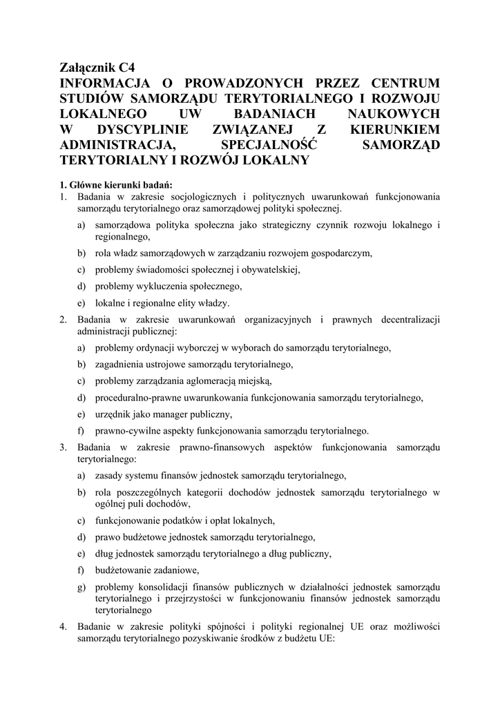 Załącznik C4 INFORMACJA O PROWADZONYCH PRZEZ CENTRUM STUDIÓW SAMORZĄDU TERYTORIALNEGO I ROZWOJU LOKALNEGO UW BADANIACH NAUKOWYCH W DYSCYPLINIE ZWIĄZANEJ Z KIERUNKIEM ADMINISTRACJA, SPECJALNOŚĆ SAMORZĄD TERYTORIALNY I ROZWÓJ LOKALNY 1. Główne kierunki badań: 1. Badania w zakresie socjologicznych i politycznych uwarunkowań funkcjonowania samorządu terytorialnego oraz samorządowej polityki społecznej. a) samorządowa polityka społeczna jako strategiczny czynnik rozwoju lokalnego i regionalnego, b) rola władz samorządowych w zarządzaniu rozwojem gospodarczym, c) problemy świadomości społecznej i obywatelskiej, d) problemy wykluczenia społecznego, e) lokalne i regionalne elity władzy. 2. Badania w zakresie uwarunkowań organizacyjnych i prawnych decentralizacji administracji publicznej: a) problemy ordynacji wyborczej w wyborach do samorządu terytorialnego, b) zagadnienia ustrojowe samorządu terytorialnego, c) problemy zarządzania aglomeracją miejską, d) proceduralno-prawne uwarunkowania funkcjonowania samorządu terytorialnego, e) urzędnik jako manager publiczny, f) 3. prawno-cywilne aspekty funkcjonowania samorządu terytorialnego. Badania w zakresie prawno-finansowych aspektów funkcjonowania samorządu terytorialnego: a) zasady systemu finansów jednostek samorządu terytorialnego, b) rola poszczególnych kategorii dochodów jednostek samorządu terytorialnego w ogólnej puli dochodów, c) funkcjonowanie podatków i opłat lokalnych, d) prawo budżetowe jednostek samorządu terytorialnego, e) dług jednostek samorządu terytorialnego a dług publiczny, f) budżetowanie zadaniowe, g) problemy konsolidacji finansów publicznych w działalności jednostek samorządu terytorialnego i przejrzystości w funkcjonowaniu finansów jednostek samorządu terytorialnego 4. Badanie w zakresie polityki spójności i polityki regionalnej UE oraz możliwości samorządu terytorialnego pozyskiwanie środków z budżetu UE: a) zasady działania systemu funduszy strukturalnych UE, b) programowanie polityki rozwoju, c) instrumenty wdrażania polityki rozwoju, d) zasady, tryby i kryteria podziału środków pochodzących z badań UE dla jednostek samorządu terytorialnego e) krajowe instrumenty wspierania polityki rozwoju regionalnego. 5. Badania dotyczące systemów kontroli, nadzoru i audytu w funkcjonowaniu jednostek samorządu terytorialnego: a) kryteria i zakresy kontroli i nadzoru nad działalnością jednostek samorządu terytorialnego, b) zakres i treść audytu w odniesieniu do gospodarki finansowej jednostek samorządu terytorialnego, c) oceny skuteczności systemów kontrolnych i nadzorczych w państwie. 6. Problemy przestrzennego zagospodarowania kraju i główne problemy gospodarki zasobami: a) rola organów jednostek samorządu terytorialnego w planowaniu przestrzennym i rozwojowa funkcja planów miejscowych, b) polityka inwestycyjna samorządów, c) gospodarowanie mieniem przez jednostki samorządu terytorialnego, d) tendencje rozwojowe planowania przestrzennego. 7. Partnerstwo publiczno-prywatne jako forma współpracy prywatnego. Samorząd a organizacje pozarządowe. samorządów i sektora 2. Informacja o działalności badawczej Poza działalnością dydaktyczną i wydawniczą Centrum prowadziło i kontynuuje własne badania naukowe, a także badania realizowane z środków przyznanych przez Komitet Badań Naukowych obecnie Ministerstwo Nauki i Informatyzacji. Projekty badawcze A) zrealizowane i przyjęte przez zleceniodawcę: 1. „Skuteczność społeczna prawnej regulacji samorządu terytorialnego (na przykładzie wybranych gmin i instytucji prawnych)”, Grant KBN nr PB 1014/P1/93/04, Projekt badawczy: P1 09 054 04 (kierownik zespołu prof. dr hab. Andrzej Piekara); 2. „Funkcjonowanie samorządu terytorialnego u progu II kadencji”. Badania ze środków własnych w 1994 roku (kierownik badań dr Elżbieta Łojko); 3. „Decentralizacja struktury administracji publicznej”. Badanie na zlecenie Konsorcjum Gmin Holenderskich VNG finansowane przez OMEGA — PHARE, projekt P1 9208-04. Badanie zrealizowano w latach 1995–1996 we współpracy z Fundacją „Wszechnica dla Gmin”. Zespołem ekspertów składającym się z 38 osób kierował prof. dr hab. Andrzej Piekara; 2 4. „Samorząd terytorialny u progu III kadencji”. Badanie w latach 1998–1999, finansowane z środków własnych Centrum (kierownik dr Elżbieta Łojko); 5. „Wpływ konstrukcji prawnych oraz rola organizacji pozarządowych w kształtowaniu rozwoju lokalnego”. Badanie w latach 1998–1999 zrealizowane we współpracy z prof. Patrickiem Baleynaud z Wydziału Prawa Uniwersytetu w Tours (kierownik badań prof. dr hab. Andrzej Piekara); 6. Badanie CSSTiRL, przeprowadzone w czwartym kwartale 1999 roku, dotyczące: a) sytuacji zawodowej (w tym awansu zawodowego, warunków materialnych pracy zawodowej, zmian korzystnych lub niekorzystnych w sytuacji zawodowej respondentów) po ukończeniu PSST i RL UW; b) rozwoju intelektualnego; c) podniesienia kwalifikacji profesjonalnych. 7. „Cele i skuteczność reformy administracji publicznej w RP w latach 1999–2001. (Analiza jakościowa na przykładzie wybranych jednostek samorządu terytorialnego)”. Projekt badawczy nr 1 H02 D001 18, umowa nr 0499/H02/2000/18, zawarta w dniu 23 maja 2000 roku pomiędzy Komitetem Badań Naukowych a prof. dr. hab. Andrzejem Piekarą — kierownikiem projektu oraz Uniwersytetem Warszawskim, Centrum Studiów Samorządu Terytorialnego i Rozwoju Lokalnego reprezentowanym przez Prorektora UW — prof. dr. hab. Wojciecha Maciejewskiego i z-cę Kwestora UW — Elżbietę Leszczyńską. Przedmiotem umowy było wykonanie projektu badawczego na wymieniony wyżej temat w terminie 1 kwietnia 2000–30 marca 2003 roku; 8. Projekt dotyczący współpracy kulturalnej i naukowej francusko-polskiej (CSSTiRL UW — reprezentant strony polskiej i Uniwersytet im. François Rabelais w Tours — reprezentant strony francuskiej). Umow