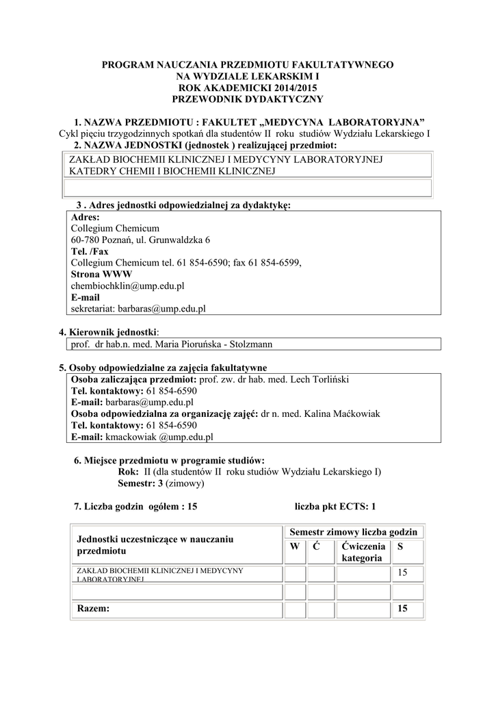 PROGRAM NAUCZANIA PRZEDMIOTU FAKULTATYWNEGO NA WYDZIALE LEKARSKIM I ROK AKADEMICKI 2014/2015 PRZEWODNIK DYDAKTYCZNY 1. NAZWA PRZEDMIOTU : FAKULTET „MEDYCYNA LABORATORYJNA” Cykl pięciu trzygodzinnych spotkań dla studentów II roku studiów Wydziału Lekarskiego I 2. NAZWA JEDNOSTKI (jednostek ) realizującej przedmiot: ZAKŁAD BIOCHEMII KLINICZNEJ I MEDYCYNY LABORATORYJNEJ KATEDRY CHEMII I BIOCHEMII KLINICZNEJ 3 . Adres jednostki odpowiedzialnej za dydaktykę: Adres: Collegium Chemicum 60-780 Poznań, ul. Grunwaldzka 6 Tel. /Fax Collegium Chemicum tel. 61 854-6590; fax 61 854-6599, Strona WWW [email protected] E-mail sekretariat: [email protected] 4. Kierownik jednostki: prof. dr hab.n. med. Maria Pioruńska - Stolzmann 5. Osoby odpowiedzialne za zajęcia fakultatywne Osoba zaliczająca przedmiot: prof. zw. dr hab. med. Lech Torliński Tel. kontaktowy: 61 854-6590 E-mail: [email protected] Osoba odpowiedzialna za organizację zajęć: dr n. med. Kalina Maćkowiak Tel. kontaktowy: 61 854-6590 E-mail: kmackowiak @ump.edu.pl 6. Miejsce przedmiotu w programie studiów: Rok: II (dla studentów II roku studiów Wydziału Lekarskiego I) Semestr: 3 (zimowy) 7. Liczba godzin ogółem : 15 Jednostki uczestniczące w nauczaniu przedmiotu ZAKŁAD BIOCHEMII KLINICZNEJ I MEDYCYNY LABORATORYJNEJ Razem: MEDYCYNY LABORATORYJNEJ liczba pkt ECTS: 1 Semestr zimowy liczba godzin W Ć Ćwiczenia S kategoria 15 15 Jednostki uczestniczące w nauczaniu przedmiotu Semestr letni liczba godzin W Ć Ćwiczenia S kategoria Razem: 8 . Cel nauczania przedmiotu Po ukończeniu zajęć fakultatywnych z „Medycyny laboratoryjnej” przyszły lekarz powinien: E.W07,E.W38 - rozumieć biochemiczne konsekwencje zaburzeń ustrojowych i znać podstawowe metody analityczne umożliwiające ich śledzenie; E.W23,E.W24,E.W38 - znać metody doboru badań laboratoryjnych w profilaktyce, rozpoznawaniu i monitorowaniu chorób cywilizacyjnych; E.W24, E.W25,E.W26 -rozumieć, że wcześnie rozpoznany rak jest uleczalny oraz zaproponować screening nowotworowy i profilaktykę antynowotworową; F.W.9 - rozumieć innowacyjną metodę diagnozowania i leczenia zaburzeń zdrowia prokreacyjnego „NaProTechnology”, opartą na obserwacjach „Creighton Model System; B.W02,B.W38 – znać wskazania do testu nietolerancji pokarmowej, wskazać składniki żywności sprzyjające zdrowiu prokreacyjnemu kobiet i mężczyzn oraz rozumieć mechanizmy stymulacji odporności naturalnej. 9.SYLABUS SYLABUS Nazwa przedmiotu/modułu Wydział Nazwa kierunku studiów Poziom kształcenia Forma studiów Język przedmiotu Medycyna laboratoryjna Lekarski I Lekarski Studia magisterskie Studia stacjonarne polski obowiązkowy Rodzaj przedmiotu Rok studiów/semestr I fakultatywny X IIX III □ IV □ V VI 1 2 3X 4 5 □ 6 7 □8 9 10 11 12 Liczba godzin zajęć dydaktycznych z podziałem na formy prowadzenia zajęć 15, w tym: Założenia i cele przedmiotu Po ukończeniu zajęć student powinien: Dokonać uzasadnionego doboru badań laboratoryjnych w profilaktyce, rozpoznawaniu i monitorowaniu różnych nowotworów, w zależności od stanu klinicznego Zaplanować postępowanie diagnostyczne dla oceny zdrowia prokreacyjnego i zinterpretować wyniki w konkretnej sytuacji klinicznej .... - wykłady, ....15 - seminaria, .... – ćwiczenia, 15 – fakultety Symbol efektów kształcenia zgodnie ze standardami OPIS KIERUNKOWYCH EFEKTÓW KSZTAŁCENIA Metody weryfikacji osiągnięcia zamierzonych efektów kształcenia: WIEDZA (ZGODNIE ZE SZCZEGÓŁOWYMI EFEKTAMI KSZTAŁCENIA) F.W1E.W 25, E.W26,E.W38 E.W24,E.W38E.WO7c F.W09 F.W09 B.W19, B.W20,E.W23 E.U16, E.U24, E.U12,E.U.24,E.U32 E.U12,E.U.24 E.U16, E.U18, E.U21, E.U24, F.U12, E.U16, E.U18, E.U21, E.U24, D.U2, D.U3, D.U8, D.U11, D.U11, D.U15,D.U16, D.U5, D.U6, D.U7, PUNKTY ECTS Zna badania laboratoryjne służące ocenie prawidłowego funkcjonowania poszczególnych układów ludzkiego organizmu (zdrowie/choroba) Zna zasady doboru badań laboratoryjnych przydatnych w rozpoznawaniu i monitorowaniu leczenia wybranych chorób nowotworowych (rak piersi, jelita grubego i stercza). Zna funkcje rozrodcze kobiety i podstawowe metody ich diagnostyki Zna i rozumie mechanizmy regulujące zdrowie prokreacyjne (cyklu miesiączkowego i jego zaburzeń oraż metody regulacji urodzeń) Zna i rozumie wpływ stylu życia, czynników fizycznych i ksenobiotyków na wyniki badań laboratoryjnych UMIEJĘTNOŚCI (ZGODNIE ZE SZCZEGÓŁOWYMI EFEKTAMI KSZTAŁCENIA) Potrafi zaplanować i przeprowadzić ocenę czynników ryzyka, a po uzyskaniu wyników badania przesiewowego podjąć decyzję o dalszym postępowaniu Potrafi interpretować wyniki badań laboratoryjnych, korelować je ze stanem klinicznym i innymi badaniami dodatkowymi w omawianych chorobach nowotworowych (rak piersi, jelita grubego i stercza) Potrafi przeprowadzić diagnostykę różnicową wybranych chorób nowotworowych w oparciu o wyniki badań dodatkowych Potrafi dobrać i interpretować zestaw badań laboratoryjnych stosowanych w rozpoznawaniu i monitorowaniu choroby nowotworowej Potrafi zaplanować postępowanie diagnostyczne dla oceny zdrowia prokreacyjnego oraz wdrożyć działania w zależności od stanu klinicznego pacjenta KOMPETENCJE SPOŁECZNE (ZGODNIE Z OGÓLNYMI EFEKTAMI KSZTAŁCENIA) Potrafi zrozumieć oraz przekazać pacjentowi korzyści i ograniczenia stosowania badań przesiewowych w profilaktyce chorób nowotworowych Potrafi zorganizować współpracę specjalistów w programie badań przesiewowych oraz w procesie diagnozowania i leczenia chorób nowotworowych. Potrafi zorganizować współpracę specjalistów i pacjentki w programie badań dotyczących zdrowia prokreacyjnego. Potrafi rozwijać potrzebę samokształcenia i zdolność pracy zespołowej Posiada umiejętności komunikowania się z pacjentem w zakresie sytuacji trudnych . Test wiedzy- analiza przypadków klinicznych j/w j/w j/w j/w Ocena procesu- ocena formująca Analiza przypadku klinicznego – ocena 