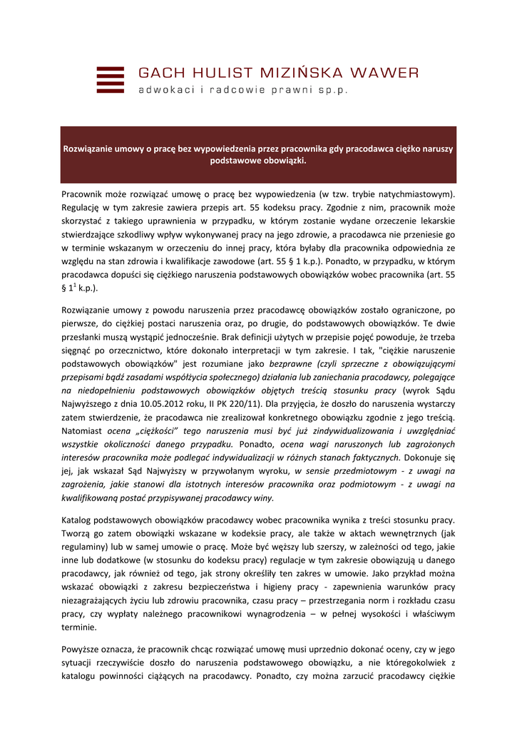 Rozwiązanie umowy o pracę bez wypowiedzenia przez pracownika gdy pracodawca ciężko naruszy podstawowe obowiązki. Pracownik może rozwiązać umowę o pracę bez wypowiedzenia (w tzw. trybie natychmiastowym). Regulację w tym zakresie zawiera przepis art. 55 kodeksu pracy. Zgodnie z nim, pracownik może skorzystać z takiego uprawnienia w przypadku, w którym zostanie wydane orzeczenie lekarskie stwierdzające szkodliwy wpływ wykonywanej pracy na jego zdrowie, a pracodawca nie przeniesie go w terminie wskazanym w orzeczeniu do innej pracy, która byłaby dla pracownika odpowiednia ze względu na stan zdrowia i kwalifikacje zawodowe (art. 55 § 1 k.p.). Ponadto, w przypadku, w którym pracodawca dopuści się ciężkiego naruszenia podstawowych obowiązków wobec pracownika (art. 55 § 11 k.p.). Rozwiązanie umowy z powodu naruszenia przez pracodawcę obowiązków zostało ograniczone, po pierwsze, do ciężkiej postaci naruszenia oraz, po drugie, do podstawowych obowiązków. Te dwie przesłanki muszą wystąpić jednocześnie. Brak definicji użytych w przepisie pojęć powoduje, że trzeba sięgnąć po orzecznictwo, które dokonało interpretacji w tym zakresie. I tak, "ciężkie naruszenie podstawowych obowiązków" jest rozumiane jako bezprawne (czyli sprzeczne z obowiązującymi przepisami bądź zasadami współżycia społecznego) działania lub zaniechania pracodawcy, polegające na niedopełnieniu podstawowych obowiązków objętych treścią stosunku pracy (wyrok Sądu Najwyższego z dnia 10.05.2012 roku, II PK 220/11). Dla przyjęcia, że doszło do naruszenia wystarczy zatem stwierdzenie, że pracodawca nie zrealizował konkretnego obowiązku zgodnie z jego treścią. Natomiast ocena „ciężkości” tego naruszenia musi być już zindywidualizowania i uwzględniać wszystkie okoliczności danego przypadku. Ponadto, ocena wagi naruszonych lub zagrożonych interesów pracownika może podlegać indywidualizacji w różnych stanach faktycznych. Dokonuje się jej, jak wskazał Sąd Najwyższy w przywołanym wyroku, w sensie przedmiotowym - z uwagi na zagrożenia, jakie stanowi dla istotnych interesów pracownika oraz podmiotowym - z uwagi na kwalifikowaną postać przypisywanej pracodawcy winy. Katalog podstawowych obowiązków pracodawcy wobec pracownika wynika z treści stosunku pracy. Tworzą go zatem obowiązki wskazane w kodeksie pracy, ale także w aktach wewnętrznych (jak regulaminy) lub w samej umowie o pracę. Może być węższy lub szerszy, w zależności od tego, jakie inne lub dodatkowe (w stosunku do kodeksu pracy) regulacje w tym zakresie obowiązują u danego pracodawcy, jak również od tego, jak strony określiły ten zakres w umowie. Jako przykład można wskazać obowiązki z zakresu bezpieczeństwa i higieny pracy - zapewnienia warunków pracy niezagrażających życiu lub zdrowiu pracownika, czasu pracy – przestrzegania norm i rozkładu czasu pracy, czy wypłaty należnego pracownikowi wynagrodzenia – w pełnej wysokości i właściwym terminie. Powyższe oznacza, że pracownik chcąc rozwiązać umowę musi uprzednio dokonać oceny, czy w jego sytuacji rzeczywiście doszło do naruszenia podstawowego obowiązku, a nie któregokolwiek z katalogu powinności ciążących na pracodawcy. Ponadto, czy można zarzucić pracodawcy ciężkie GACH, HULIST, MIZIŃSKA, WAWER – ADWOKACI I RADCOWIE PRAWNI SP.P. naruszenie. W tym zakresie trudno o jednoznaczną odpowiedź. Tak, jak na gruncie przepisu art. 52 k.p. zezwalającego pracodawcy na rozwiązanie umowy z pracownikiem bez wypowiedzenia, tak i w tym przypadku należy wskazać na wyjątkowość (nadzwyczajność) trybu rozwiązania umowy. Uzasadnione powinno być zatem wzięcie pod uwagę m. in. tego, czy naruszenie ma miejsce po raz pierwszy, czy też pracodawca dopuszcza się go po raz kolejny, w jakim stopniu naruszenie wpływa na interesy (sytuację) pracownika, przy uwzględnieniu jego stażu pracy czy stanowiska. W odniesieniu do obowiązku wypłaty wynagrodzenia, Sąd Najwyższy (w wyroku z dnia 27.07.2012 roku, I PK 53/12) wskazał, że ocena powinna uwzględniać regulację art. 890 § 2 kodeksu postępowania cywilnego (określającego górne limity kwot, w tym wynagrodzeń, podlegających wypłacie z rachunku bankowego pracodawcy, z którego jest prowadzona egzekucja wierzytelności). Nie każde zatem naruszenie przez pracodawcę ciążącego na nim obowiązku wobec pracownika będzie uprawniało tego ostatniego do zakończenia stosunku pracy w omawianym trybie. Takie rozwiązanie umowy wymaga ponadto od pracownika spełnienia kilku wymogów formalnych. Są nimi forma - oświadczenie powinno być złożone piśmie, treść – w oświadczeniu powinna być podana przyczyna uzasadniająca rozwiązanie, termin – oświadczenie powinno być złożone w okresie jednego miesiąca od dnia, w którym pracownik dowiedział się o okoliczności uzasadniającej rozwiązanie (art. 55 § 2 k.p.). Autor: Agnieszka Śniegowska, radca prawny w Kancelarii GACH, HULIST, MIZIŃSKA, WAWER – adwokaci i radcowie prawni sp.p. (www.ghmw.pl)