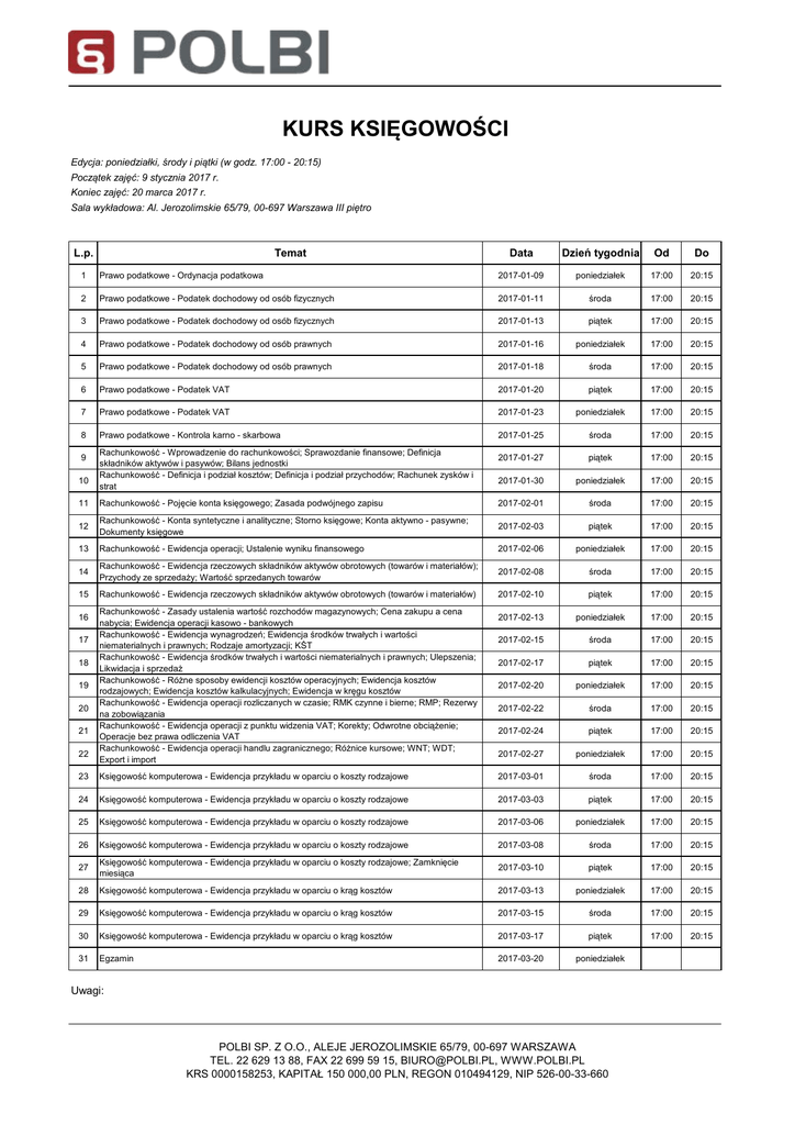 KURS KSIĘGOWOŚCI Edycja: poniedziałki, środy i piątki (w godz. 17:00 - 20:15) Początek zajęć: 9 stycznia 2017 r. Koniec zajęć: 20 marca 2017 r. Sala wykładowa: Al. Jerozolimskie 65/79, 00-697 Warszawa III piętro L.p. Temat Data Dzień tygodnia Od Do 1 Prawo podatkowe - Ordynacja podatkowa 2017-01-09 poniedziałek 17:00 20:15 2 Prawo podatkowe - Podatek dochodowy od osób fizycznych 2017-01-11 środa 17:00 20:15 3 Prawo podatkowe - Podatek dochodowy od osób fizycznych 2017-01-13 piątek 17:00 20:15 4 Prawo podatkowe - Podatek dochodowy od osób prawnych 2017-01-16 poniedziałek 17:00 20:15 5 Prawo podatkowe - Podatek dochodowy od osób prawnych 2017-01-18 środa 17:00 20:15 6 Prawo podatkowe - Podatek VAT 2017-01-20 piątek 17:00 20:15 7 Prawo podatkowe - Podatek VAT 2017-01-23 poniedziałek 17:00 20:15 8 Prawo podatkowe - Kontrola karno - skarbowa 2017-01-25 środa 17:00 20:15 2017-01-27 piątek 17:00 20:15 2017-01-30 poniedziałek 17:00 20:15 9 10 Rachunkowość - Wprowadzenie do rachunkowości; Sprawozdanie finansowe; Definicja składników aktywów i pasywów; Bilans jednostki Rachunkowość - Definicja i podział kosztów; Definicja i podział przychodów; Rachunek zysków i strat 11 Rachunkowość - Pojęcie konta księgowego; Zasada podwójnego zapisu 2017-02-01 środa 17:00 20:15 12 Rachunkowość - Konta syntetyczne i analityczne; Storno księgowe; Konta aktywno - pasywne; Dokumenty księgowe 2017-02-03 piątek 17:00 20:15 13 Rachunkowość - Ewidencja operacji; Ustalenie wyniku finansowego 2017-02-06 poniedziałek 17:00 20:15 14 Rachunkowość - Ewidencja rzeczowych składników aktywów obrotowych (towarów i materiałów); Przychody ze sprzedaży; Wartość sprzedanych towarów 2017-02-08 środa 17:00 20:15 15 Rachunkowość - Ewidencja rzeczowych składników aktywów obrotowych (towarów i materiałów) 2017-02-10 piątek 17:00 20:15 2017-02-13 poniedziałek 17:00 20:15 2017-02-15 środa 17:00 20:15 2017-02-17 piątek 17:00 20:15 2017-02-20 poniedziałek 17:00 20:15 2017-02-22 środa 17:00 20:15 2017-02-24 piątek 17:00 20:15 2017-02-27 poniedziałek 17:00 20:15 16 17 18 19 20 21 22 Rachunkowość - Zasady ustalenia wartość rozchodów magazynowych; Cena zakupu a cena nabycia; Ewidencja operacji kasowo - bankowych Rachunkowość - Ewidencja wynagrodzeń; Ewidencja środków trwałych i wartości niematerialnych i prawnych; Rodzaje amortyzacji; KŚT Rachunkowość - Ewidencja środków trwałych i wartości niematerialnych i prawnych; Ulepszenia; Likwidacja i sprzedaż Rachunkowość - Różne sposoby ewidencji kosztów operacyjnych; Ewidencja kosztów rodzajowych; Ewidencja kosztów kalkulacyjnych; Ewidencja w kręgu kosztów Rachunkowość - Ewidencja operacji rozliczanych w czasie; RMK czynne i bierne; RMP; Rezerwy na zobowiązania Rachunkowość - Ewidencja operacji z punktu widzenia VAT; Korekty; Odwrotne obciążenie; Operacje bez prawa odliczenia VAT Rachunkowość - Ewidencja operacji handlu zagranicznego; Różnice kursowe; WNT; WDT; Export i import 23 Księgowość komputerowa - Ewidencja przykładu w oparciu o koszty rodzajowe 2017-03-01 środa 17:00 20:15 24 Księgowość komputerowa - Ewidencja przykładu w oparciu o koszty rodzajowe 2017-03-03 piątek 17:00 20:15 25 Księgowość komputerowa - Ewidencja przykładu w oparciu o koszty rodzajowe 2017-03-06 poniedziałek 17:00 20:15 26 Księgowość komputerowa - Ewidencja przykładu w oparciu o koszty rodzajowe 2017-03-08 środa 17:00 20:15 27 Księgowość komputerowa - Ewidencja przykładu w oparciu o koszty rodzajowe; Zamknięcie miesiąca 2017-03-10 piątek 17:00 20:15 28 Księgowość komputerowa - Ewidencja przykładu w oparciu o krąg kosztów 2017-03-13 poniedziałek 17:00 20:15 29 Księgowość komputerowa - Ewidencja przykładu w oparciu o krąg kosztów 2017-03-15 środa 17:00 20:15 30 Księgowość komputerowa - Ewidencja przykładu w oparciu o krąg kosztów 2017-03-17 piątek 17:00 20:15 31 Egzamin 2017-03-20 poniedziałek Uwagi: POLBI SP. Z O.O., ALEJE JEROZOLIMSKIE 65/79, 00-697 WARSZAWA TEL. 22 629 13 88, FAX 22 699 59 15, [email protected], WWW.POLBI.PL KRS 0000158253, KAPITAŁ 150 000,00 PLN, REGON 010494129, NIP 526-00-33-660