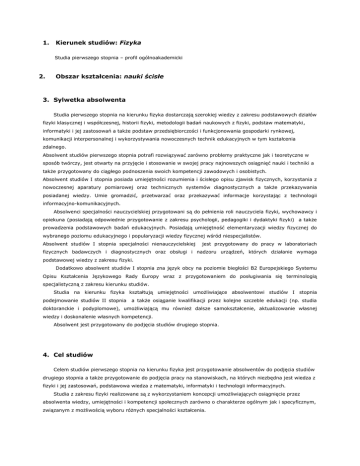 1. Kierunek studiów: Fizyka Studia pierwszego stopnia – profil ogólnoakademicki 2. Obszar kształcenia: nauki ścisłe 3. Sylwetka absolwenta Studia pierwszego stopnia na kierunku fizyka dostarczają szerokiej wiedzy z zakresu podstawowych działów fizyki klasycznej i współczesnej, historii fizyki, metodologii badań naukowych z fizyki, podstaw matematyki, informatyki i jej zastosowań a także podstaw przedsiębiorczości i funkcjonowania gospodarki rynkowej, komunikacji interpersonalnej i wykorzystywania nowoczesnych technik edukacyjnych w tym kształcenia zdalnego. Absolwent studiów pierwszego stopnia potrafi rozwiązywać zarówno problemy praktyczne jak i teoretyczne w sposób twórczy, jest otwarty na przyjęcie i stosowanie w swojej pracy najnowszych osiągnięć nauki i techniki a także przygotowany do ciągłego podnoszenia swoich kompetencji zawodowych i osobistych. Absolwent studiów I stopnia posiada umiejętności rozumienia i ścisłego opisu zjawisk fizycznych, korzystania z nowoczesnej aparatury pomiarowej oraz technicznych systemów diagnostycznych a także przekazywania posiadanej wiedzy. Umie gromadzić, przetwarzać oraz przekazywać informacje korzystając z technologii informacyjno-komunikacyjnych. Absolwenci specjalności nauczycielskiej przygotowani są do pełnienia roli nauczyciela fizyki, wychowawcy i opiekuna (posiadają odpowiednie przygotowanie z zakresu psychologii, pedagogiki i dydaktyki fizyki) a także prowadzenia podstawowych badań edukacyjnych. Posiadają umiejętność elementaryzacji wiedzy fizycznej do wybranego poziomu edukacyjnego i popularyzacji wiedzy fizycznej wśród niespecjalistów. Absolwent studiów I stopnia specjalności nienauczycielskiej jest przygotowany do pracy w laboratoriach fizycznych badawczych i diagnostycznych oraz obsługi i nadzoru urządzeń, których działanie wymaga podstawowej wiedzy z zakresu fizyki. Dodatkowo absolwent studiów I stopnia zna język obcy na poziomie biegłości B2 Europejskiego Systemu Opisu Kształcenia Językowego Rady Europy wraz z przygotowaniem do posługiwania się terminologią specjalistyczną z zakresu kierunku studiów. Studia na kierunku fizyka kształtują umiejętności umożliwiające absolwentowi studiów I stopnia podejmowanie studiów II stopnia a także osiąganie kwalifikacji przez kolejne szczeble edukacji (np. studia doktoranckie i podyplomowe), umożliwiającą mu również dalsze samokształcenie, aktualizowanie własnej wiedzy i doskonalenie własnych kompetencji. Absolwent jest przygotowany do podjęcia studiów drugiego stopnia. 4. Cel studiów Celem studiów pierwszego stopnia na kierunku fizyka jest przygotowanie absolwentów do podjęcia studiów drugiego stopnia a także przygotowanie do podjęcia pracy na stanowiskach, na których niezbędna jest wiedza z fizyki i jej zastosowań, podstawowa wiedza z matematyki, informatyki i technologii informacyjnych. Studia z zakresu fizyki realizowane są z wykorzystaniem koncepcji umożliwiających osiągnięcie przez absolwenta wiedzy, umiejętności i kompetencji społecznych zarówno o charakterze ogólnym jak i specyficznym, związanym z możliwością wyboru różnych specjalności kształcenia. Uzyskane wykształcenie daje absolwentom szansę dostosowania się do szybko zmieniającego się rynku pracy i mobilności zawodowej poprzez wykształcenie umiejętności ustawicznego uczenia się i ciągłego uzupełniania wiedzy, umiejętności i kompetencji zawodowych i osobistych a także podnoszenia kwalifikacji na kolejnych etapach edukacji. 5. Kierunkowe efekty kształcenia i ich odniesienie do kształcenia w obszarze kształcenia w zakresie nauk ścisłych Objaśnienie oznaczeń: K (przed podkreślnikiem) – kierunkowe efekty kształcenia W – kategoria wiedzy U – kategoria umiejętności K (po podkreślniku) – kategoria kompetencji społecznych X1A – efekty kształcenia w obszarze kształcenia w zakresie nauk ścisłych dla studiów pierwszego stopnia 01, 02, 03 i kolejne – numer efektu kształcenia Nazwa kierunku: Fizyka Stopień studiów: pierwszy Profil: ogólno akademicki Symbol Odniesienie do Kierunkowe efekty kształcenia efektu kierunkowego efektów obszarowych STUDENT WIEDZA K_W01 zna metodę naukową stosowaną w badaniach w dziedzinie fizyki X1A_W01 K_W02 zna wkład i znaczenie osiągnięć X1A_W01 w dziedzinie fizyki w poznanie świata i postęp cywilizacyjny K_W03 zna rolę teorii i eksperymentu w badaniach w dziedzinie fizyki X1A_W01 K_W04 zna podstawowe fakty i pojęcia z dziedziny nauk fizycznych, X1A_W01 matematycznych i przyrodniczych K_W05 wykazuje się znajomością podstawowych koncepcji, zasad i teorii X1A_W01 fizycznych K_W06 zna historię rozwoju fizyki X1A_W01 K_W07 zna podstawy analizy matematycznej, algebry i geometrii w zakresie X1A_W02 koniecznym do opisu zagadnień fizyki teoretycznej i eksperymentalnej K_W08 zna podstawy logiki matematycznej, rachunku prawdopodobieństwa X1A_W02 i teorii równań różniczkowych w zakresie umożliwiającym modelowanie procesów fizycznych K_W09 zna podstawy statystyki matematycznej w zakresie umożliwiającym X1A_W02 opracowanie danych pomiarowych i prezentacji uzyskanych wyników K_W10 zna podstawowe metody matematyczne stosowane w fizyce X1A_W02 K_W11 zna podstawowe pojęcia i twierdzenia matematyczne konieczne do X1A_W03 opisu zjawisk i procesów fizycznych w języku matematyki K_W12 potrafi opisać zjawiska i procesy fizyczne oraz prawidłowości, którym X1A_W03 podlegają, za pomocą języka i formalizmu matematycznego K_W13 zna podstawowe numeryczne metody obliczeniowe X1A_W04 K_W14 zna wybrane języki programowania X1A_W04 K_W15 analizuje działanie i poprawność prostych programów X1A_W04 K_W16 zna zasady programowania strukturalnego X1A_W04 K_W17 posiada podstawową wiedzę z zakresu systemów operacyjnych, sieci X1A_W04 komputerowych, baz danych i architektury sprzętu i prostych urządzeń pomiarowych K_W18 zna podstawowe pakiety op